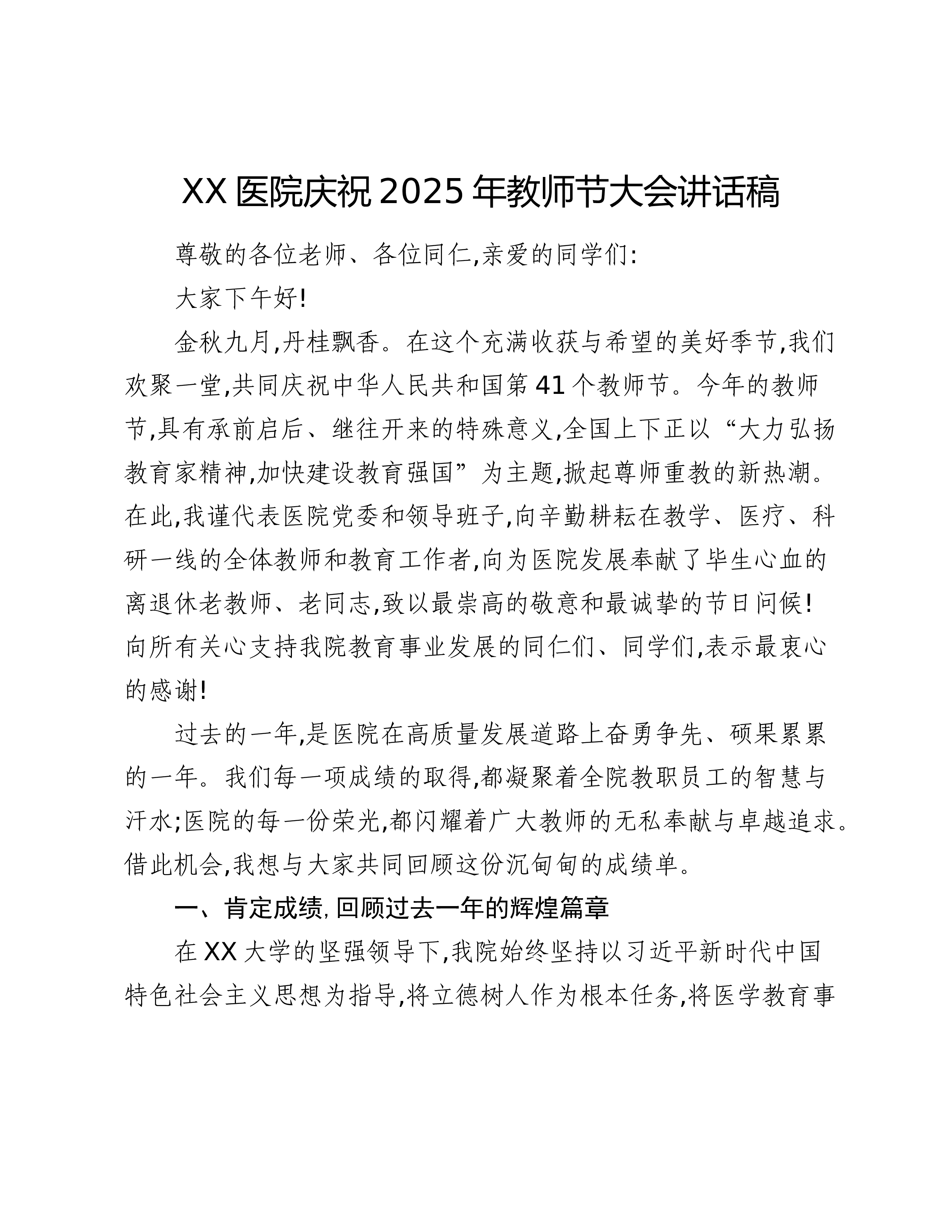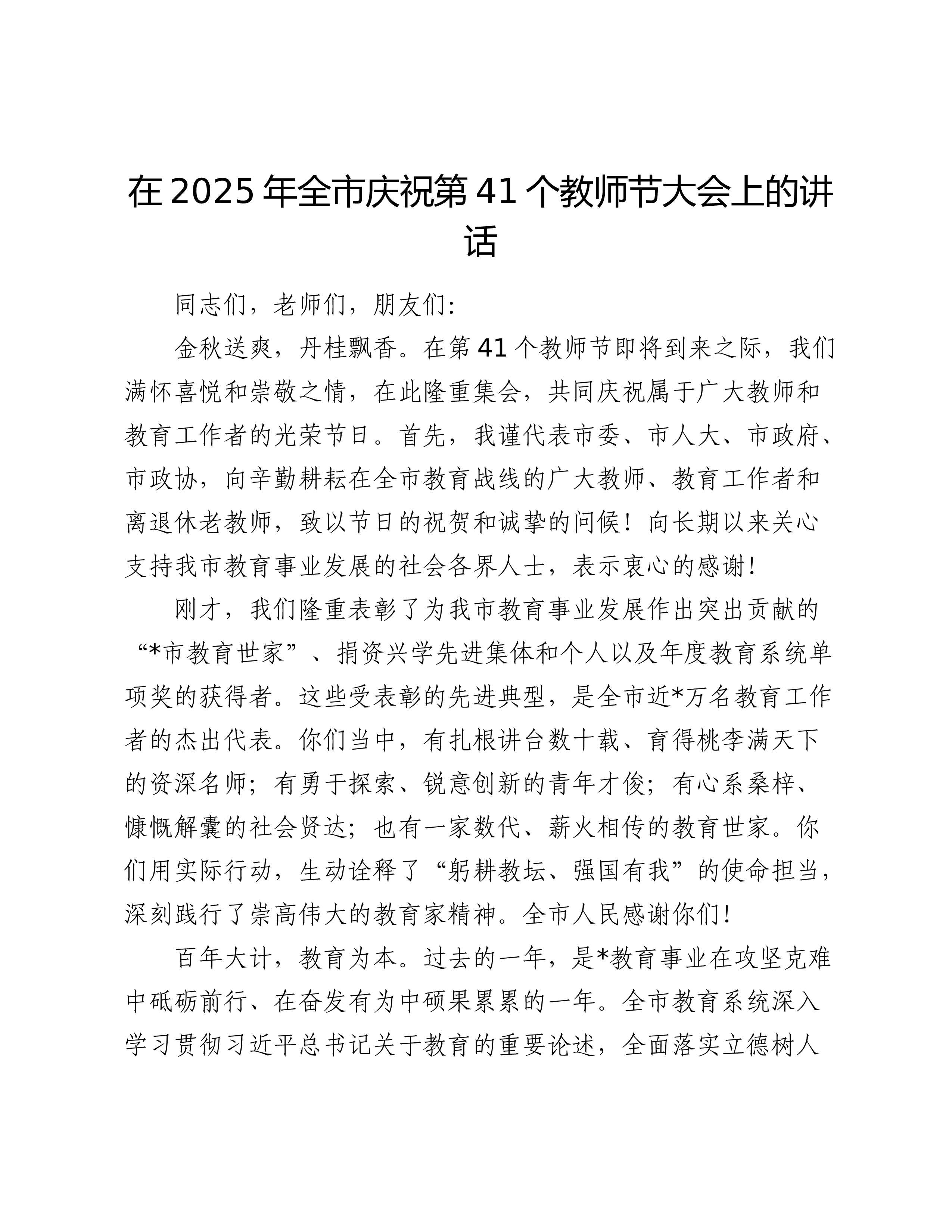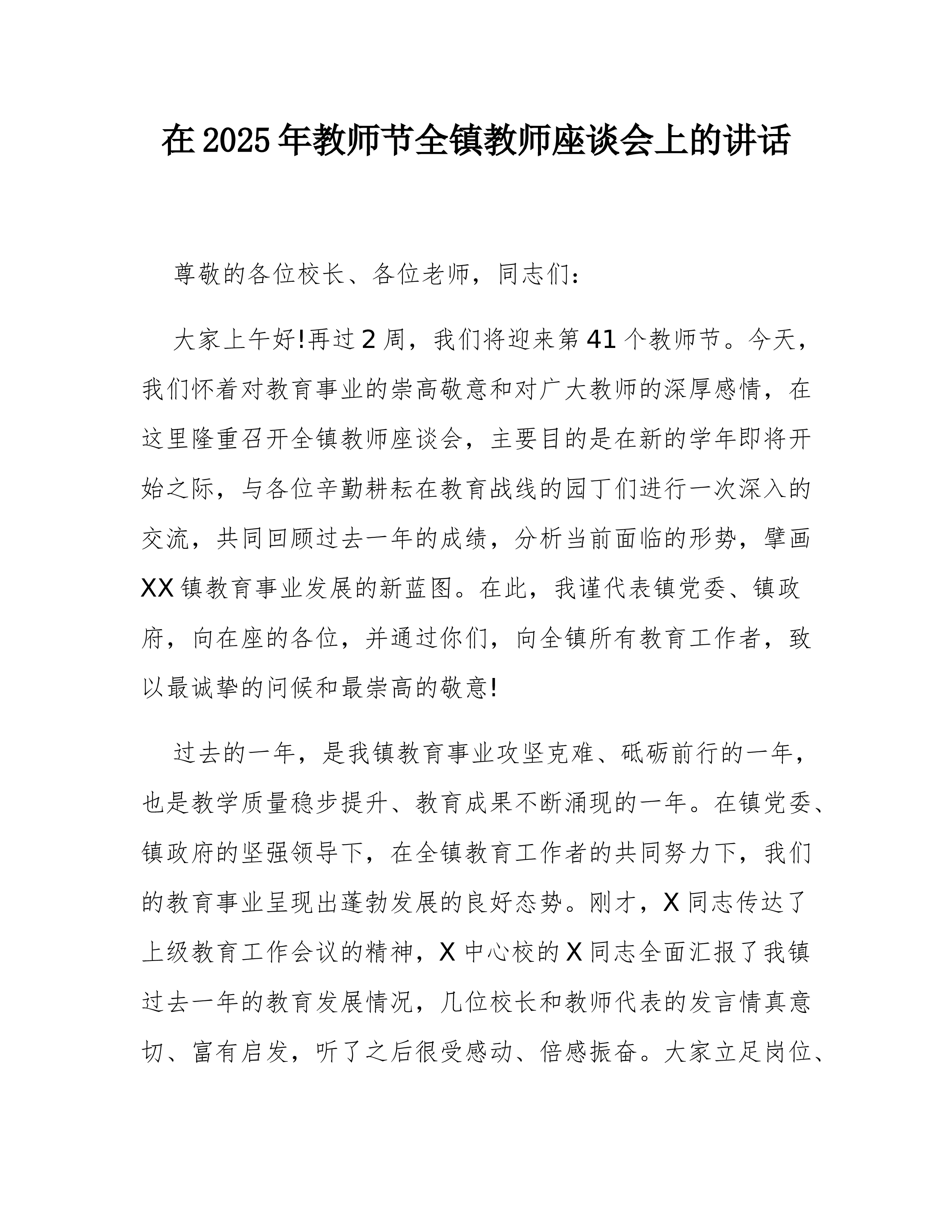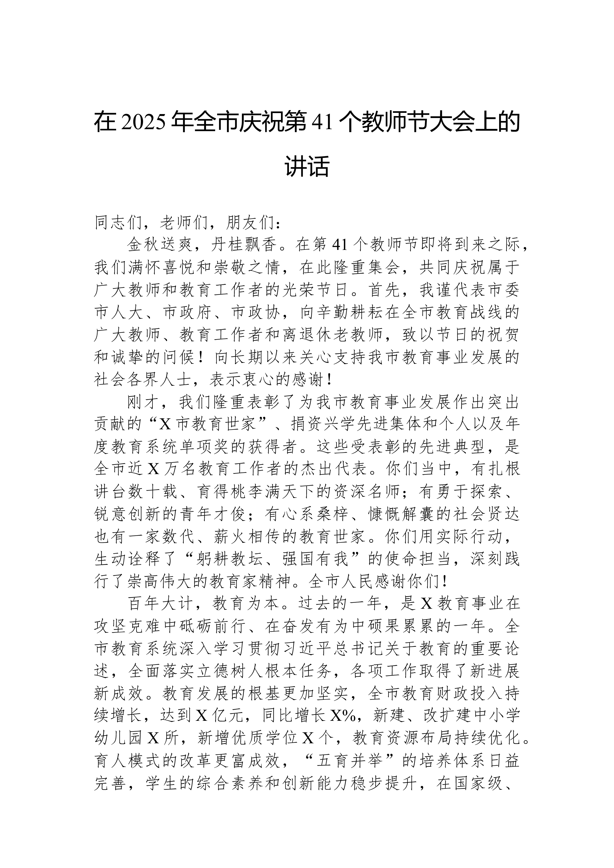 在XX县XX乡庆祝第41个教师节大会上的讲话尊敬的XX县教育局的各位领导、同志们,各位校长、老师们,各村的负责同志们:大家好!金秋送爽,丹桂飘香。在这充满喜悦与希望的收获季节里,我们满怀无比崇敬的心情,在此地隆重集会,共同庆祝第41个教师节的到来。首先,我谨代表XX乡党委、政府,向莅临指导的县教育局各位领导表示热烈的欢迎和衷心的感谢!向长期以来辛勤耕耘、默默奉献在XX乡教育战线上的全体教师、教育工作者致以节日的祝贺和诚挚的问候!向今天即将受到表彰的先进单位和优秀个人表示崇高的敬意!同时,也向一直以来关心、支持我乡教育事业发展的各村负责人及社会各界人士,表示最深切的感谢!百年大计,教育为本;教育大计,教师为本。一个地方的发展,短期靠项目,中期靠政策,长期靠人才,根本在教育。回顾过去的一学年,是...