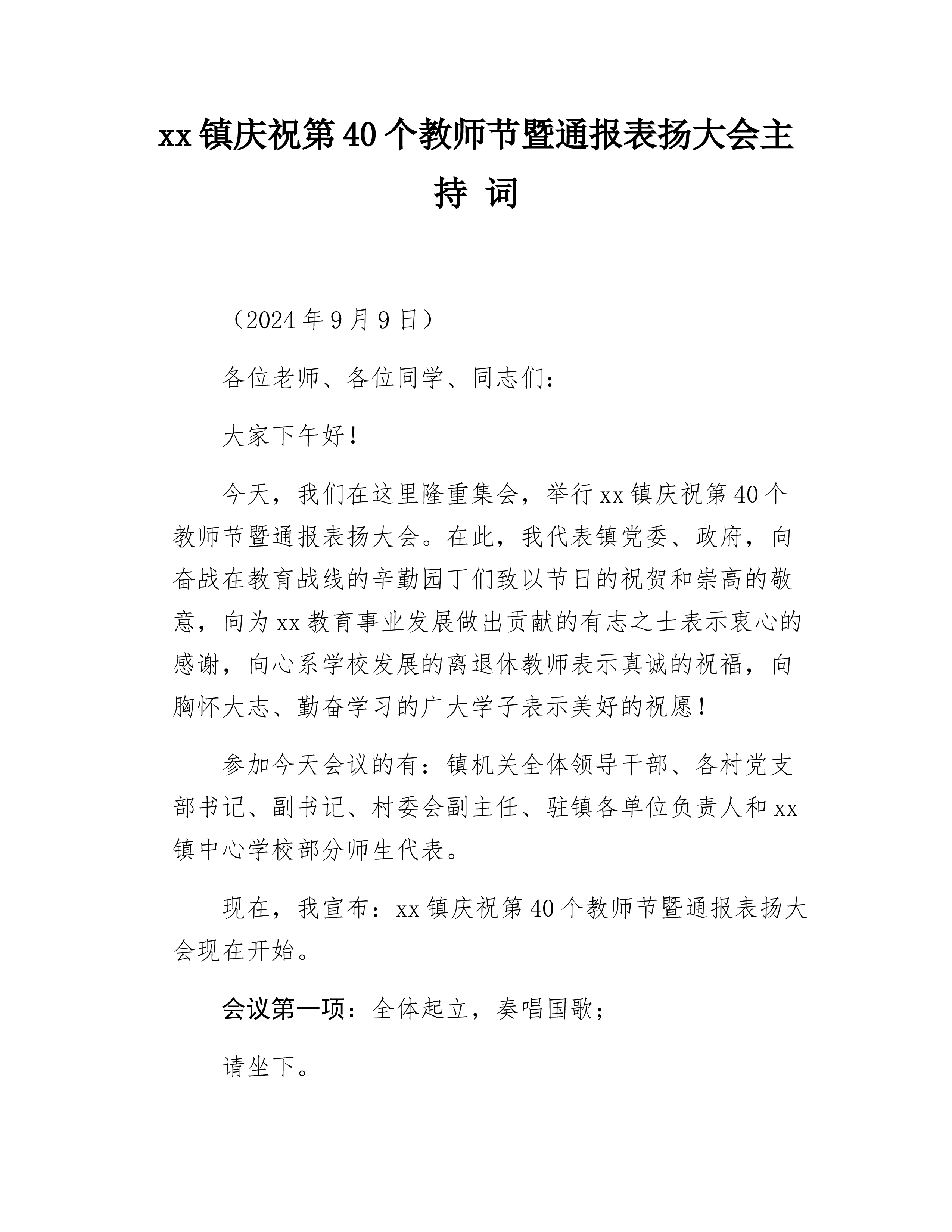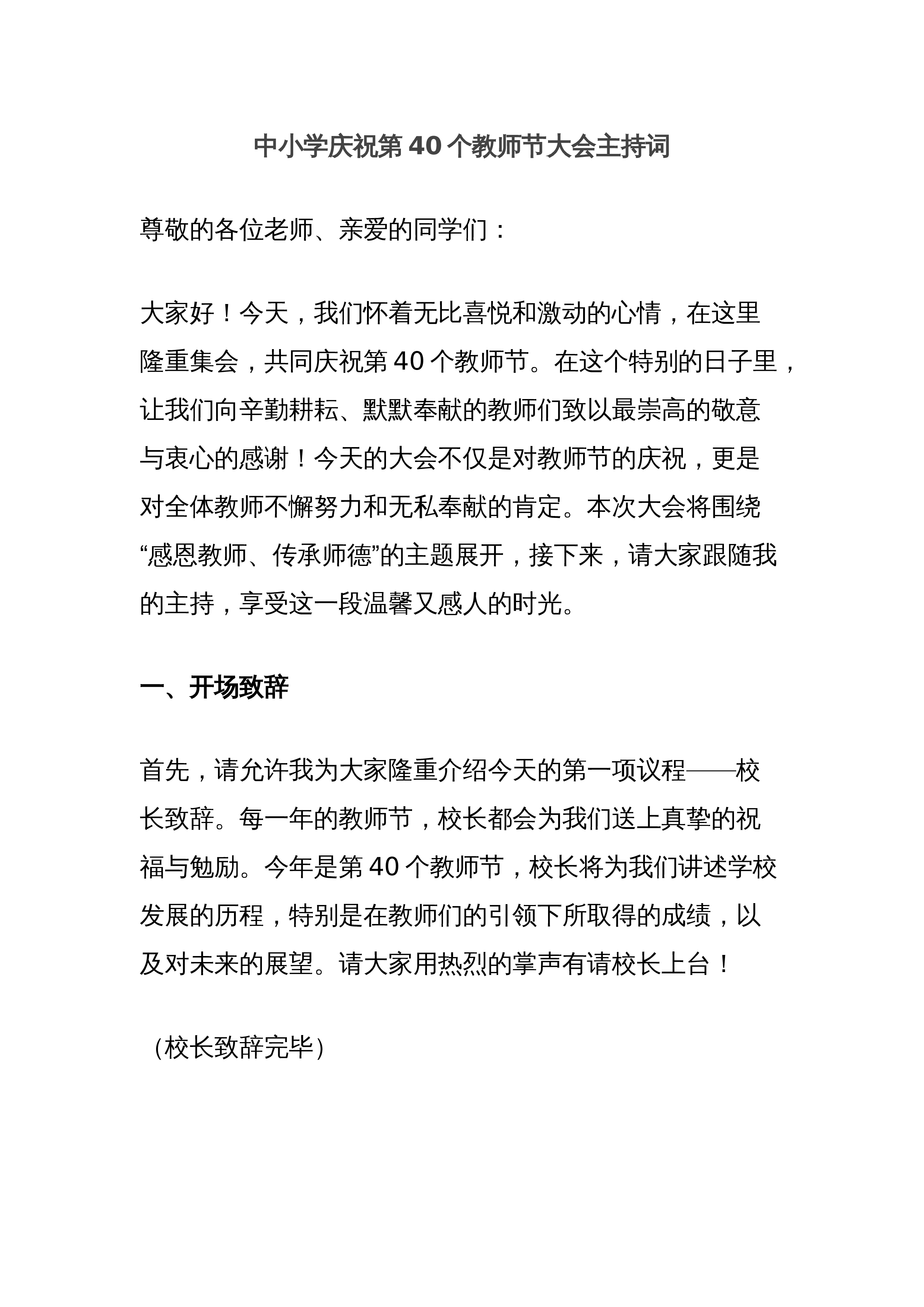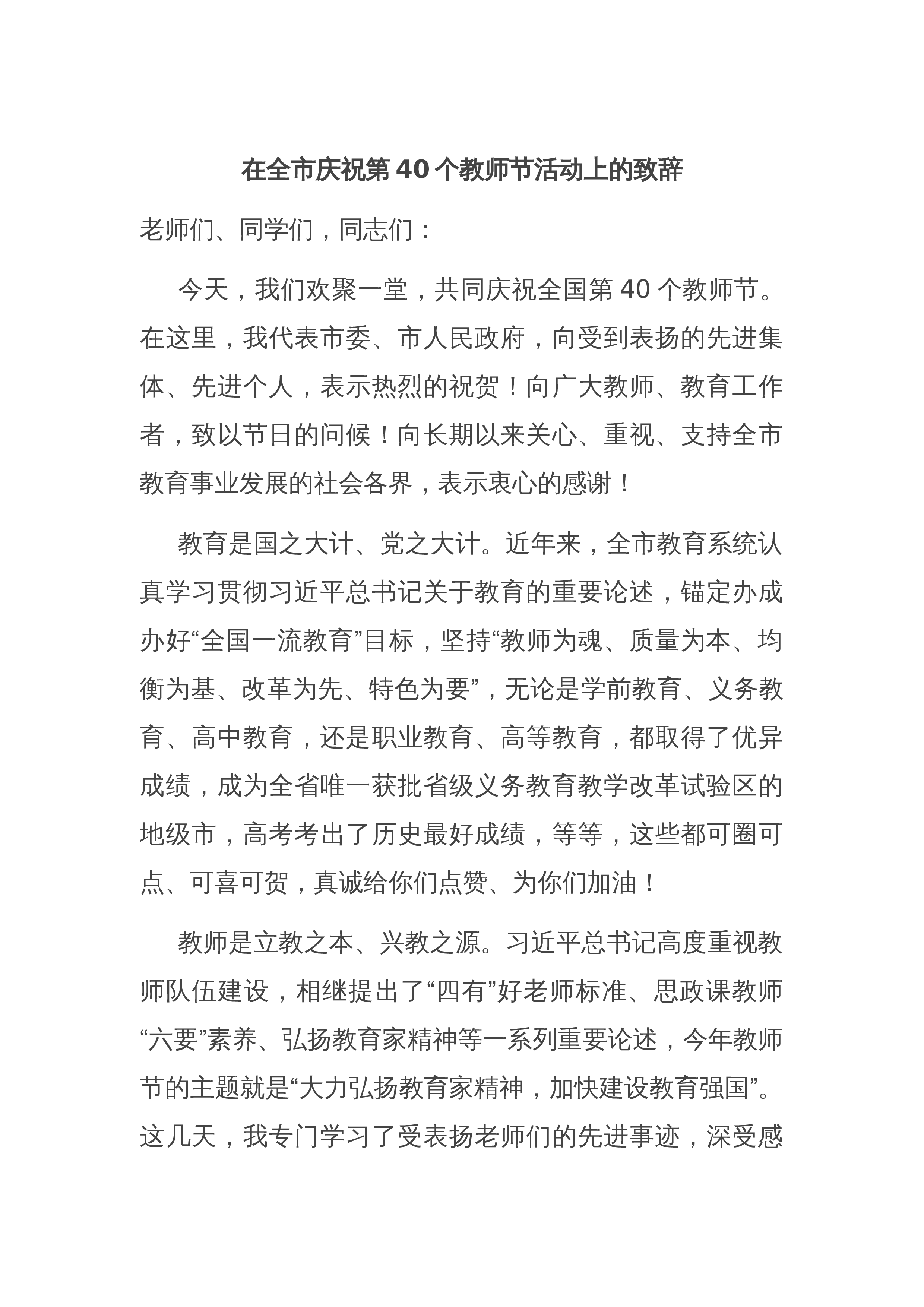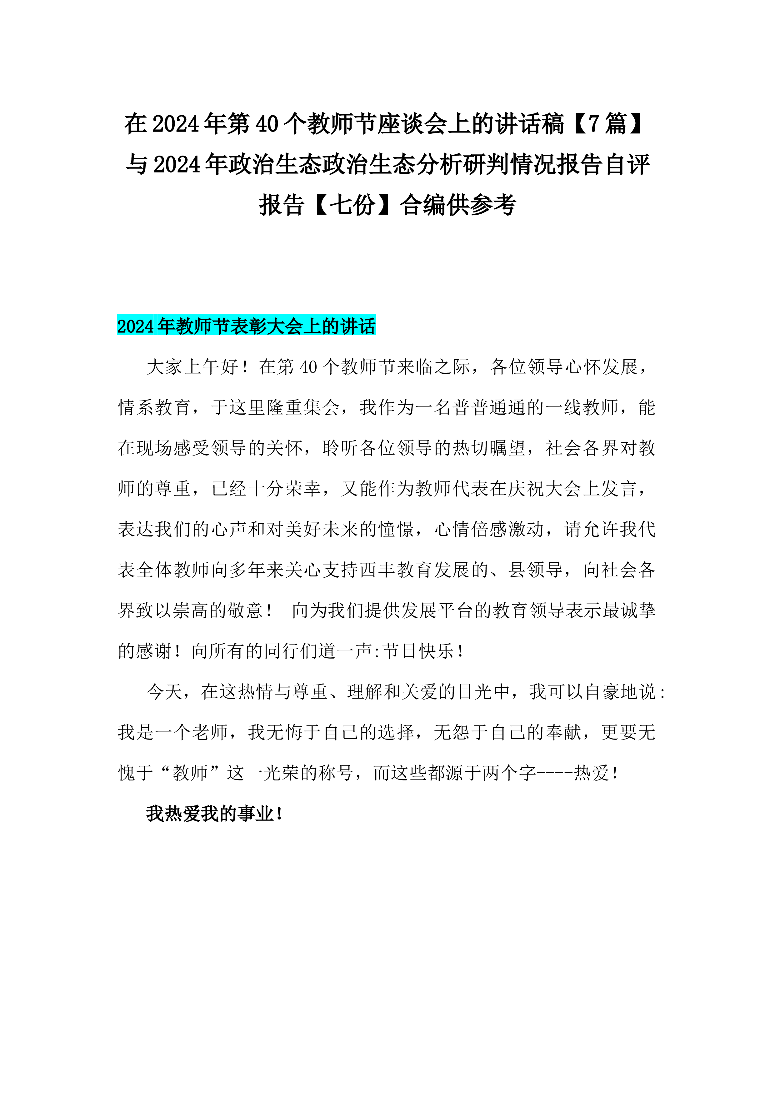 在2024年第40个教师节座谈会上的讲话稿【7篇】与2024年学校党委党支部党建工作总结及2025年党建工作计划【六篇】汇编供参考2024年教师节表彰大会上的讲话大家上午好!在第40个教师节来临之际,各位领导心怀发展,情系教育,于这里隆重集会,我作为一名普普通通的一线教师,能在现场感受领导的关怀,聆听各位领导的热切瞩望,社会各界对教师的尊重,已经十分荣幸,又能作为教师代表在庆祝大会上发言,表达我们的心声和对美好未来的憧憬,心情倍感激动,请允许我代表全体教师向多年来关心支持西丰教育发展的、县领导,向社会各界致以崇高的敬意!向为我们提供发展平台的教育领导表示最诚挚的感谢!向所有的同行们道一声:节日...