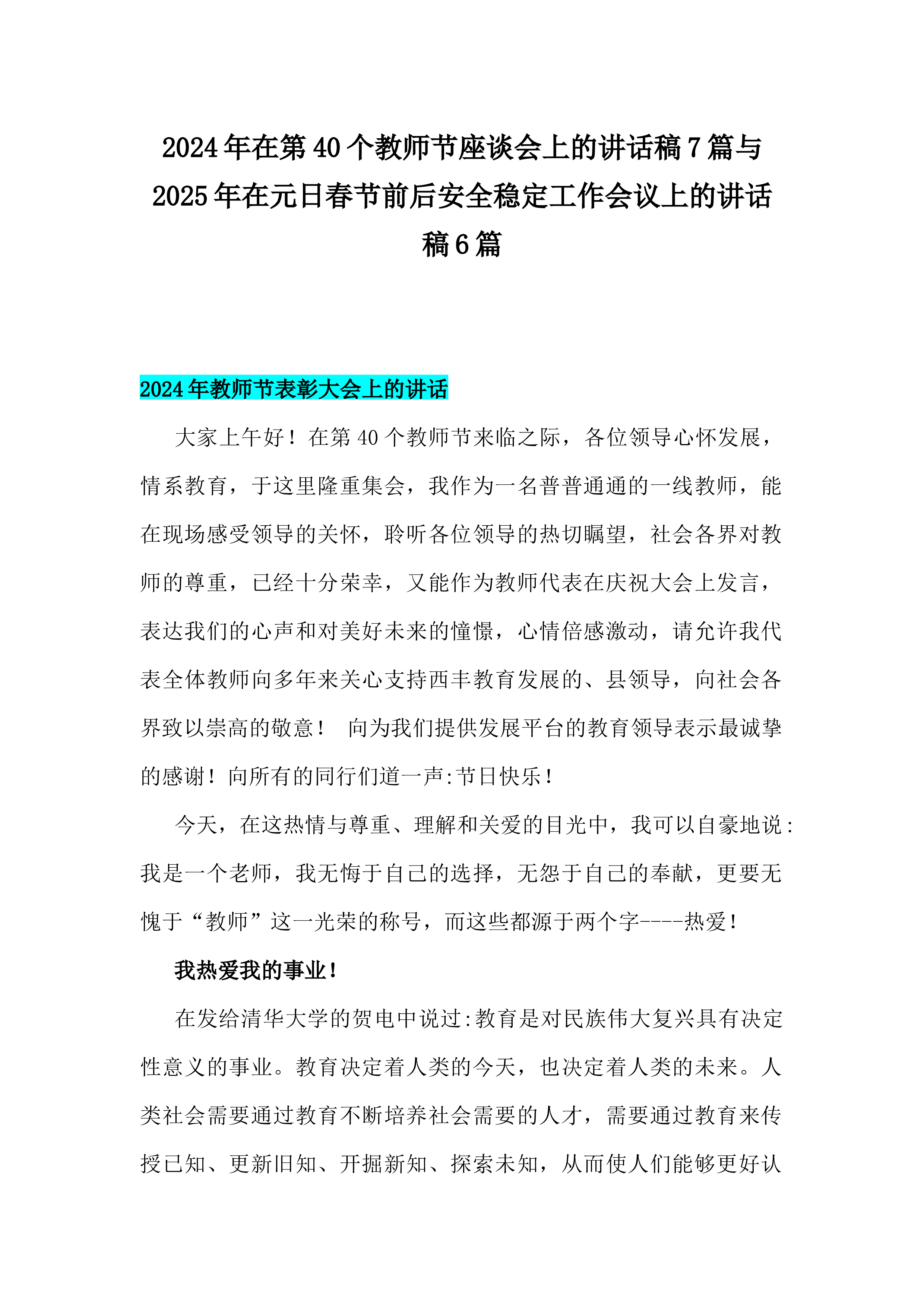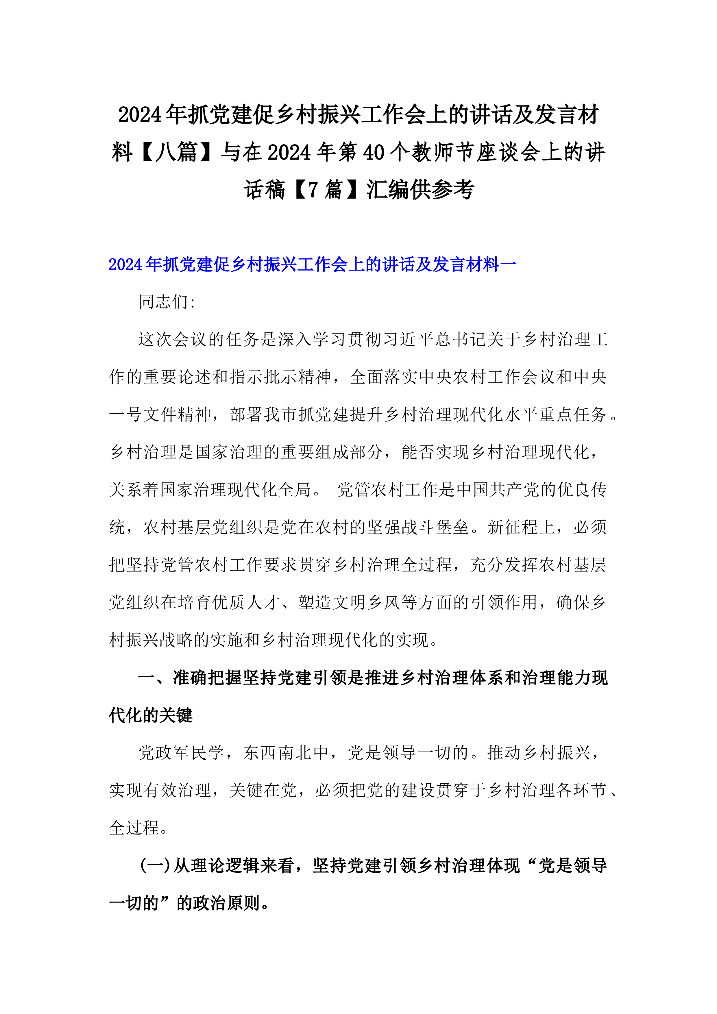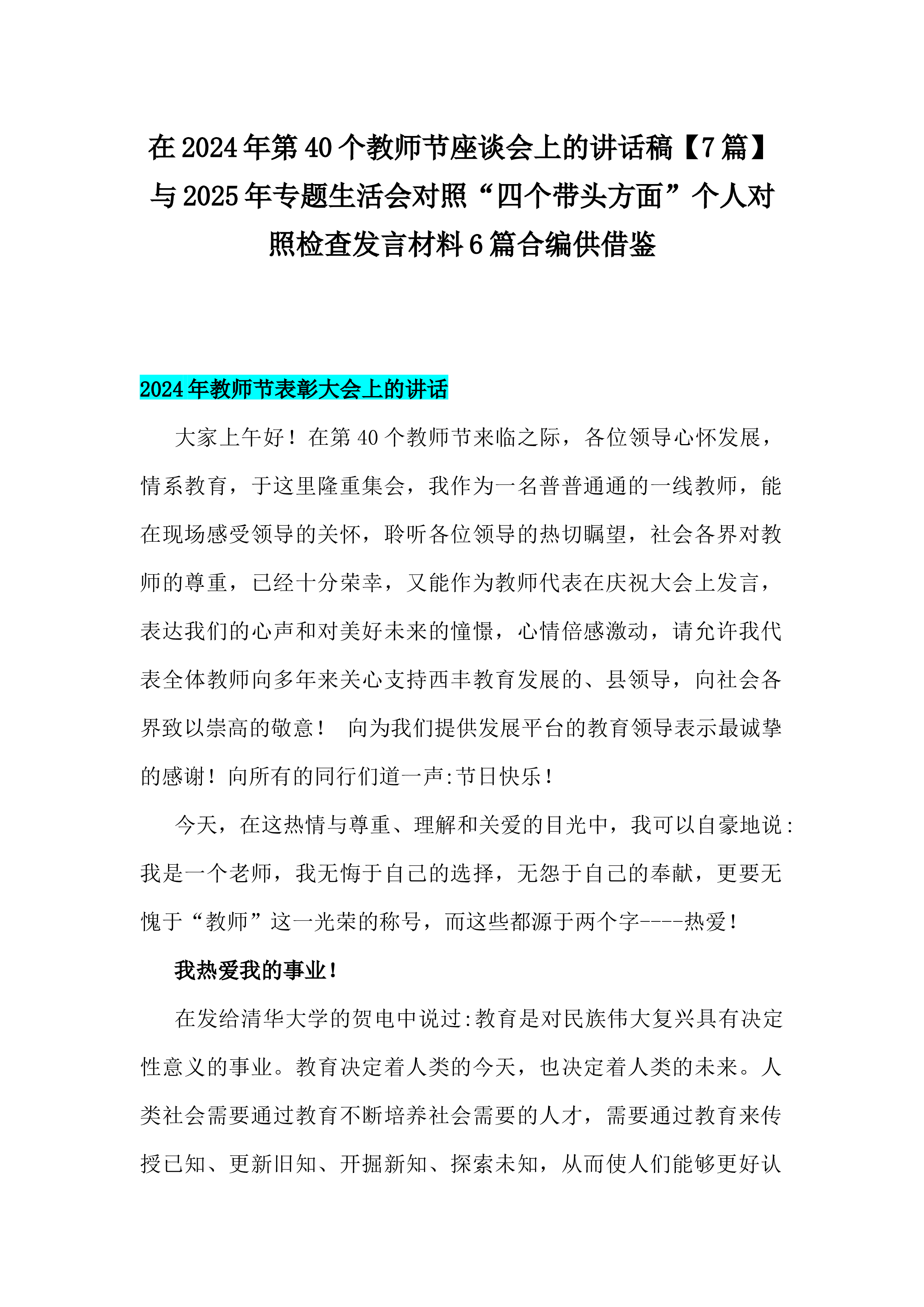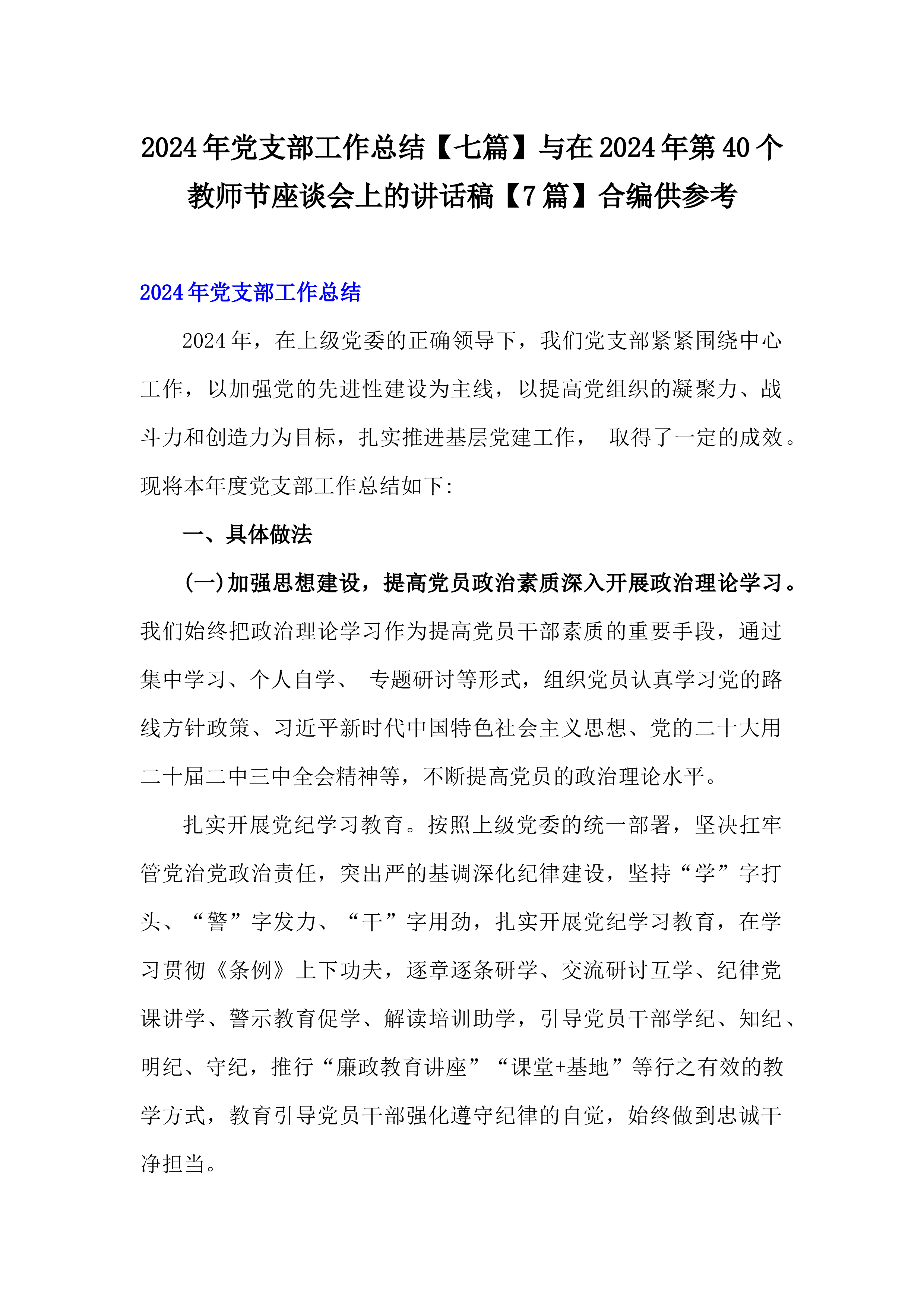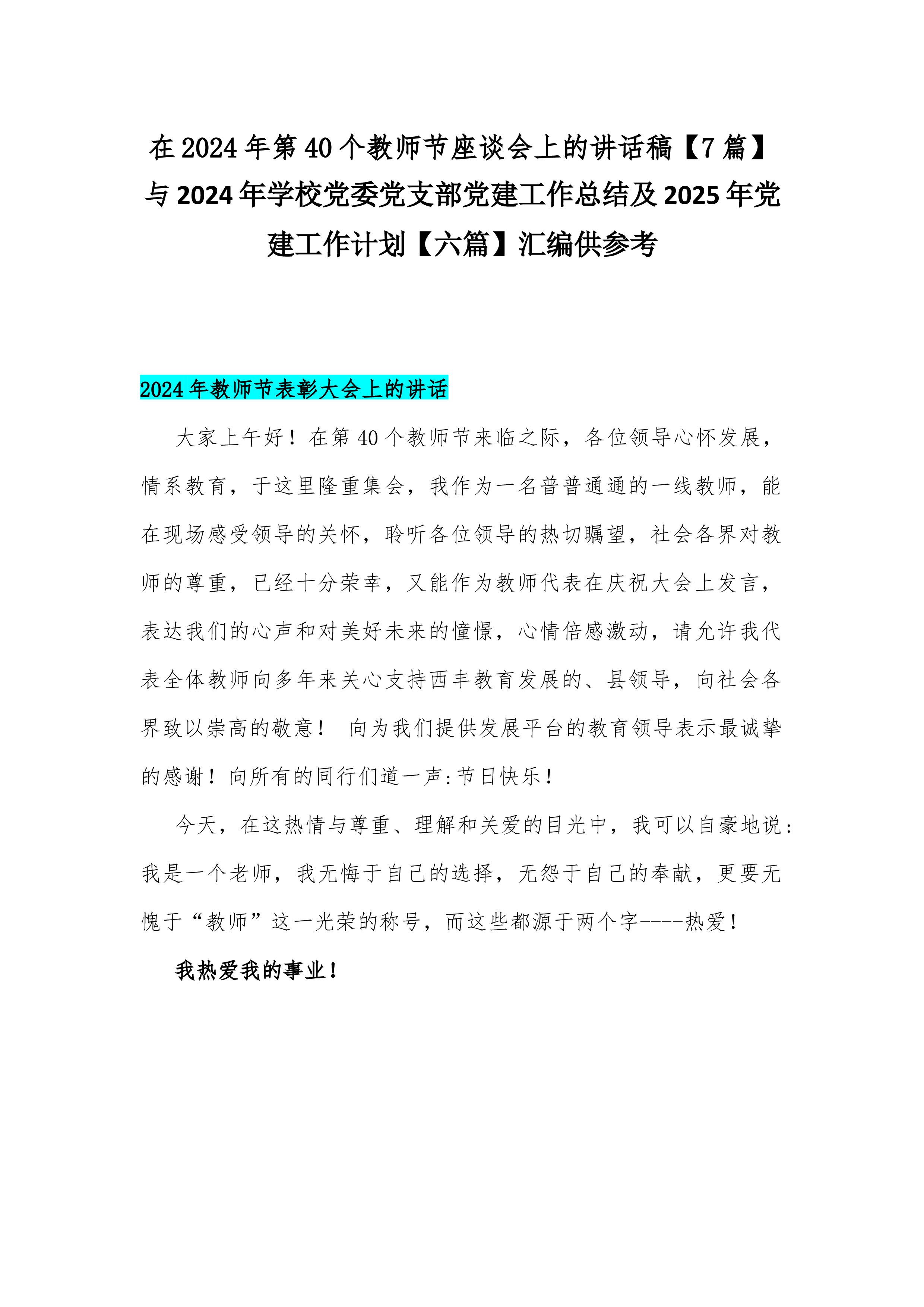 在2024年第40个教师节座谈会上的讲话稿【7篇】与2024年学校党委党支部党建工作总结及2025年党建工作计划【六篇】汇编供参考