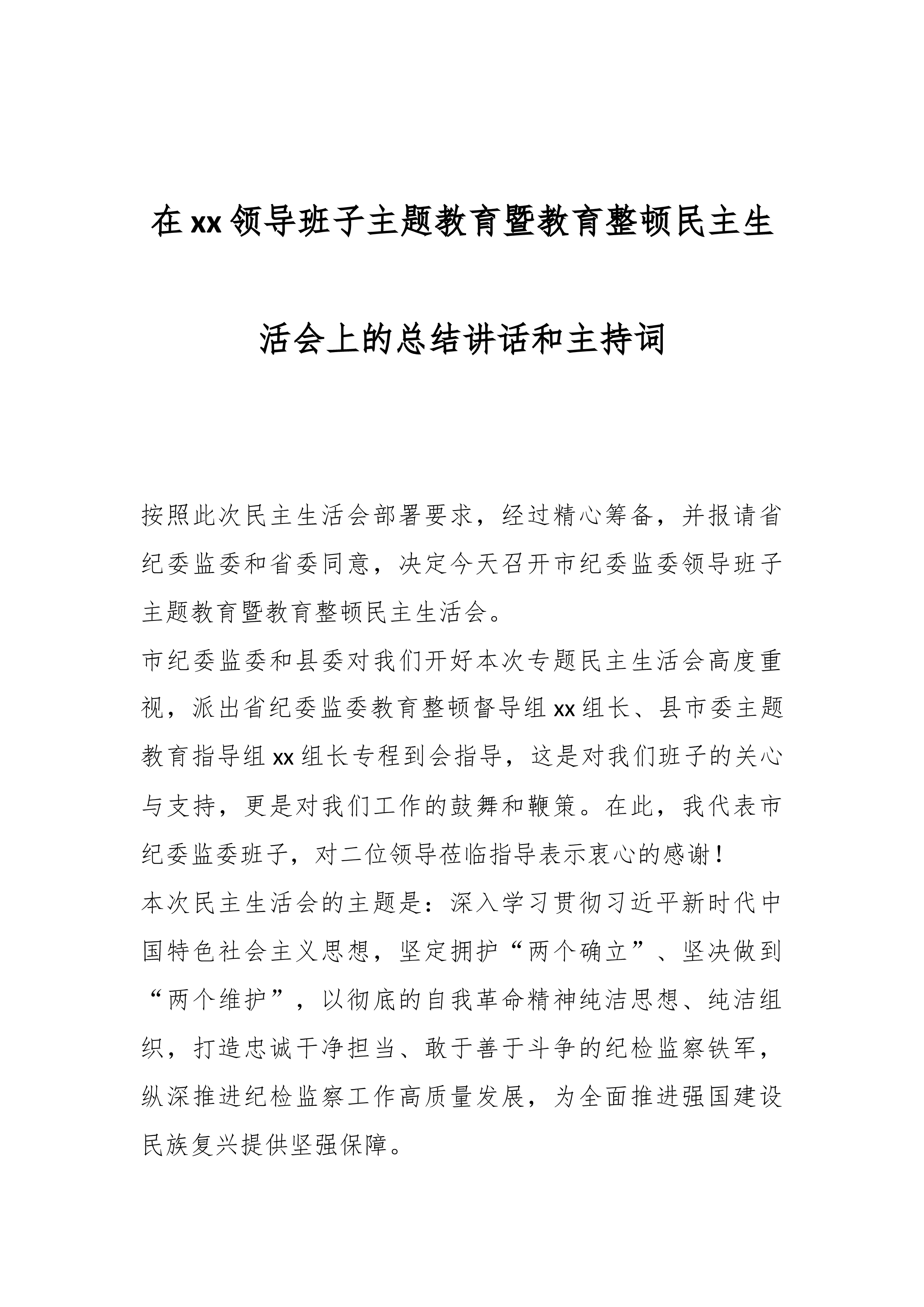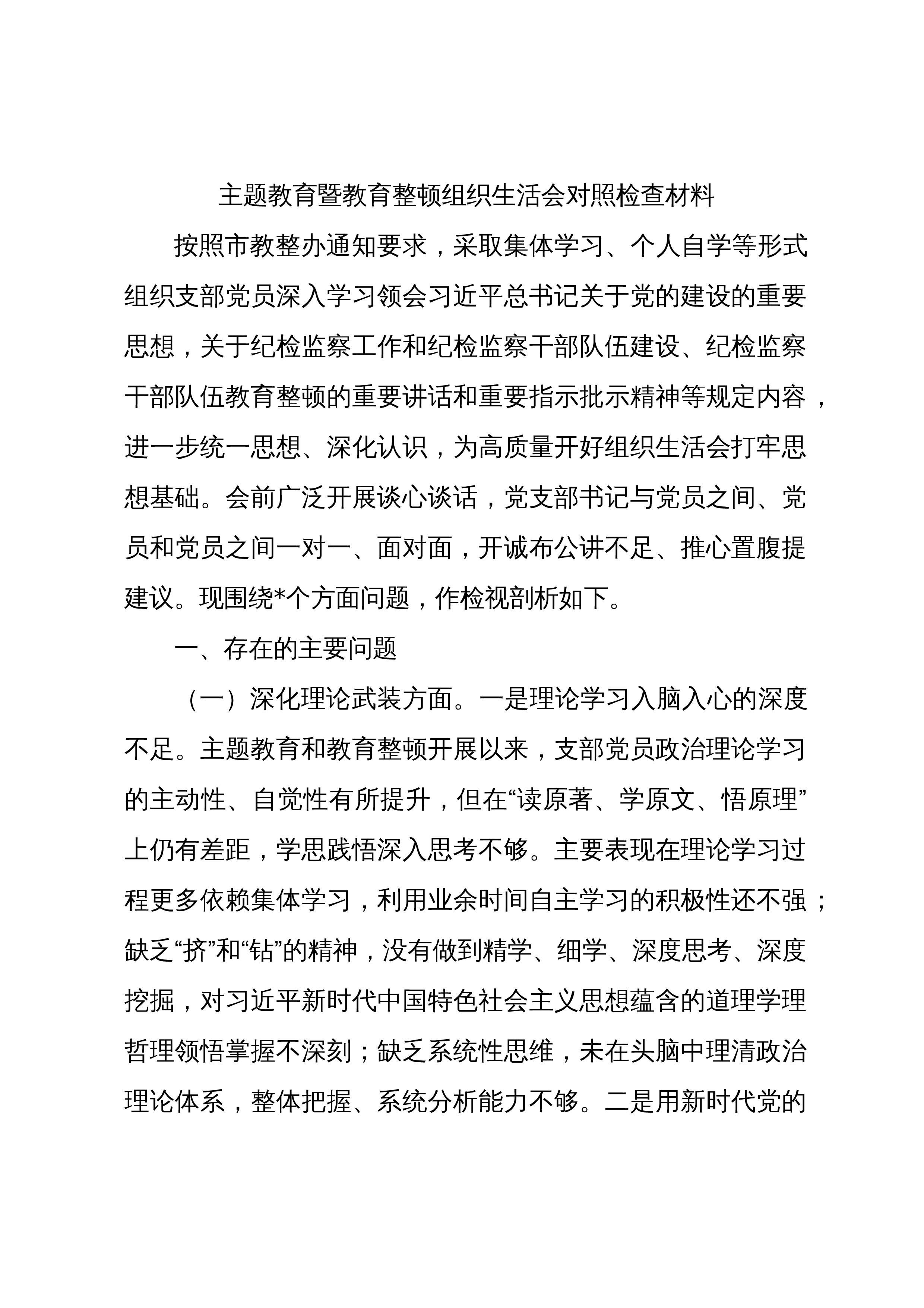 主题教育暨教育整顿组织生活会对照检查材料按照市教整办通知要求,采取集体学习、个人自学等形式组织支部党员深入学习领会习近平总书记关于党的建设的重要思想,关于纪检监察工作和纪检监察干部队伍建设、纪检监察干部队伍教育整顿的重要讲话和重要指示批示精神等规定内容,进一步统一思想、深化认识,为高质量开好组织生活会打牢思想基础。会前广泛开展谈心谈话,党支部书记与党员之间、党员和党员之间一对一、面对面,开诚布公讲不足、推心置腹提建议。现围绕*个方面问题,作检视剖析如下。一、存在的主要问题(一)深化理论武装方面。一是理论学习入脑入心的深度不足。主题教育和教育整顿开展以来,支部党员政治理论学习的主动性、自觉性有所...