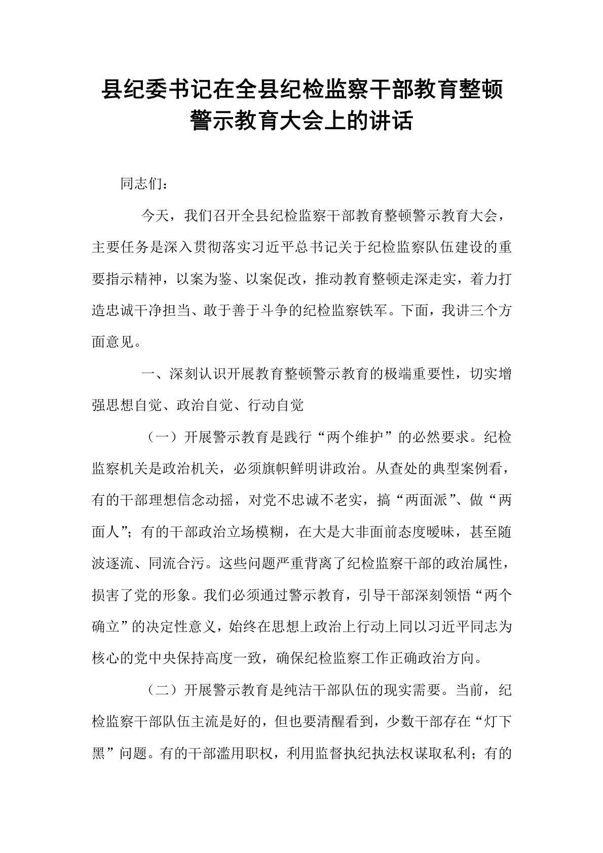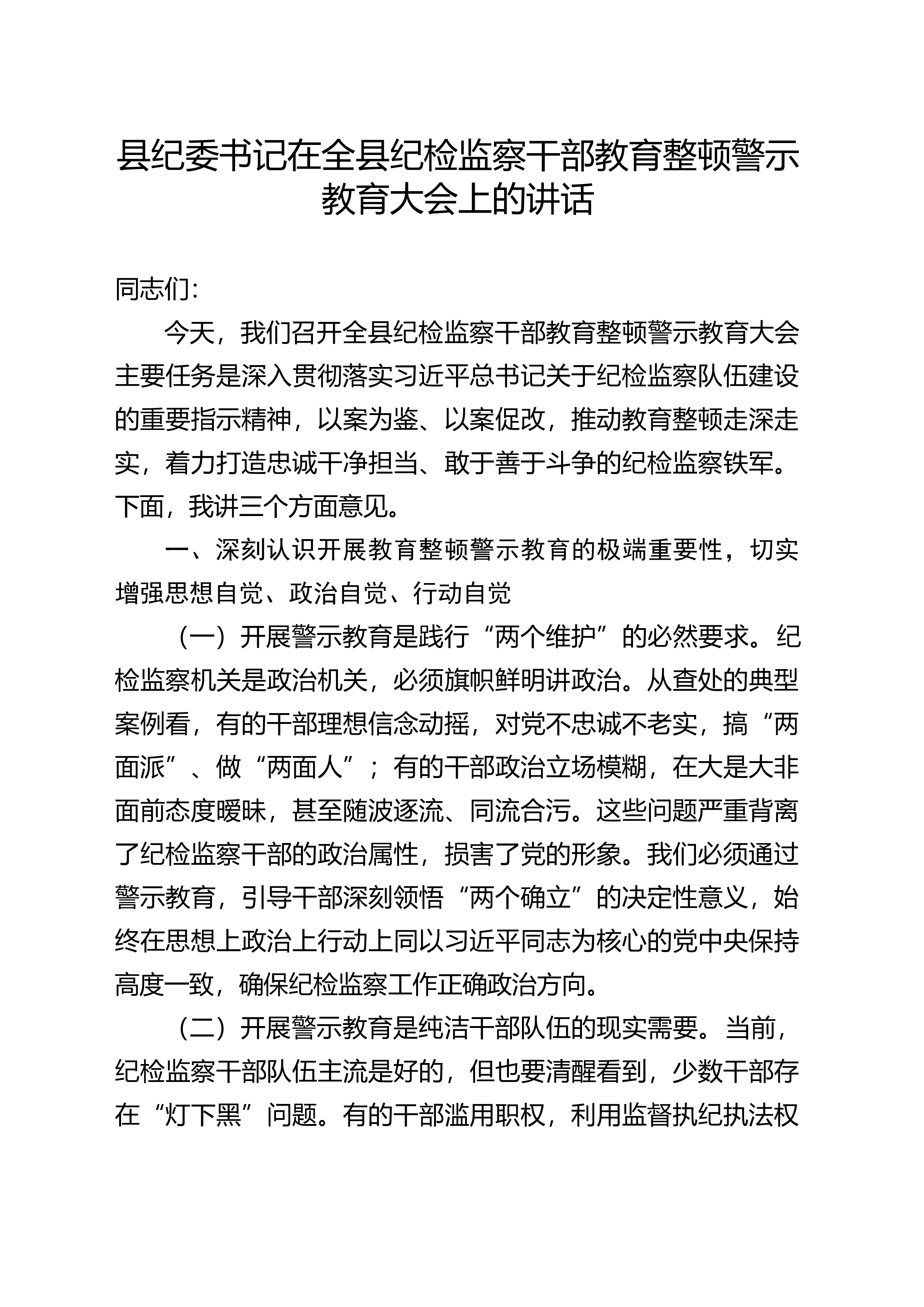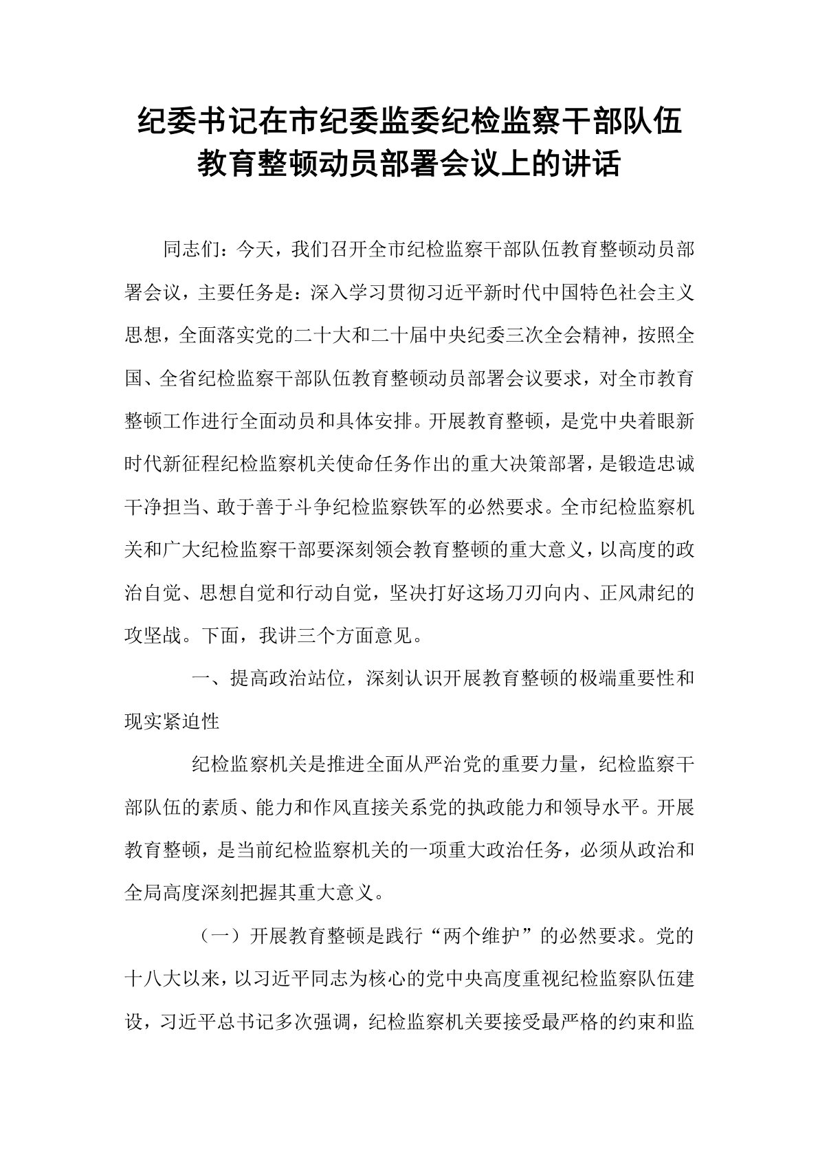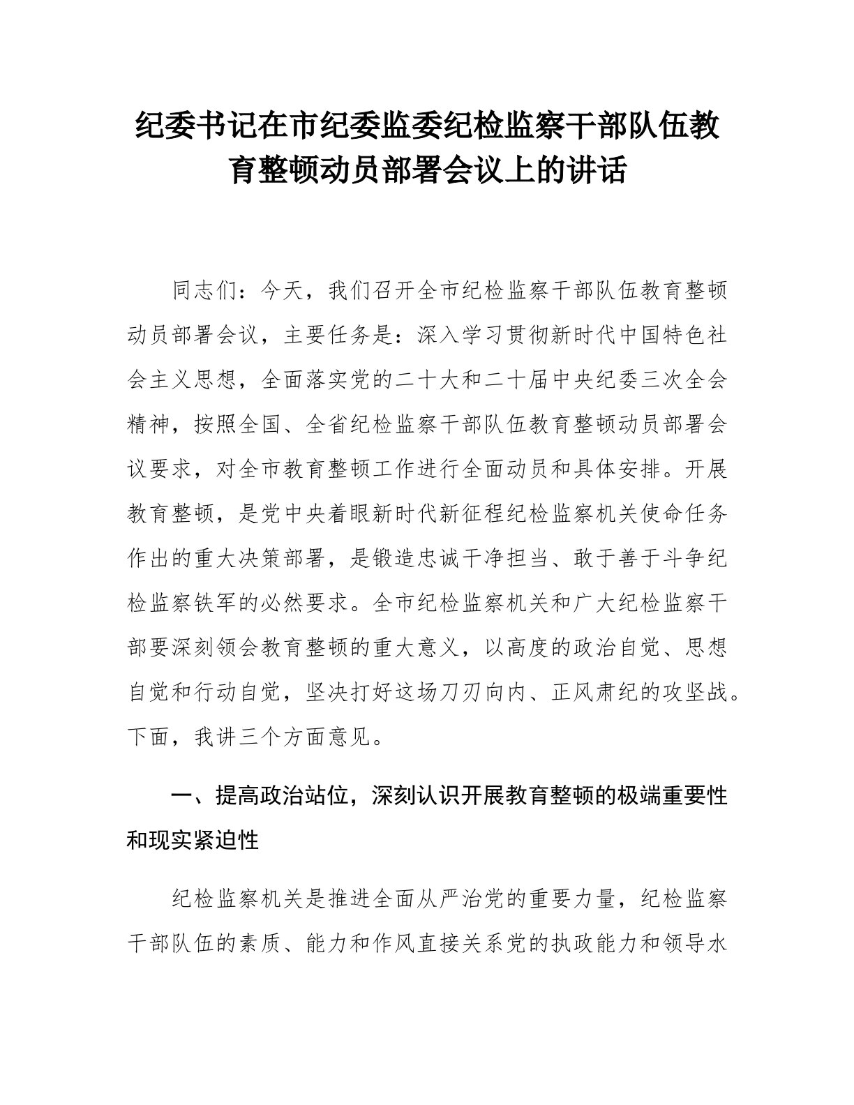 纪委书记在市纪委监委纪检监察干部队伍教育整顿动员部署会议上的讲话同志们:今天,我们召开全市纪检监察干部队伍教育整顿动员部署会议,主要任务是:深入学习贯彻习近平新时代中国特色社会主义思想,全面落实党的二十大和二十届中央纪委三次全会精神,按照全国、全省纪检监察干部队伍教育整顿动员部署会议要求,对全市教育整顿工作进行全面动员和具体安排。开展教育整顿,是党中央着眼新时代新征程纪检监察机关使命任务作出的重大决策部署,是锻造忠诚干净担当、敢于善于斗争纪检监察铁军的必然要求。全市纪检监察机关和广大纪检监察干部要深刻领会教育整顿的重大意义,以高度的政治自觉、思想自觉和行动自觉,坚决打好这场刀刃向内、正风肃纪的攻坚战。下面,我讲三个方面意见。一、提高政治站位,深刻认识开展教育整顿的极端重要性和现实紧迫性纪检监...