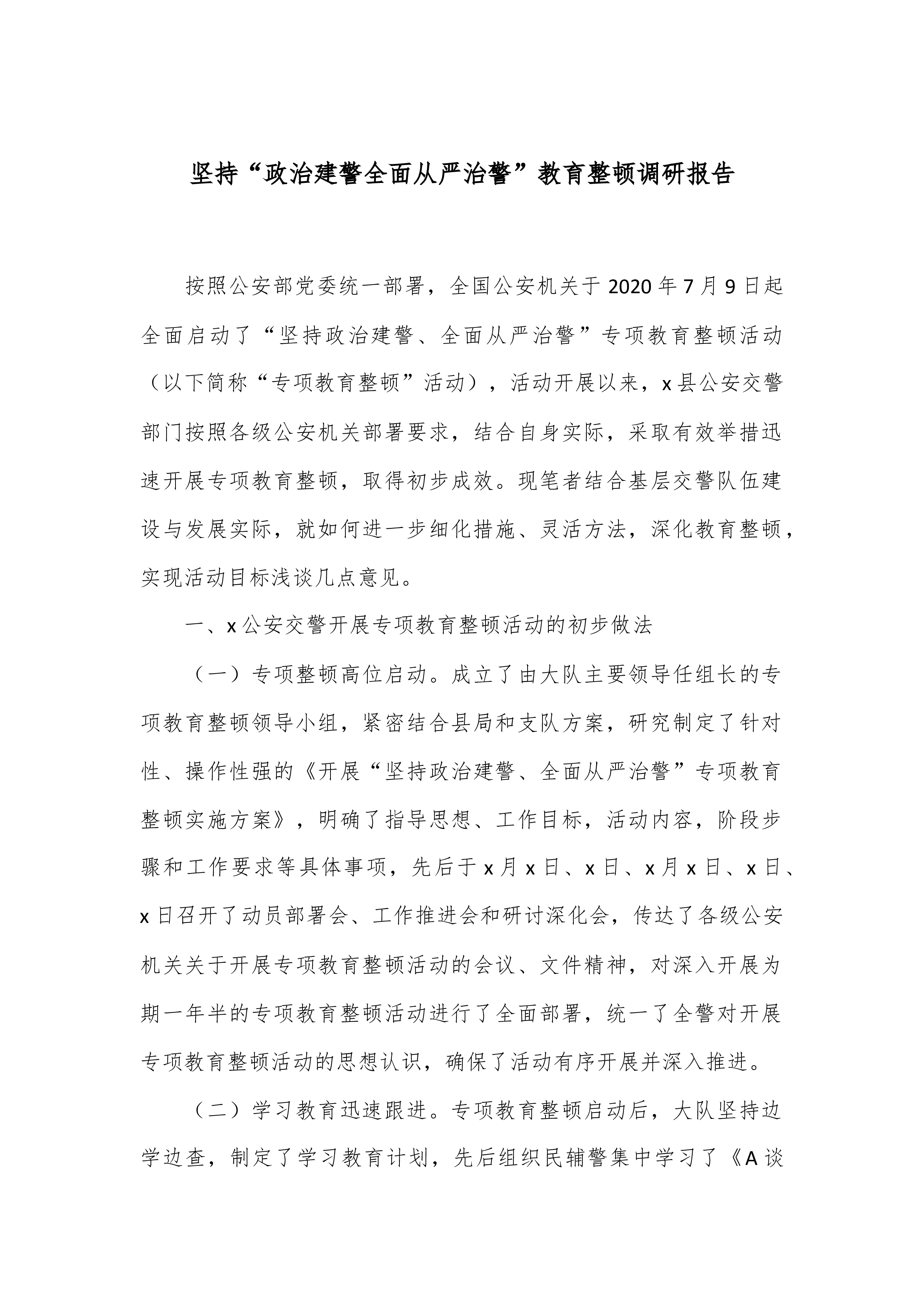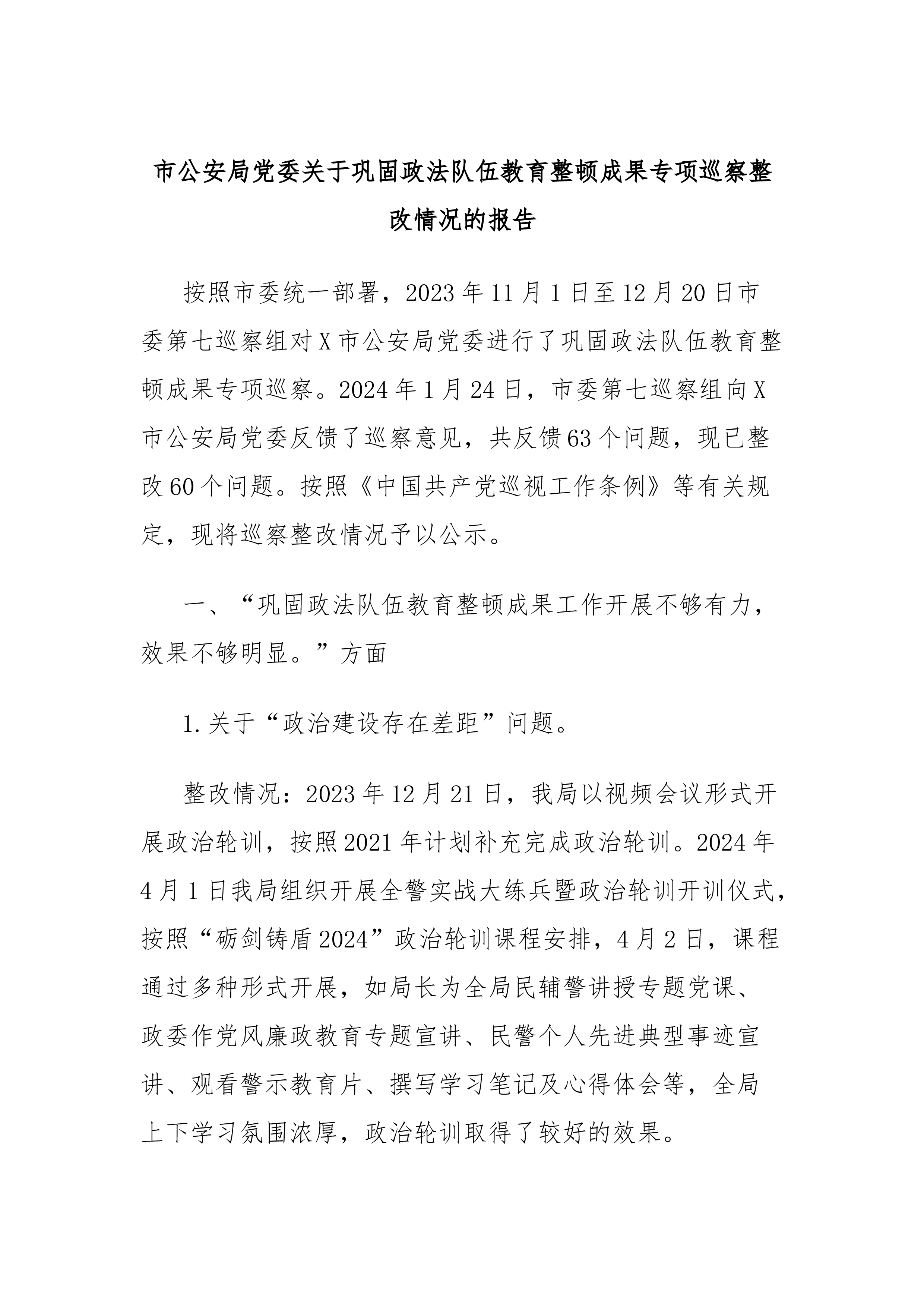 某县公安局关于贯彻落实市委巩固政法队伍教育整顿成果专项巡察整改情况的报告市委第七巡察组于2023年X月X日至2024年X月X日,对县公安局党委进行了巡察。今年X月X日又召开了专项巡察反馈会,指出了县局党委班子在政治建设、纪律建设、作风建设、组织建设4个方面存在的X类X项具体问题,市委书记点人点事共X个方面X条具体问题,提出了客观中肯的意见建议,明确了具体整改要求。按照《中国共产党巡视工作条例》有关规定,现将巡察整改情况报告如下。一、巡察整改工作总体情况(一)提升站位抓整改。X月X日,县局召开专题党委会议,成立专项巡察整改工作领导小组及办公室,认真研究巡察组的反馈意见,制定了切实可行的整改方案和...