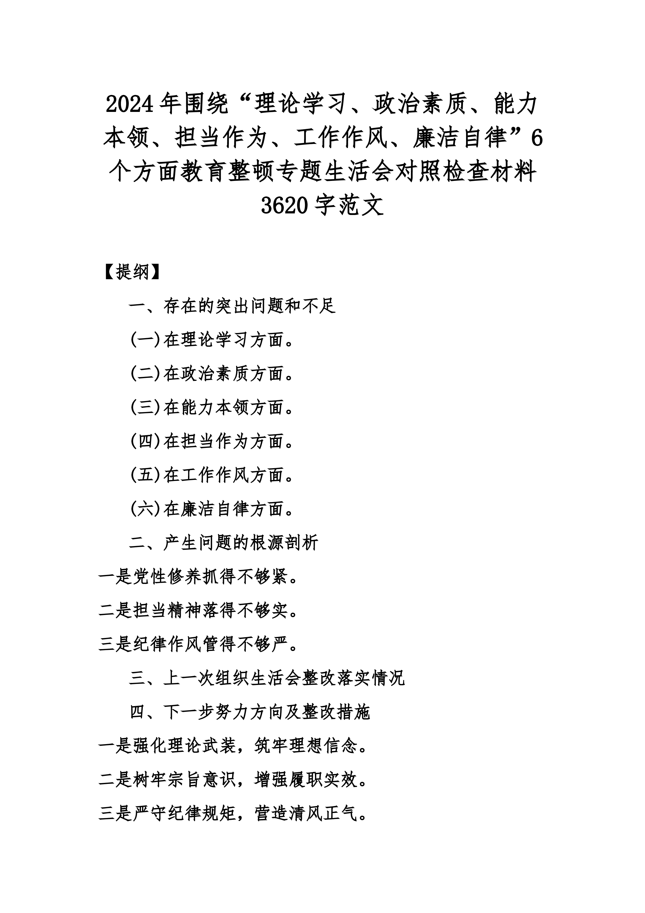 2024年围绕“理论学习、政治素质、能力本领、担当作为、工作作风、廉洁自律”6个方面教育整顿专题生活会对照检查材料3620字范文【提纲】一、存在的突出问题和不足(一)在理论学习方面。(二)在政治素质方面。(三)在能力本领方面。(四)在担当作为方面。(五)在工作作风方面。(六)在廉洁自律方面。二、产生问题的根源剖析一是党性修养抓得不够紧。二是担当精神落得不够实。三是纪律作风管得不够严。三、上一次组织生活会整改落实情况四、下一步努力方向及整改措施一是强化理论武装,筑牢理想信念。二是树牢宗旨意识,增强履职实效。三是严守纪律规矩,营造清风正气。正文按照本次主题教育专题组织生活会的有关要求,本人坚持问题...