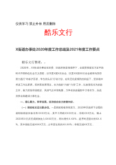仅供学习禁止外传用后删除酷乐文行X街道办事处2020年度工作总结及2021年度工作要点酷乐文行整理,,2020年,XX街道办事处在区委、区政府的坚强领导下,全面贯彻落实习近平新时代中国特色社会主义思想,以市委X届X次全会、区委XX届XX次全会精神为指导努力践行“对标沪苏浙,争当排头兵”行动计划,在常态化疫情防控前提下,坚持稳中求进工作总基调,坚持新发展理念,全力做好“六稳”“六保”工作,以改善民生为执政之本,着力营造和谐稳定、风清气正环境氛围,力争在执政履职中大有作为,决战决胜全面建成小康社会。一、凝心聚力,科学发展,经济综合实力持续向好。(一)财政收支迈出新步伐。一是财政税收持续发力。20...