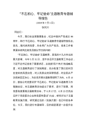 “不忘初心、牢记使命”主题教育专题辅导报告(2019年7月1日)张河川同志们:今天,我们在这里隆重集会,纪念中国共产党成立98周年,举行“不忘初心、牢记使命”主题教育专题辅导报告会。首先,我代表局党委,向全局广大共产党员、党务工作者离退休老同志老党员致以节日的问候!“不忘初心、牢记使命”主题教育,是党的十九大作出的重大部署。今年5月31日,党中央召开主题教育工作会议,习近平总书记发表了重要讲话,从统揽“四个伟大”的战略高度,对主题教育进行了深刻阐述,充分彰显了我们党对历史使命的高度自觉,对人民群众的深厚情感,对全面从严治党的坚定决心,为全党开展主题教育指明了方向。6月12日,股份公司党委召开“...