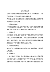 训练计划方案训练计划方案由网的会员投稿精心推荐,小编希望以下7篇范文对你的学习工作能带来参考借鉴作用。第1篇:训练计划方案猜你正在找训练计划方案的怎么写?那么就给你这篇范文参考。一、训练目的任务:为丰富校园课余生活,提高学生体育运动水平及我校体育竞赛水平,迎接吴江市的乒乓球比赛活动,特制定本计划。二、基本情况:由于我校乒乓球队处于初创阶段,学生的基本功不扎实,理论知识缺乏,因而面临重重困难。其优点是学生积极性高,运动兴趣强烈、能吃苦耐劳。综合去年在吴江市乒乓球比赛的实践中各校的运动水平,特制定主要训练女队员为主。三、训练次数与时间:每天放心班开始训练,每次1办小时左右,每周训练4天,星期六上午...