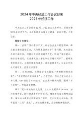 2024年中央经济工作会议部署明年经济工作九大重点任务一年一度的中央经济工作会议召开,为2025年的经济形势和宏观政策指明了方向。中央经济工作会议12月11日至12日在北京举行。分析当前经济形势,部署2025年经济工作。会议对当前经济形势作出判断,部署了明年经济工作的九大重点任务。包括全方位扩大国内需求、科技创新引领新质生产力推动标志性改革举措落地见效;扩大高水平对外开放,稳外贸、稳外资;有效防范化解重点领域风险;统筹推进新型城镇化和乡村全面振兴;加大区域战略实施力度;协同推进降碳减污扩绿增长;加大保障和改善民生力度等。一、正视困难坚定信心会议指出,当前外部环境变化带来的不利影响加深,我国经济...