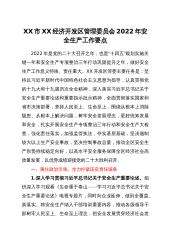 XX市XX经济开发区管理委员会2022年安全生产工作要点2022年是党的二十大召开之年,也是“十四五”规划实施关键一年和安全生产专项整治三年行动巩固提升之年,做好安全生产工作意义特殊、责任重大。XX开发区管委主要任务是:坚持以习近平新时代中国特色社会主义思想为指导,认真贯彻党的十九大和十九届历次全会精神,深入落实习近平总书记关于安全生产重要论述和重要指示批示精神,全面贯彻落实国家和省市决策部署,坚持人民至上、生命至上,围绕从根本上消除隐患、从根本上解决问题,树牢安全发展理念,更好统筹发展和安全,扎实开展安全生产专项整治三年行动和安全生产大检查,强化责任落实,加强监管执法,夺实基层基础,坚决遏制...