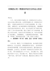 在集团公司一季度经济运行分析会上的讲话同志们:今天,我们专题召开集团公司一季度经济运行分析会。这次会议的主要任务是:分析研判集团公司一季度经济运行情况,对做好当前经济运行工作进行安排部署,进一步统一思想,凝聚共识,奋力推动集团公司高质量发展,确保圆满完成年度各项目标任务。刚才,各公司各部门作了情况汇报,分析了工作中存在的问题,提出了做好下步工作的举措,集团公司各位领导,也结合自身分管领域工作,有针对性的提出了意见建议,讲得都很好,主要是要坚定抓好落实,用数据、用实绩、用结果说话交账。下面,我讲三点意见。一、客观看待“开门红”成绩,坚定“全年胜”的信心决心今年以来,集团上下以开局就是决战、起步就...