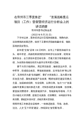 在常州市三季度推进“”发展战略重点项目(工作)督查暨经济运行分析会上的讲话摘要常州市委书记陈金虎(2022年9月21日)下半年以来,我市经济运行呈现持续恢复、增势向好、后劲增强的发展态势,保持了主要经济指标跑赢全省、领跑苏南的良好势头。距年底“交卷”还有100天时间,全市上下要坚持稳字当头、稳中求进,高效统筹疫情防控和经济社会发展,统筹发展和安全,全力拼抢年度目标任务,尽最大努力取得最好成绩,为全国全省稳住经济大盘作出常州更大贡献。要千方百计稳增长。用足用活政策,确保直达共享、非申即享,形成组合效应、释放政策效能,以市场主体“青山常在”,支持经济大盘“生机盎然”。要扩大有效投入,加大重大项目攻...