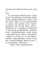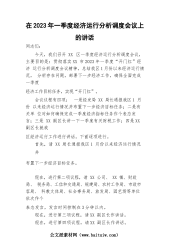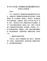 在2023年全县二季度重点项目建设暨经济运行分析会上的讲话同志们:今天,县政府召开二季度重点项目建设暨经济运行分析会,主要是分析二季度重点项目进展及经济运行情况,研究推进举措,进一步认清形势,坚定信心,埋头苦干,奋力推动经“”济社会追赶超越、加速发展,确保上半年实现双过半目标。刚才,*县长传达了全市二季度经济运行分析会精神,领学了*市长讲话的主要内容;县发改、统计、招商3个部门通报了二季度经济运行相关情况,底子清楚,分析透彻,对下一步工作建议重点突出,措施得力。后面,赵县长还要作重要讲话,请大家深刻领会,认真抓好落实。根据会议安排,我先讲三点:一、精准研判当前经济形势“今年以来,全县上下紧紧围...
