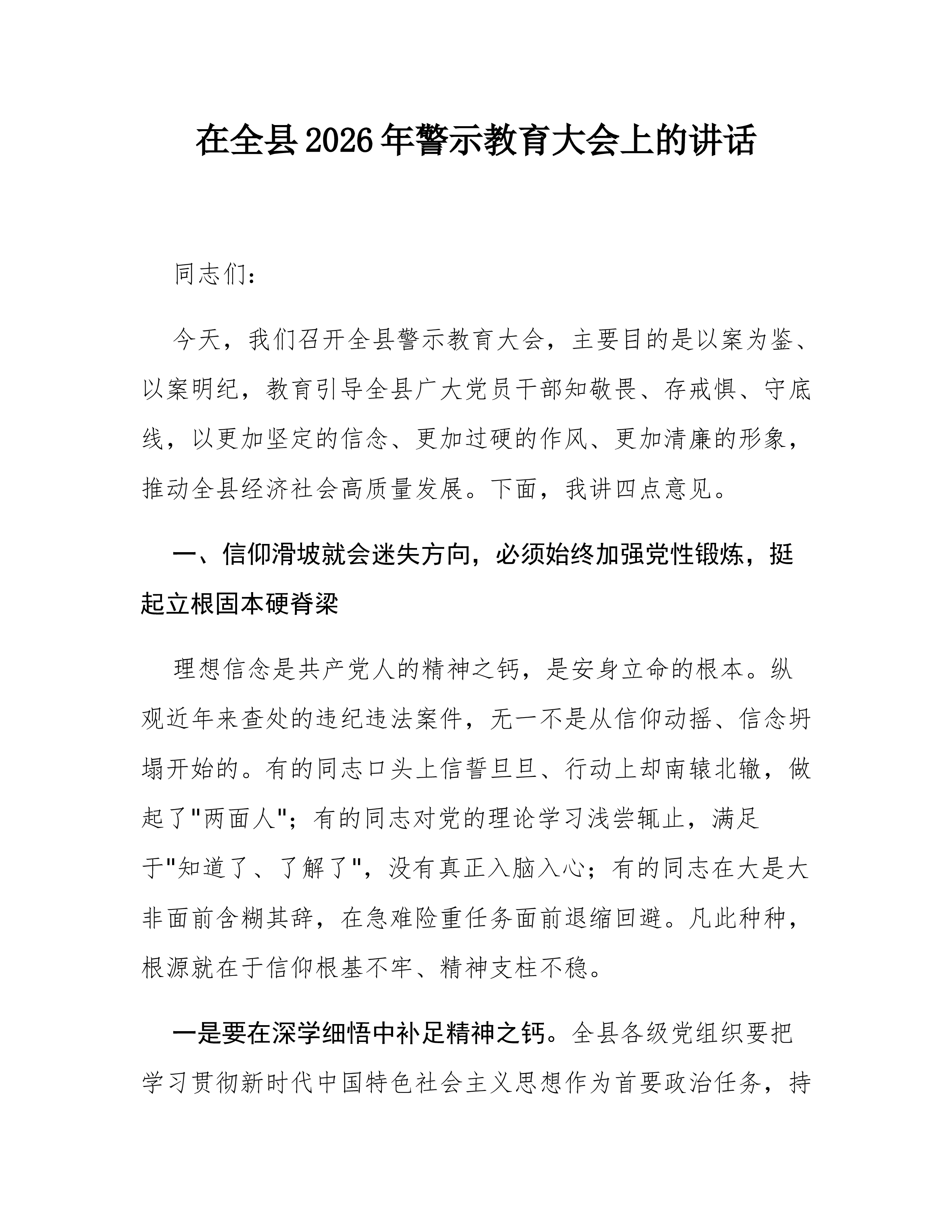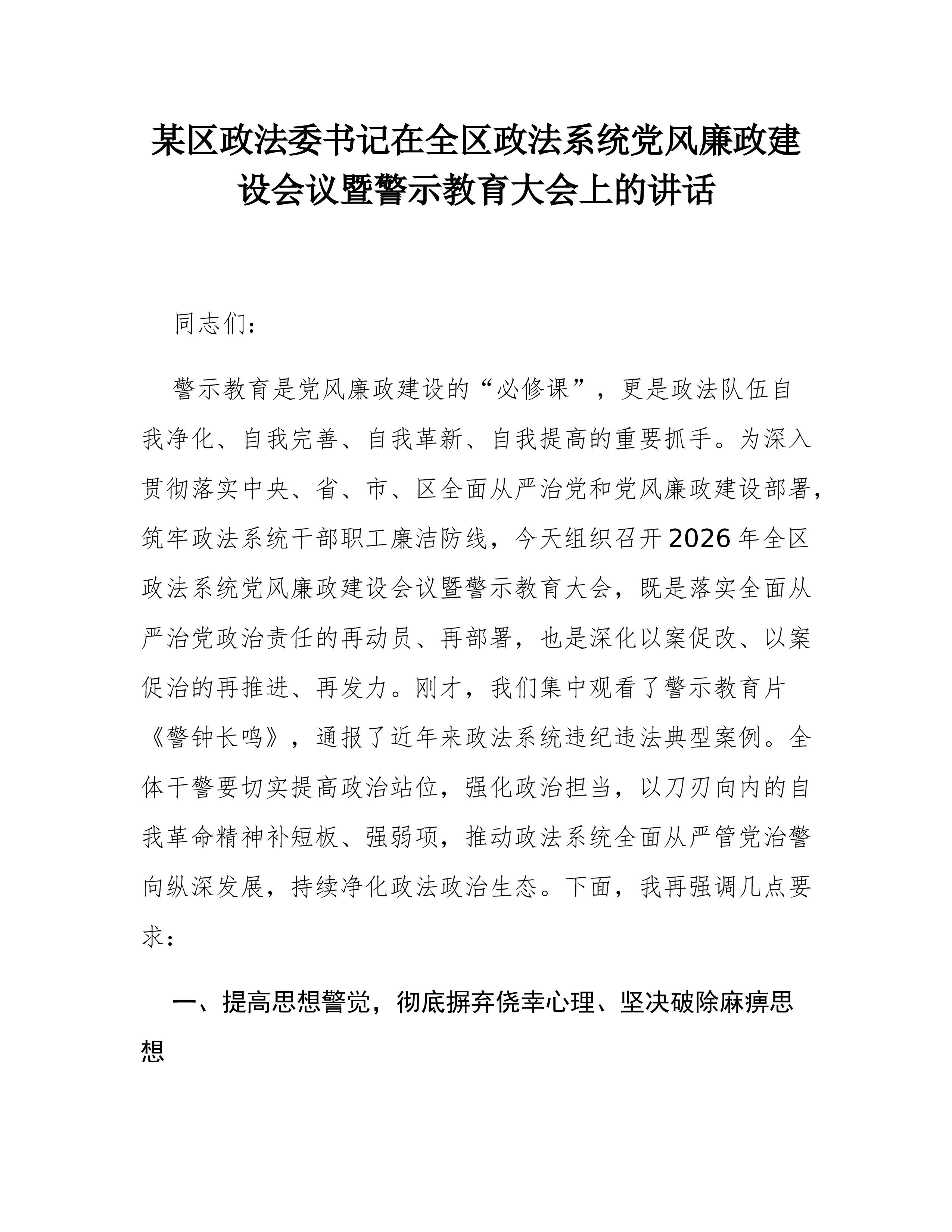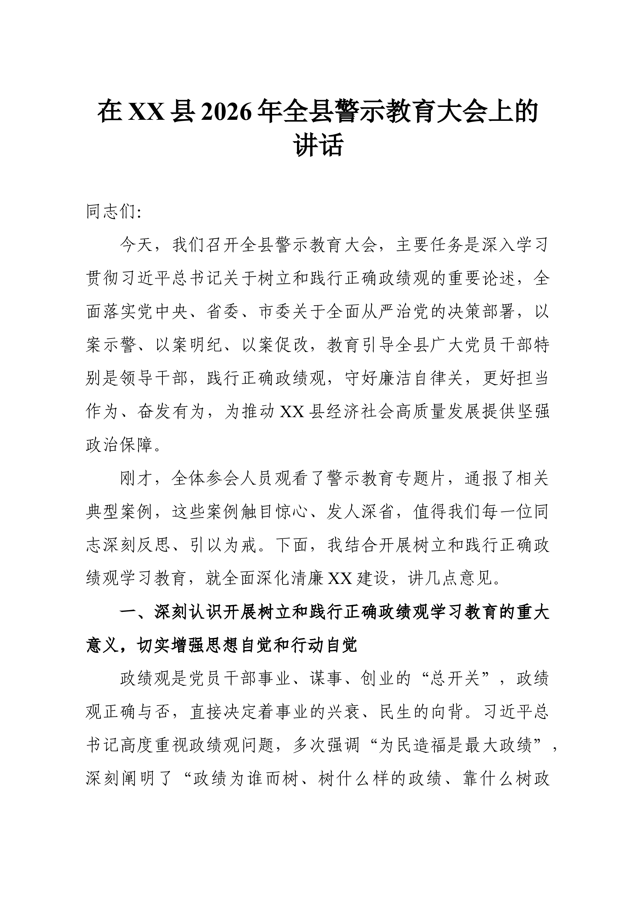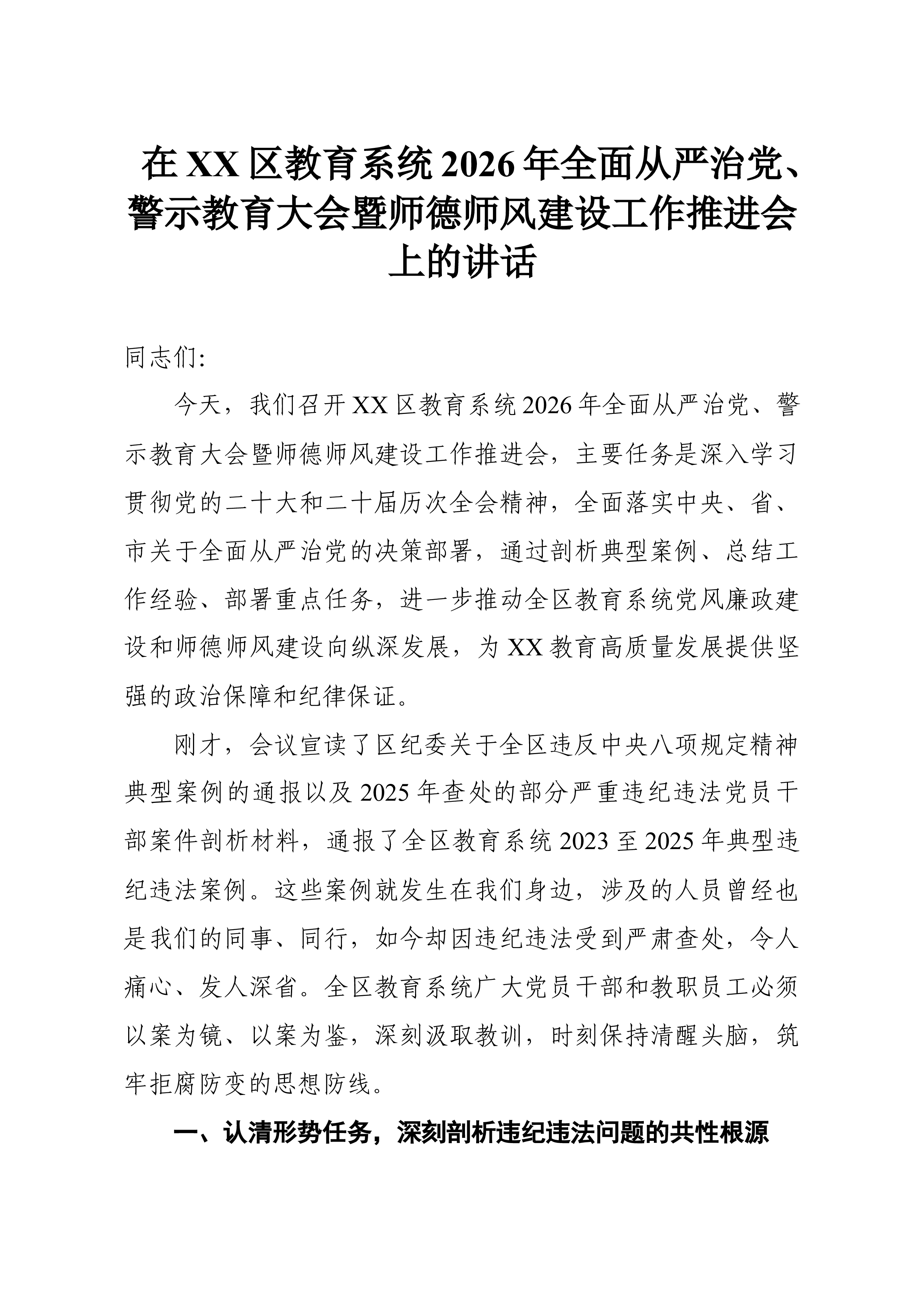 在XX区教育系统2026年全面从严治党、警示教育大会暨师德师风建设工作推进会上的讲话同志们:今天,我们召开XX区教育系统2026年全面从严治党、警示教育大会暨师德师风建设工作推进会,主要任务是深入学习贯彻党的二十大和二十届历次全会精神,全面落实中央、省、市关于全面从严治党的决策部署,通过剖析典型案例、总结工作经验、部署重点任务,进一步推动全区教育系统党风廉政建设和师德师风建设向纵深发展,为XX教育高质量发展提供坚强的政治保障和纪律保证。刚才,会议宣读了区纪委关于全区违反中央八项规定精神典型案例的通报以及2025年查处的部分严重违纪违法党员干部案件剖析材料,通报了全区教育系统2023至2025年典型违纪违法案例。这些案例就发生在我们身边,涉及的人员曾经也是我们的同事、同行,如今却因违纪违法受到...
