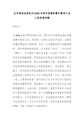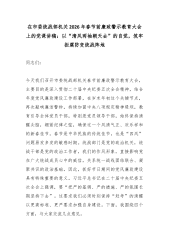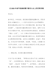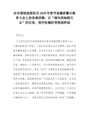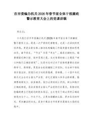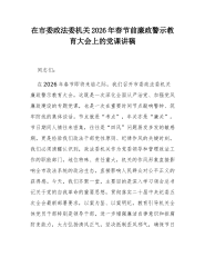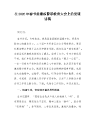 在市委统战部机关2026年春节前廉政警示教育大会上的党课讲稿:以“清风两袖朝天去”的自觉,筑牢拒腐防变统战阵地同志们:今天我们召开市委统战部机关春节前廉政警示教育大会,主要目的是深入贯彻二十届中央纪委五次全会精神,结合年度党风廉政建设工作部署,在岁末年初这个关键节点,再次敲响廉洁警钟,持续加固中央八项规定精神堤坝,教育引导全体党员干部,特别是党员领导干部,始终保持清醒头脑,绷紧纪律之弦,确保过一个风清气正、欢乐祥和的新春佳节。春节是中华民族的传统佳节,也是“四风”问题易发多发的敏感时期。统战部门是党的政治机关,统战干部是党的政治工作者,我们的作风形象,直接影响党在广大统战成员心中的威信,关系统一战线团结联合、凝聚共识的政治基础。因此,抓好节日期间的党风廉政建设,具有特殊重要的意义。总书记在二...
