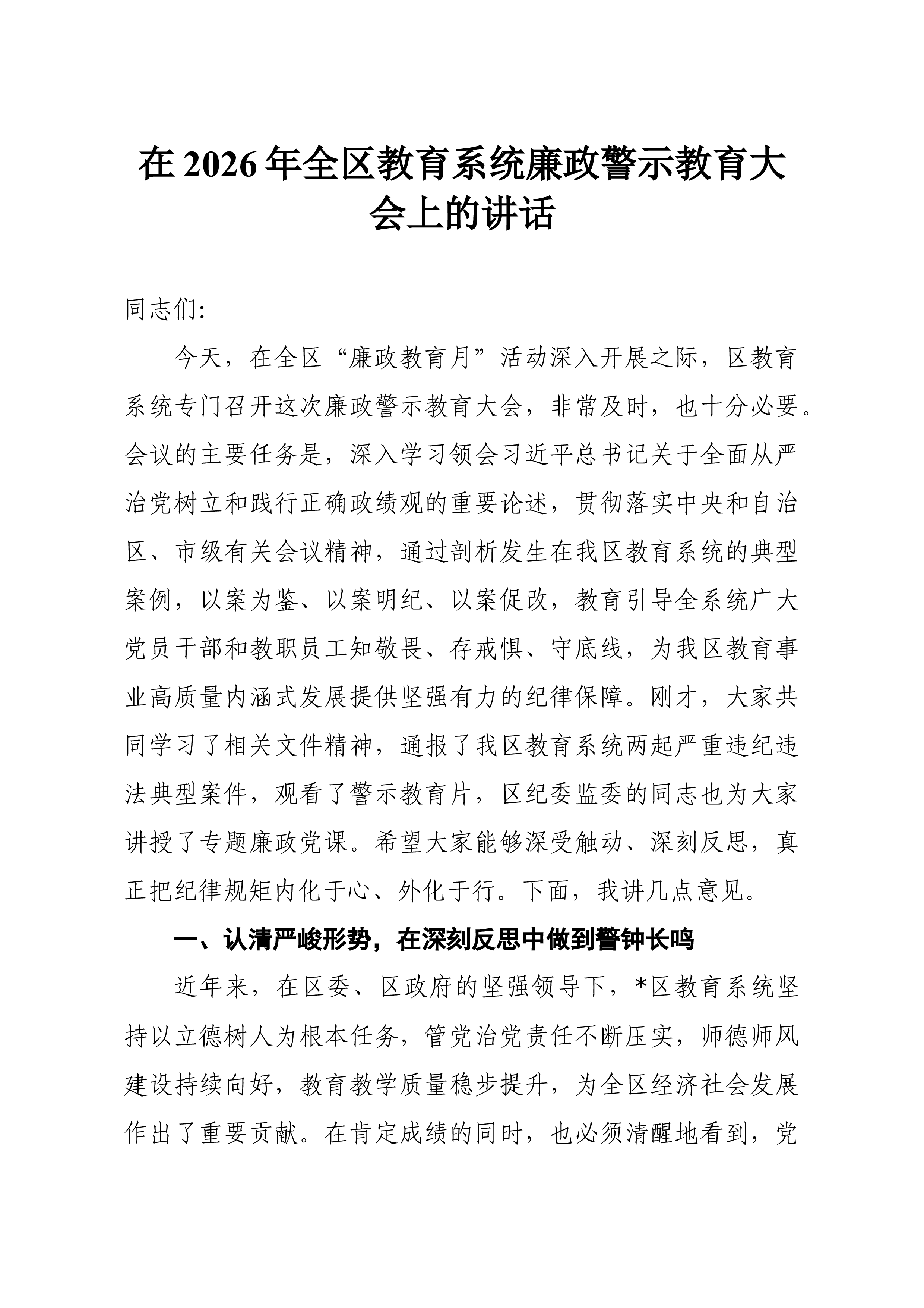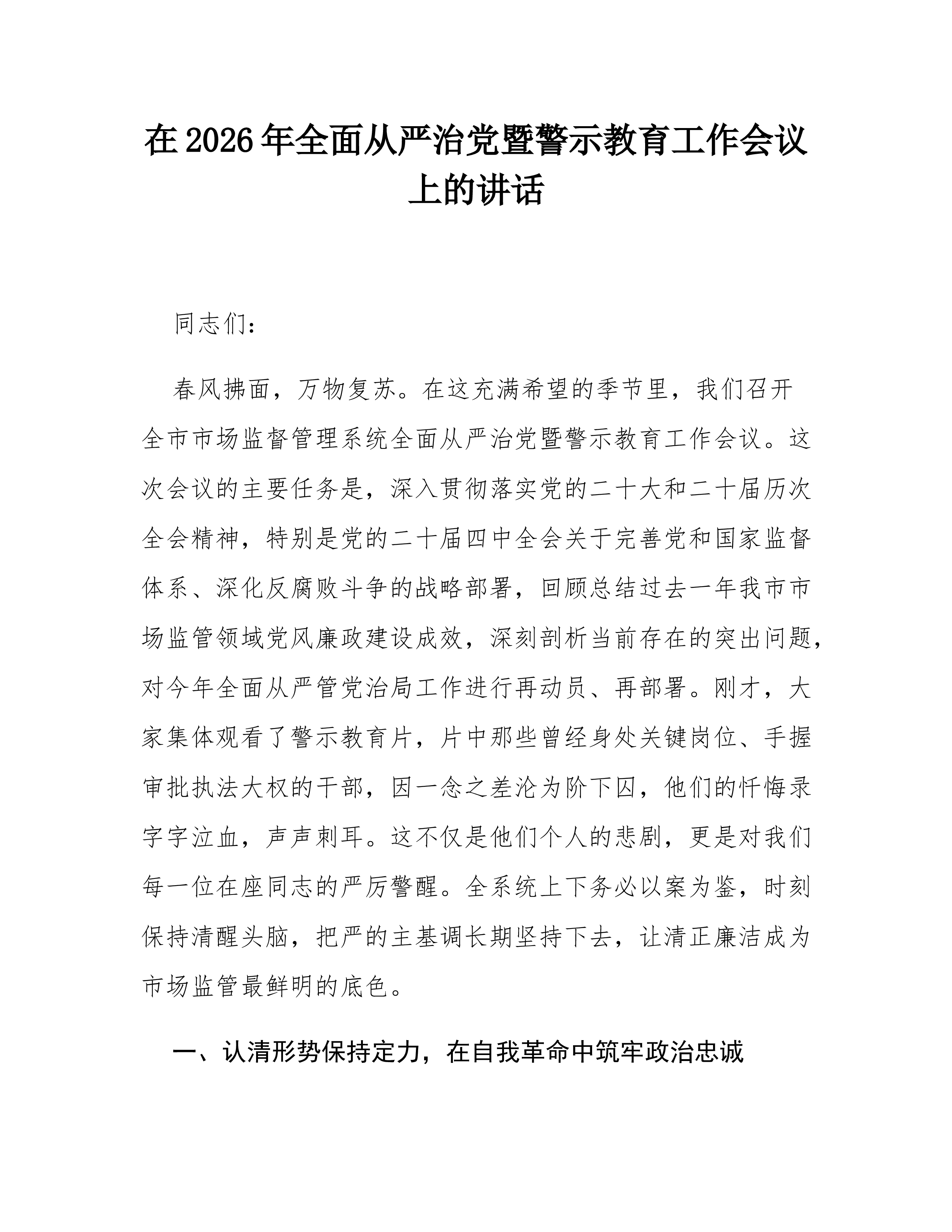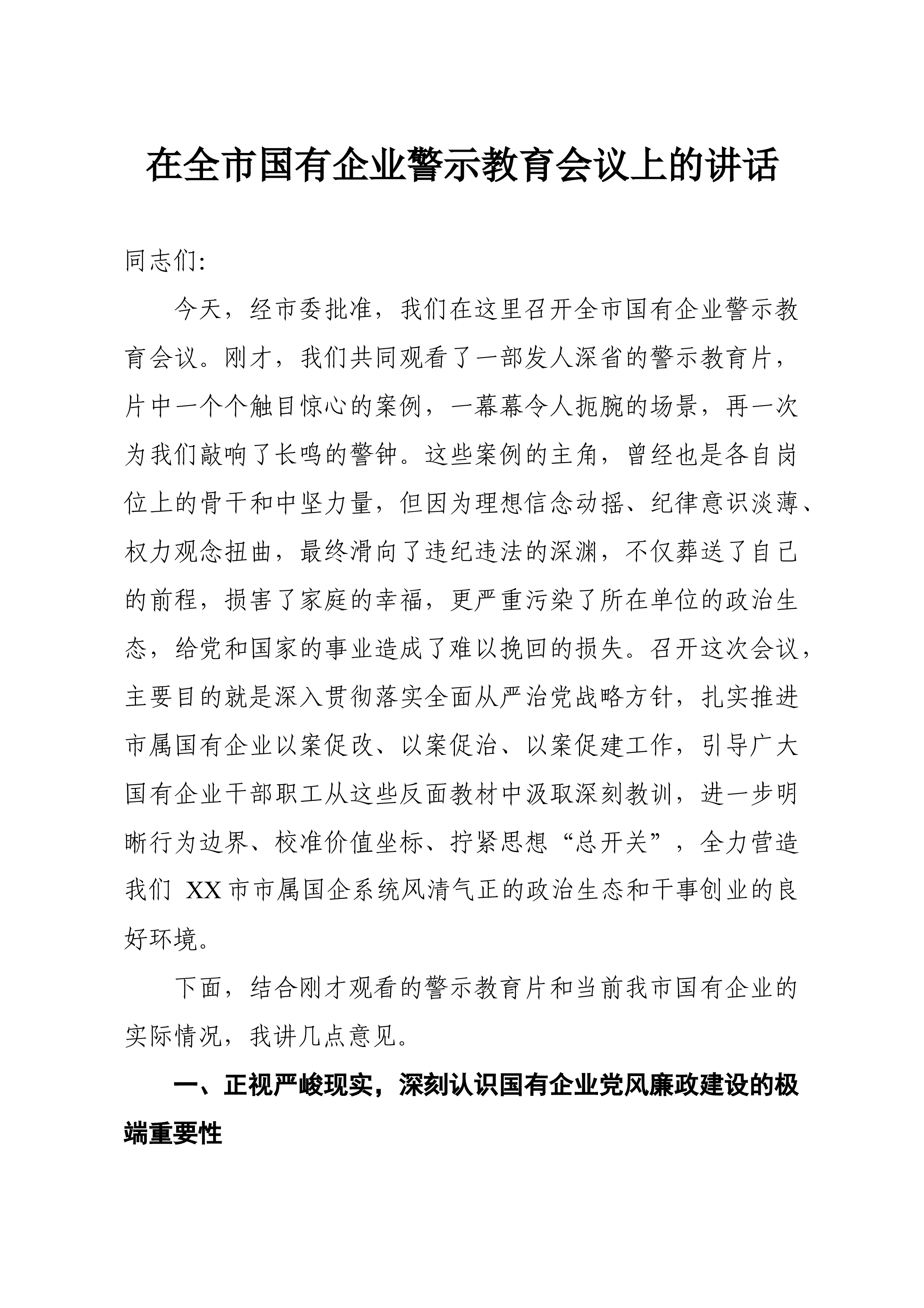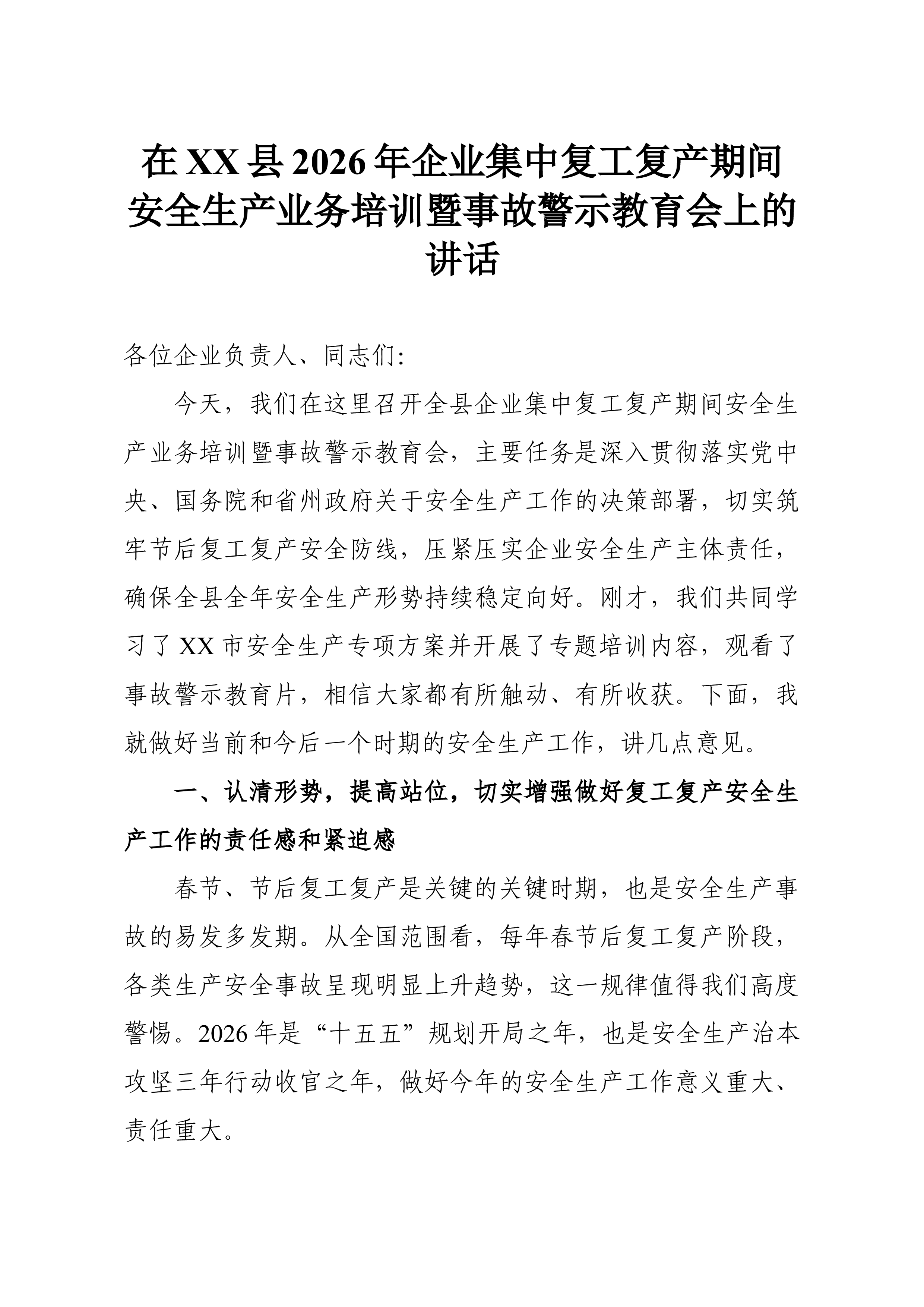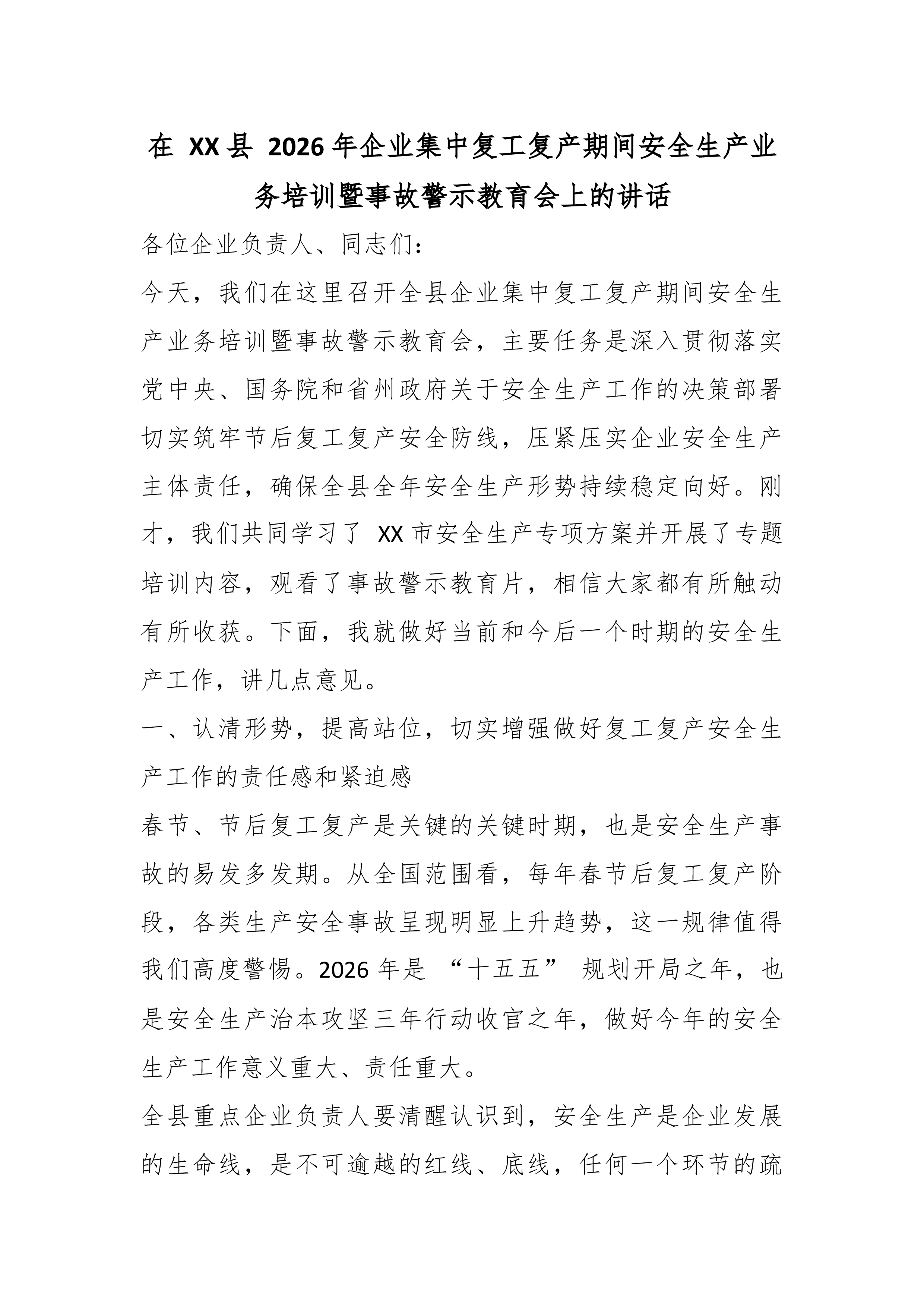 在XX县2026年企业集中复工复产期间安全生产业务培训暨事故警示教育会上的讲话各位企业负责人、同志们:今天,我们在这里召开全县企业集中复工复产期间安全生产业务培训暨事故警示教育会,主要任务是深入贯彻落实党中央、国务院和省州政府关于安全生产工作的决策部署切实筑牢节后复工复产安全防线,压紧压实企业安全生产主体责任,确保全县全年安全生产形势持续稳定向好。刚才,我们共同学习了XX市安全生产专项方案并开展了专题培训内容,观看了事故警示教育片,相信大家都有所触动有所收获。下面,我就做好当前和今后一个时期的安全生产工作,讲几点意见。一、认清形势,提高站位,切实增强做好复工复产安全生产工作的责任感和紧迫感春节、节后复工复产是关键的关键时期,也是安全生产事故的易发多发期。从全国范围看,每年春节后复工复产阶段,...