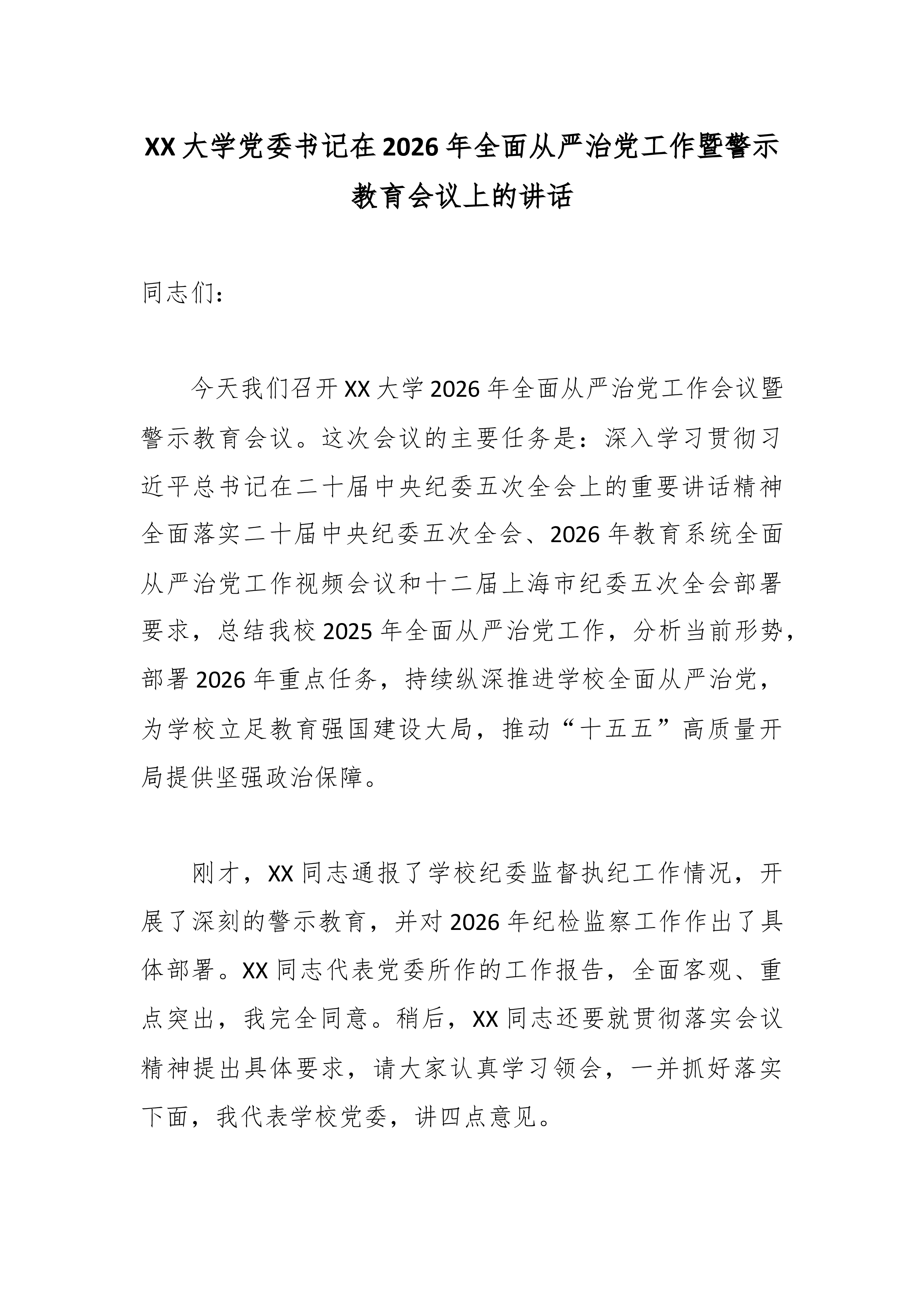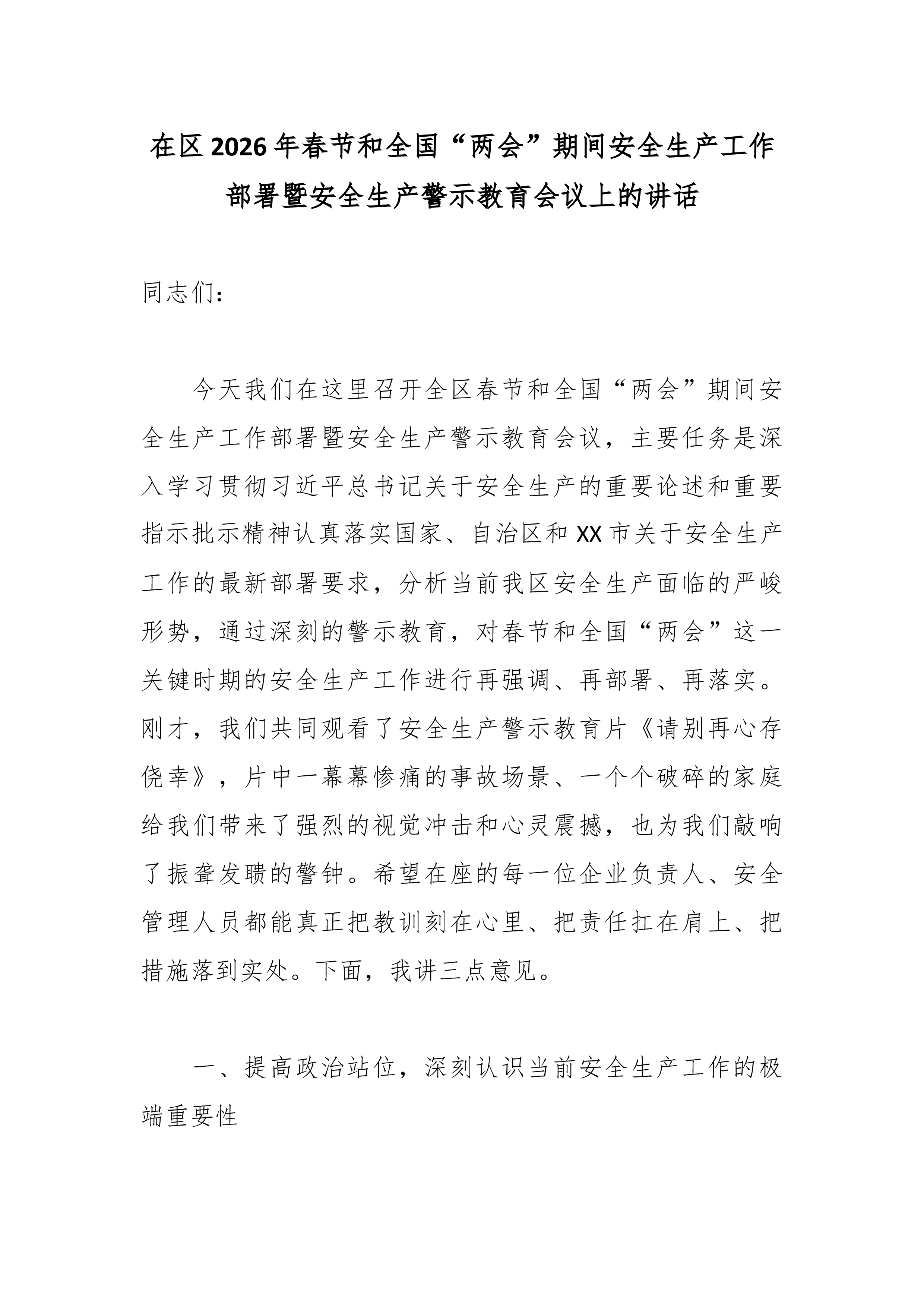 在区2026年春节和全国“两会”期间安全生产工作部署暨安全生产警示教育会议上的讲话同志们: 今天我们在这里召开全区春节和全国“两会”期间安全生产工作部署暨安全生产警示教育会议,主要任务是深入学习贯彻习近平总书记关于安全生产的重要论述和重要指示批示精神认真落实国家、自治区和XX市关于安全生产工作的最新部署要求,分析当前我区安全生产面临的严峻形势,通过深刻的警示教育,对春节和全国“两会”这一关键时期的安全生产工作进行再强调、再部署、再落实。刚才,我们共同观看了安全生产警示教育片《请别再心存侥幸》,片中一幕幕惨痛的事故场景、一个个破碎的家庭给我们带来了强烈的视觉冲击和心灵震撼,也为我们敲响了振聋发聩的警钟。希望在座的每一位企业负责人、安全管理人员都能真正把教训刻在心里、把责任扛在肩上、把措施落到...
