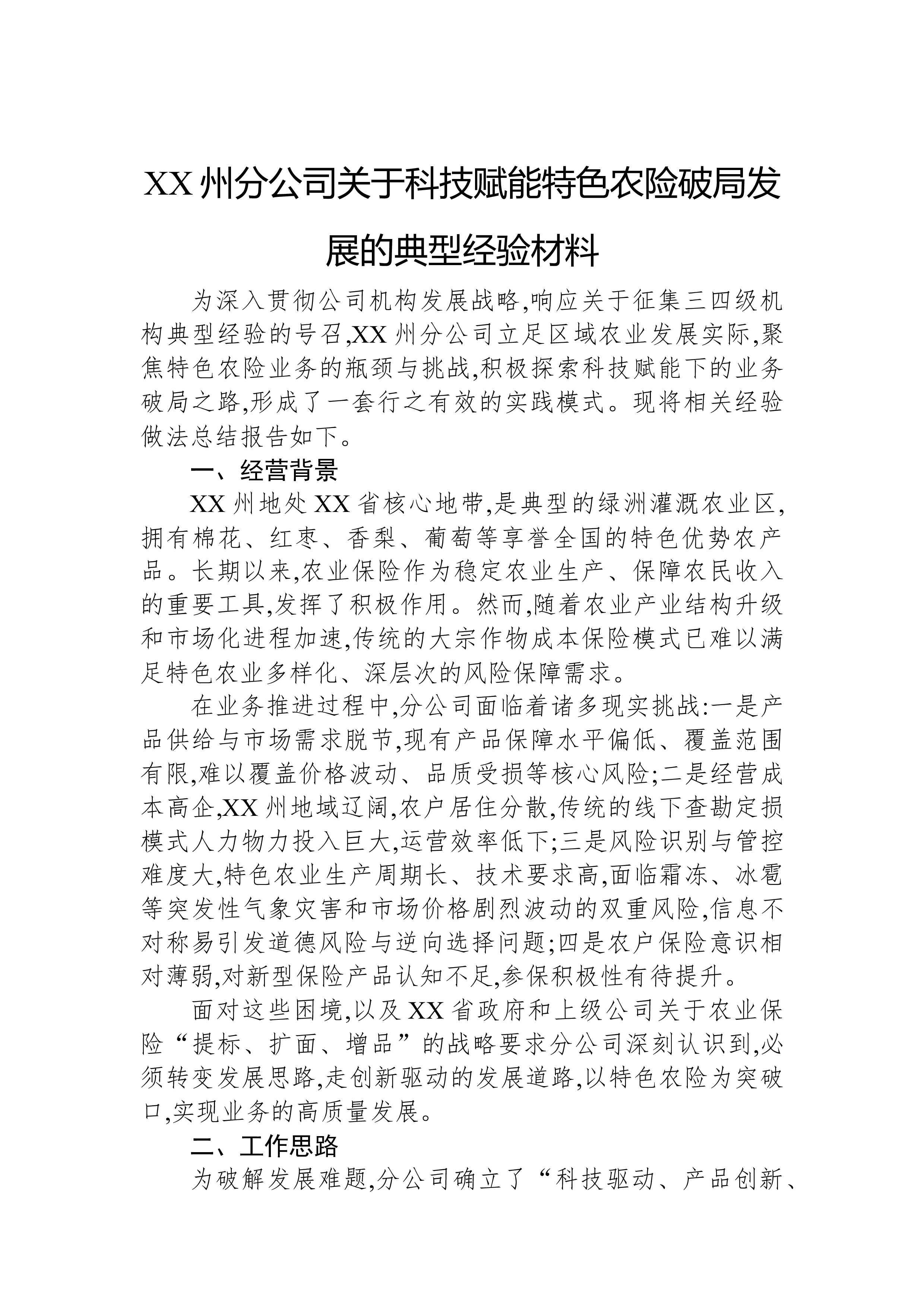 XX州分公司关于科技赋能特色农险破局发展的典型经验材料为深入贯彻公司机构发展战略,响应关于征集三四级机构典型经验的号召,XX州分公司立足区域农业发展实际,聚焦特色农险业务的瓶颈与挑战,积极探索科技赋能下的业务破局之路,形成了一套行之有效的实践模式。现将相关经验做法总结报告如下。一、经营背景XX州地处XX省核心地带,是典型的绿洲灌溉农业区,拥有棉花、红枣、香梨、葡萄等享誉全国的特色优势农产品。长期以来,农业保险作为稳定农业生产、保障农民收入的重要工具,发挥了积极作用。然而,随着农业产业结构升级和市场化进程加速,传统的大宗作物成本保险模式已难以满足特色农业多样化、深层次的风险保障需求。在业务推进过程中,分公司面临着诸多现实挑战:一是产品供给与市场需求脱节,现有产品保障水平偏低、覆盖范围有限,难以...