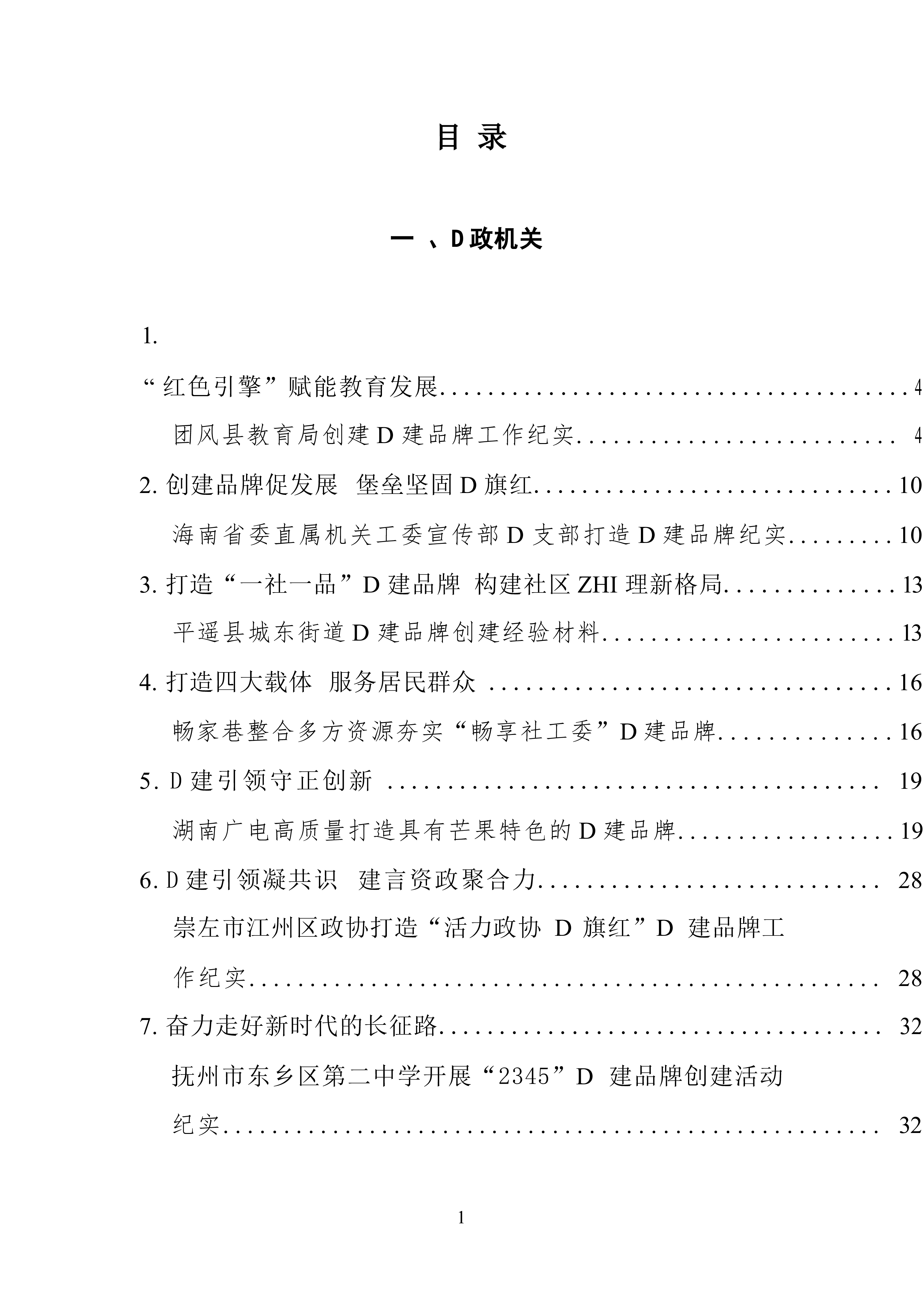 目录一、D政机关1.“红色引擎”赋能教育发展.......................................4团风县教育局创建D建品牌工作纪实..........................42.创建品牌促发展堡垒坚固D旗红..............................10海南省委直属机关工委宣传部D支部打造D建品牌纪实.........103.打造“一社一品”D建品牌构建社区ZHI理新格局..............13平遥县城东街道D建品牌创建经验材料........................134.打造四大载体服务居民群众.................................16畅家巷整合多方资源夯实“畅享社工委”D建品牌..........