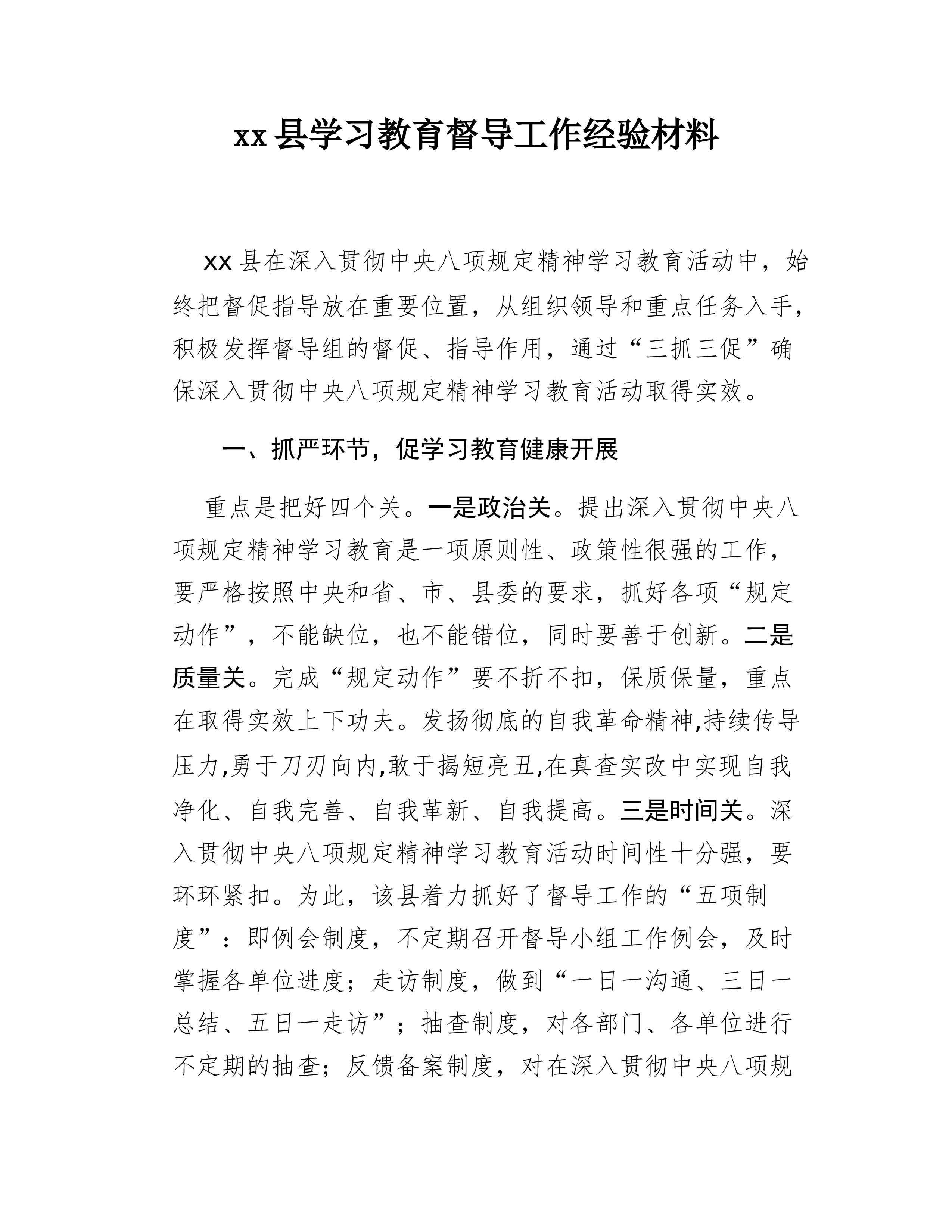 xx县学习教育督导工作经验材料xx县在深入贯彻中央八项规定精神学习教育活动中,始终把督促指导放在重要位置,从组织领导和重点任务入手,积极发挥督导组的督促、指导作用,通过“三抓三促”确保深入贯彻中央八项规定精神学习教育活动取得实效。一、抓严环节,促学习教育健康开展重点是把好四个关。一是政治关。提出深入贯彻中央八项规定精神学习教育是一项原则性、政策性很强的工作,要严格按照中央和省、市、县委的要求,抓好各项“规定动作”,不能缺位,也不能错位,同时要善于创新。二是质量关。完成“规定动作”要不折不扣,保质保量,重点在取得实效上下功夫。发扬彻底的自我革命精神,持续传导压力,勇于刀刃向内,敢于揭短亮丑,在真查实改中实现自我净化、自我完善、自我革新、自我提高。三是时间关。深入贯彻中央八项规定精神学习教育活动...