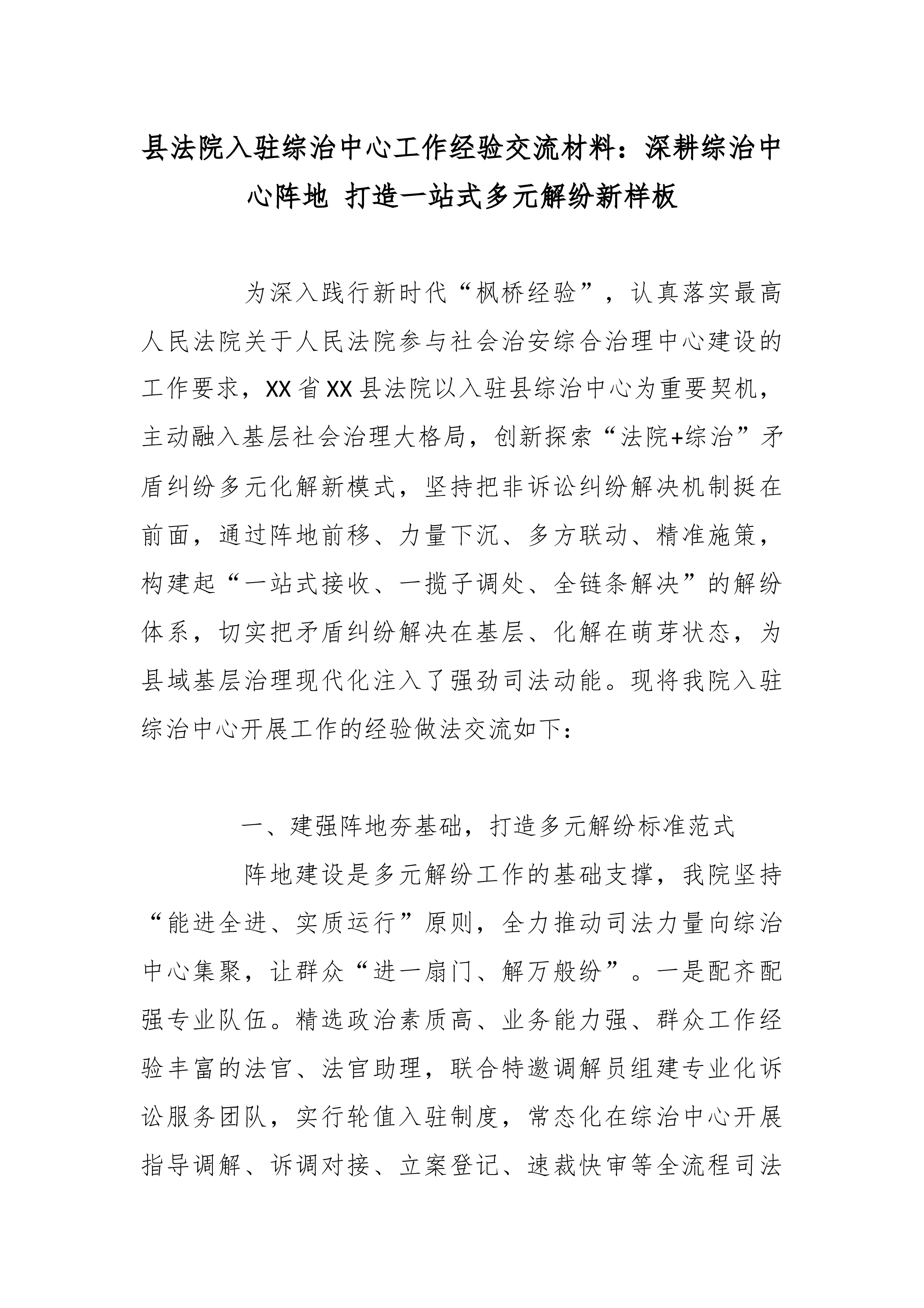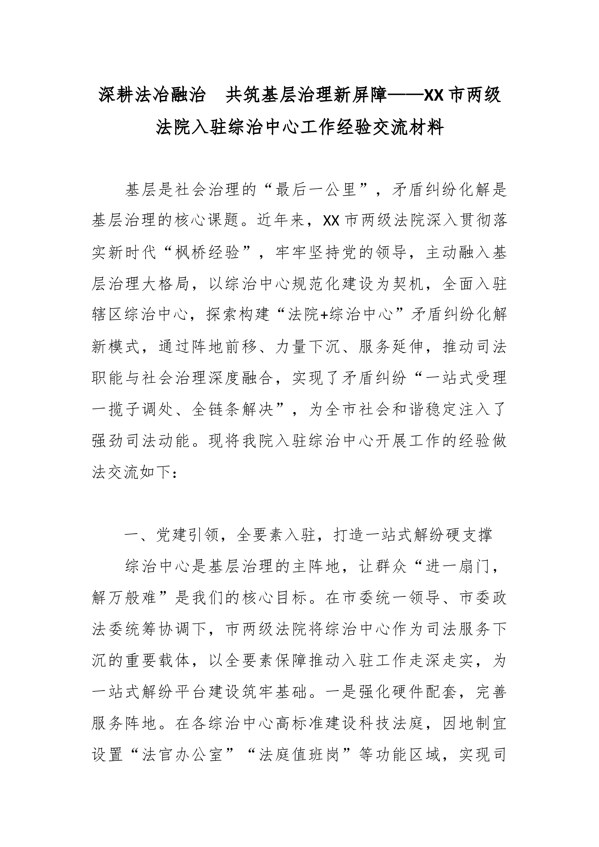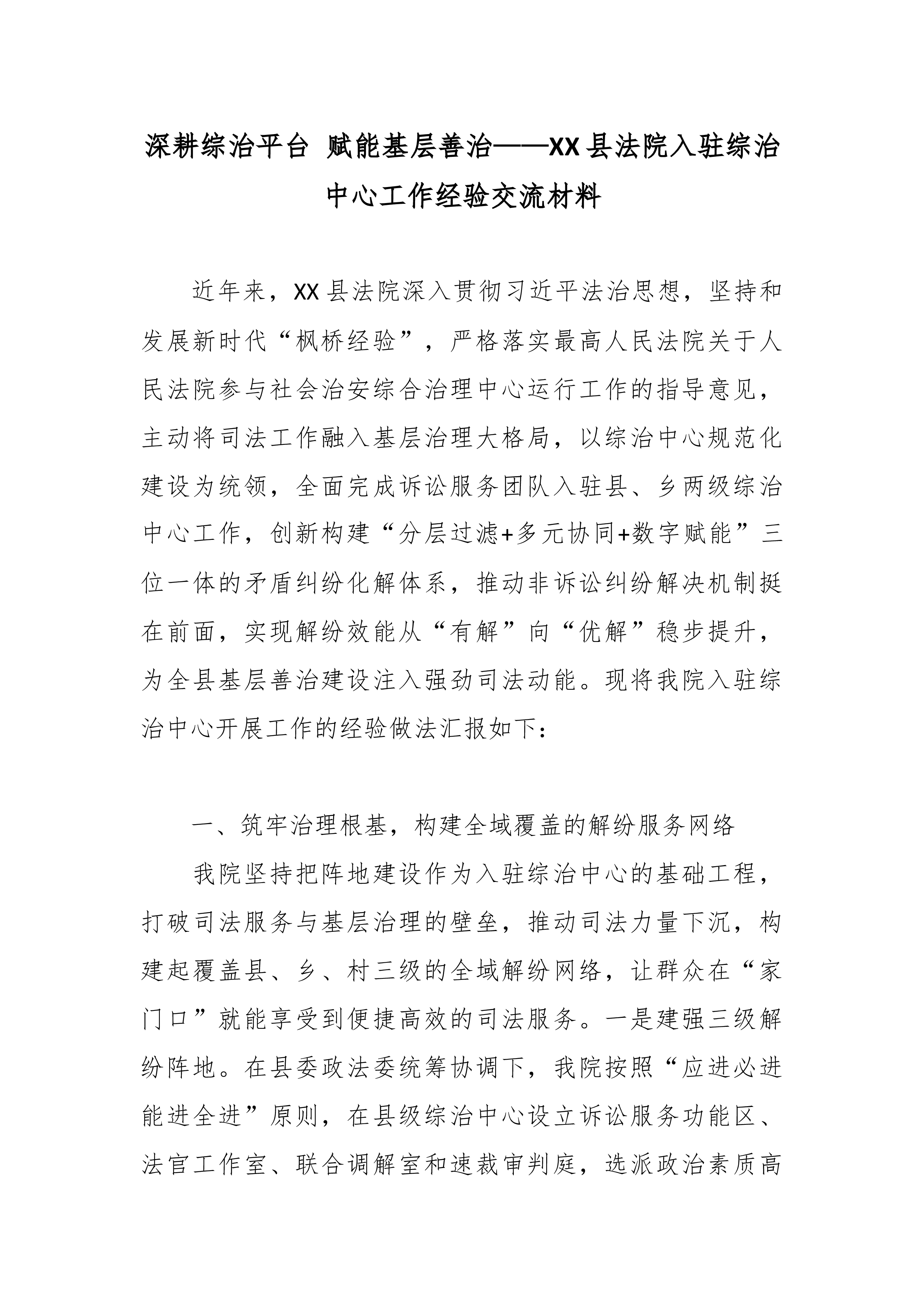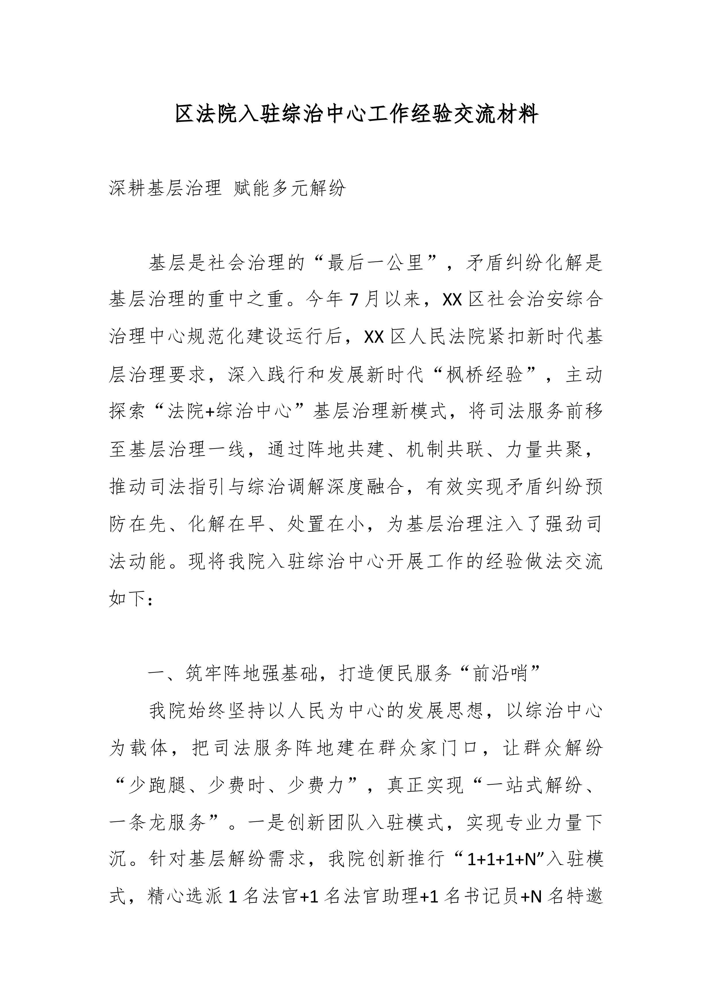 下沉司法力量 深耕基层治理——XX区人民法院入驻综治中心推动多元解纷提质增效经验交流材料
