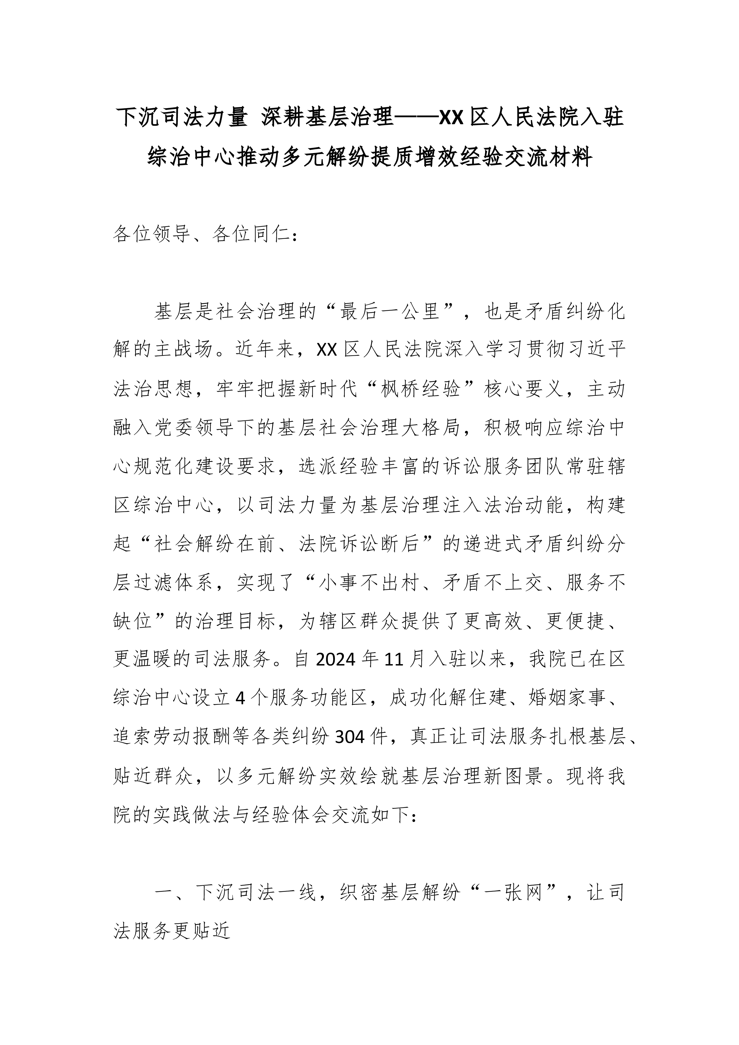 下沉司法力量深耕基层治理——XX区人民法院入驻综治中心推动多元解纷提质增效经验交流材料各位领导、各位同仁: 基层是社会治理的“最后一公里”,也是矛盾纠纷化解的主战场。近年来,XX区人民法院深入学习贯彻习近平法治思想,牢牢把握新时代“枫桥经验”核心要义,主动融入党委领导下的基层社会治理大格局,积极响应综治中心规范化建设要求,选派经验丰富的诉讼服务团队常驻辖区综治中心,以司法力量为基层治理注入法治动能,构建起“社会解纷在前、法院诉讼断后”的递进式矛盾纠纷分层过滤体系,实现了“小事不出村、矛盾不上交、服务不缺位”的治理目标,为辖区群众提供了更高效、更便捷、更温暖的司法服务。自2024年11月入驻以来,我院已在区综治中心设立4个服务功能区,成功化解住建、婚姻家事、追索劳动报酬等各类纠纷304件,真...