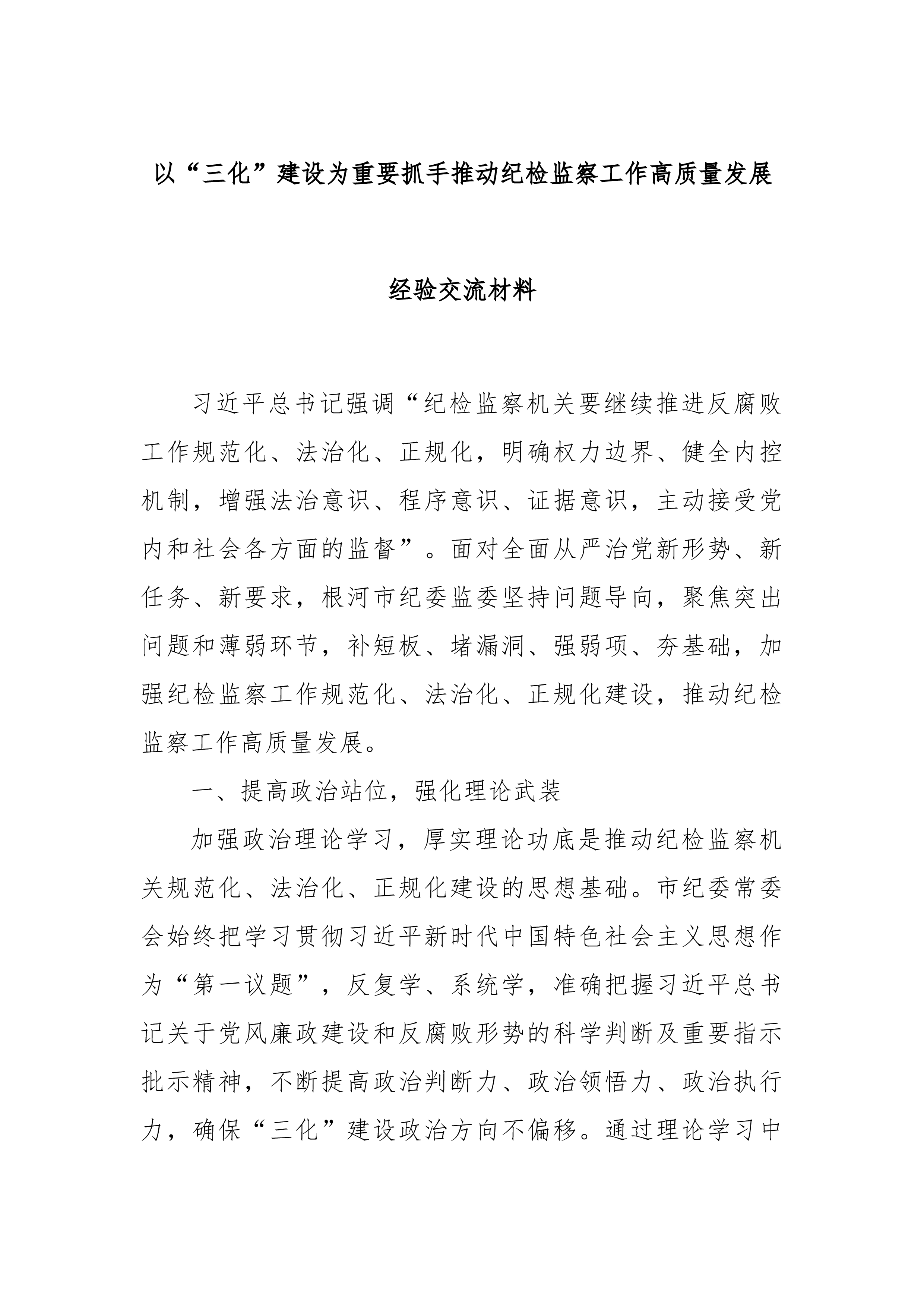 以“三化”建设为重要抓手推动纪检监察工作高质量发展经验交流材料习近平总书记强调“纪检监察机关要继续推进反腐败工作规范化、法治化、正规化,明确权力边界、健全内控机制,增强法治意识、程序意识、证据意识,主动接受党内和社会各方面的监督”。面对全面从严治党新形势、新任务、新要求,根河市纪委监委坚持问题导向,聚焦突出问题和薄弱环节,补短板、堵漏洞、强弱项、夯基础,加强纪检监察工作规范化、法治化、正规化建设,推动纪检监察工作高质量发展。一、提高政治站位,强化理论武装加强政治理论学习,厚实理论功底是推动纪检监察机关规范化、法治化、正规化建设的思想基础。市纪委常委会始终把学习贯彻习近平新时代中国特色社会主义思想作为“第一议题”,反复学、系统学,准确把握习近平总书记关于党风廉政建设和反腐败形势的科学判断及重要...