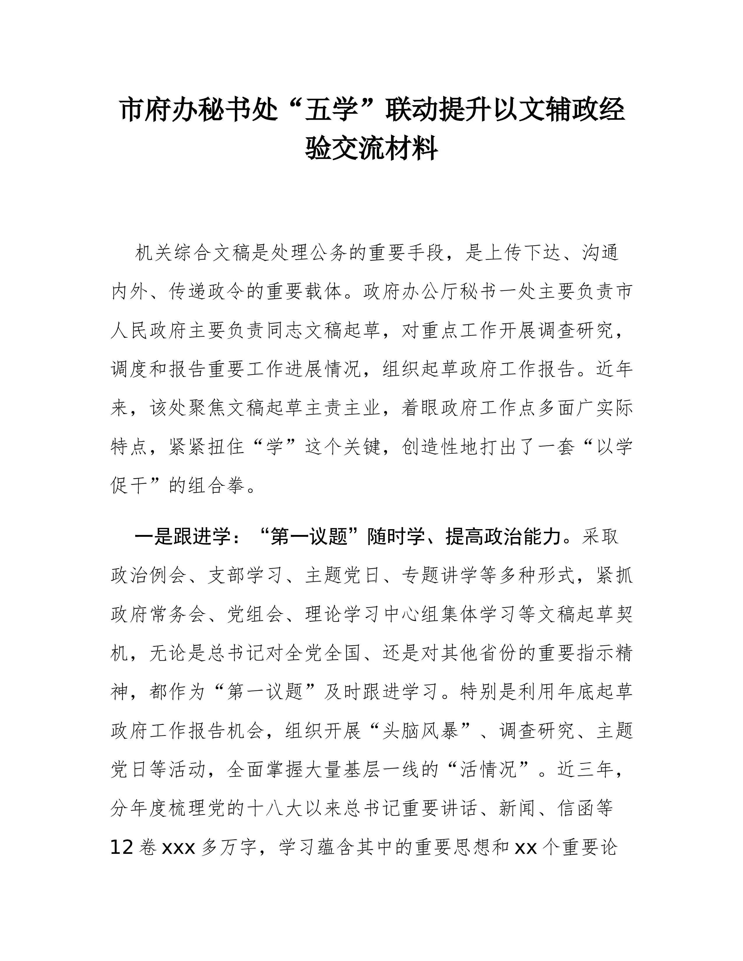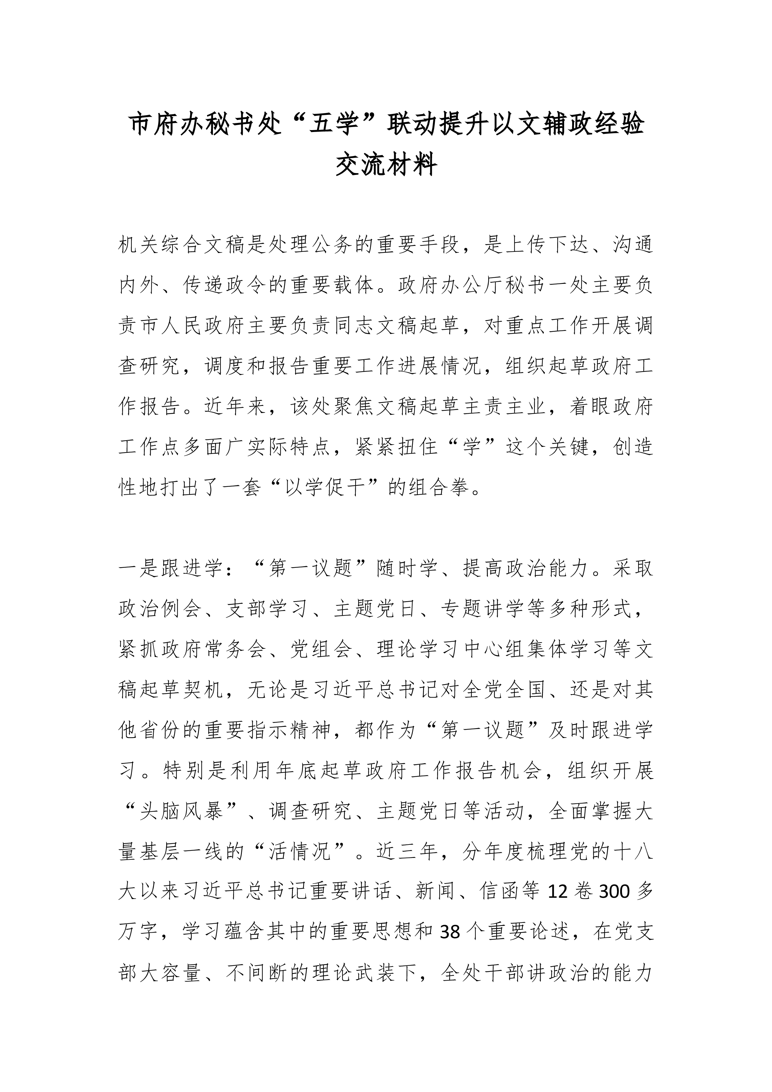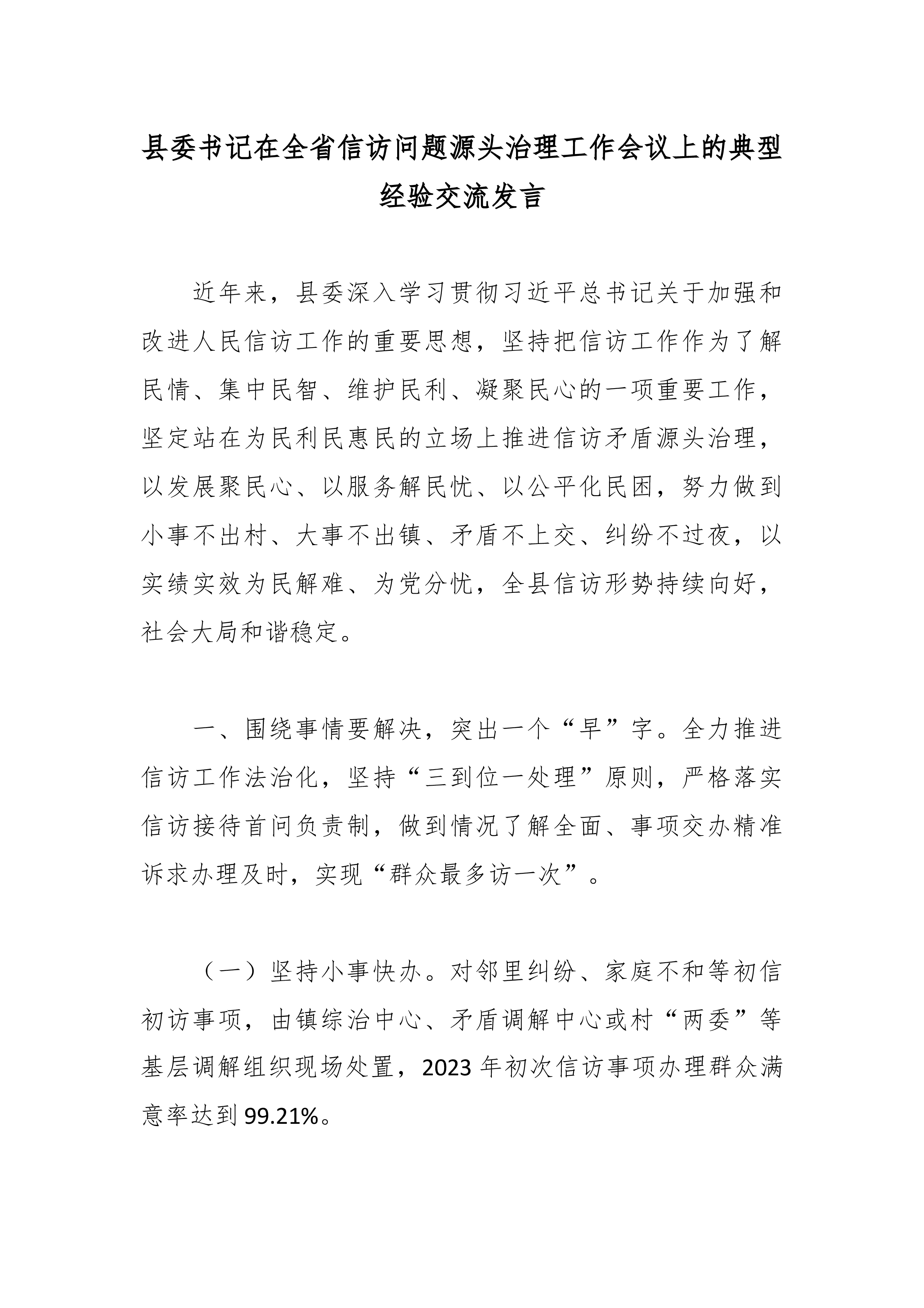 县委书记在全省信访问题源头治理工作会议上的典型经验交流发言 近年来,县委深入学习贯彻习近平总书记关于加强和改进人民信访工作的重要思想,坚持把信访工作作为了解民情、集中民智、维护民利、凝聚民心的一项重要工作,坚定站在为民利民惠民的立场上推进信访矛盾源头治理,以发展聚民心、以服务解民忧、以公平化民困,努力做到小事不出村、大事不出镇、矛盾不上交、纠纷不过夜,以实绩实效为民解难、为党分忧,全县信访形势持续向好,社会大局和谐稳定。 一、围绕事情要解决,突出一个“早”字。全力推进信访工作法治化,坚持“三到位一处理”原则,严格落实信访接待首问负责制,做到情况了解全面、事项交办精准诉求办理及时,实现“群众最多访一次”。 (一)坚持小事快办。对邻里纠纷、家庭不和等初信初访事项,由镇综治中心、矛盾调解中心...