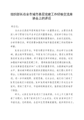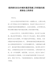 组织部长在全市城市基层党建工作经验交流座谈会上的讲话 同志们:这次会议是经市委同意召开的一次重要会议。主要任务是深入学习贯彻习近平总书记系列重要讲话,系统学习领会习近平总书记关于加强城市基层党建的重要指示,总结交流经验,分析形势任务,研究部署加强我市城市基层党建工作的思路和举措。X省会议召开后,市委专题召开常委会,传达学习会议精神,提出我市贯彻意见。市委X专门作出批示,要求认真贯彻落实好X省会议精神,学习借鉴兄弟市好做法、好经验,切实加强我市城市基层党建工作。要积极推进基层党建创新发展,充分发挥基层党组织和广大党员的重要作用,为提高城市治理水平、推动城市建设发展提供坚强组织保证。我们要认真学习...