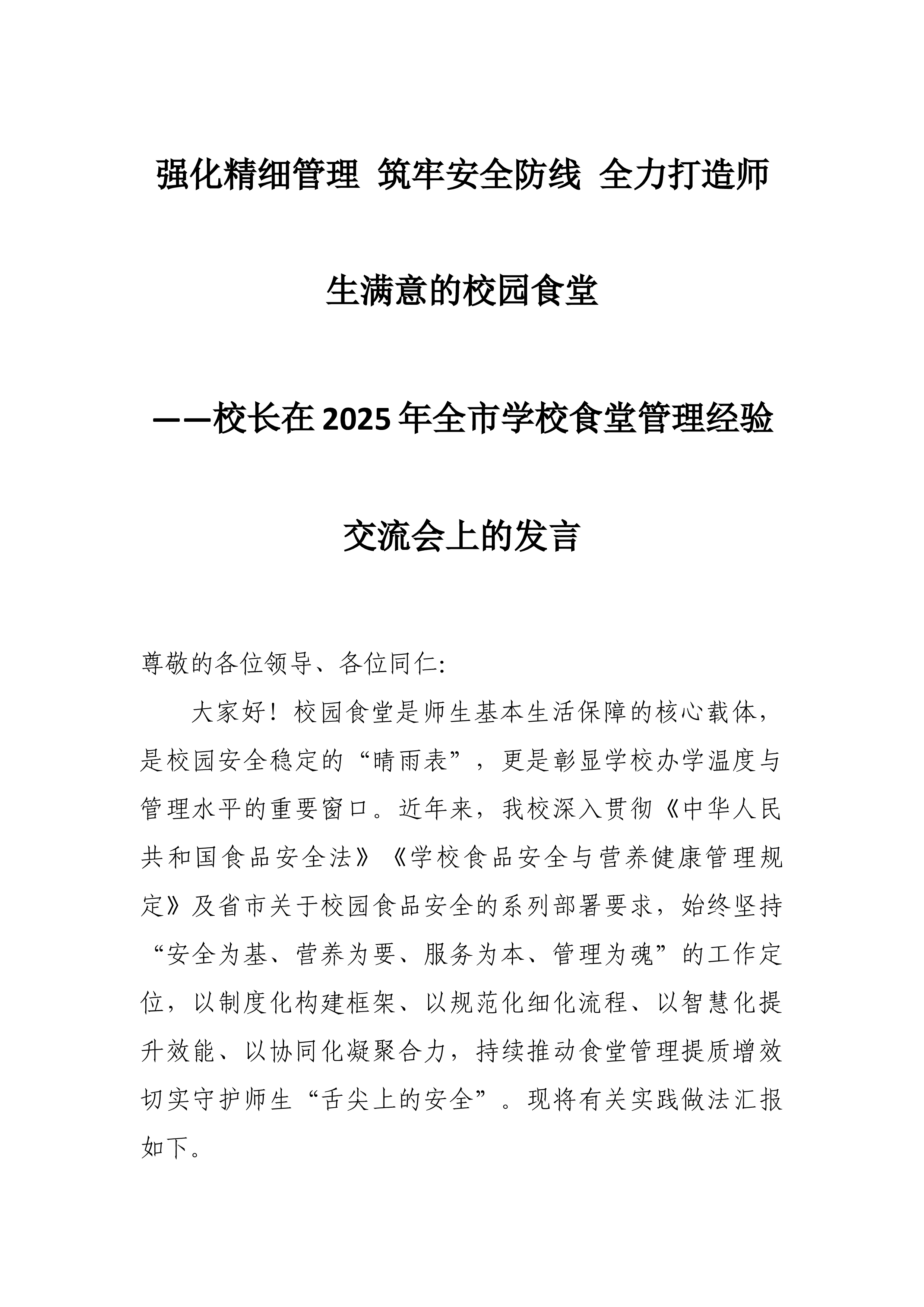 强化精细管理筑牢安全防线全力打造师生满意的校园食堂——校长在2025年全市学校食堂管理经验交流会上的发言尊敬的各位领导、各位同仁:大家好!校园食堂是师生基本生活保障的核心载体,是校园安全稳定的“晴雨表”,更是彰显学校办学温度与管理水平的重要窗口。近年来,我校深入贯彻《中华人民共和国食品安全法》《学校食品安全与营养健康管理规定》及省市关于校园食品安全的系列部署要求,始终坚持“安全为基、营养为要、服务为本、管理为魂”的工作定位,以制度化构建框架、以规范化细化流程、以智慧化提升效能、以协同化凝聚合力,持续推动食堂管理提质增效切实守护师生“舌尖上的安全”。现将有关实践做法汇报如下。一、健全制度体系,夯实管理“压舱石”始终把制度建设作为食堂管理的根本性工作,构建“全流程覆盖、全责任闭环、全要素保障”的...