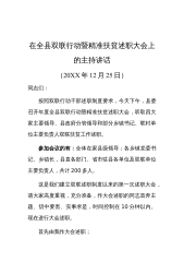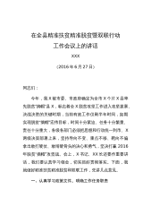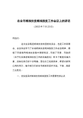 在全市精准扶贫精准脱贫工作会议上的讲话(2015年7月23日)同志们: 这次会议既是精准扶贫的思想动员会,也是工作部署会。会议传达学习了全省精准扶贫精准脱贫工作会议精神,通报了市级领导精准扶贫集中调研情况,印发了市委、市政府《关于扎实推进精准扶贫工作的实施意见》和9个配套实施方案,目标任务已经十分明确,责任分工也很具体,希望大家同心同向同力,集中精力打好全市精准扶贫歼灭战。下面,我讲三点意见:一、切实提高对精准扶贫精准脱贫工作重要性的认识精准扶贫是相对于粗放扶贫而言的,是运用科学有效程序对扶贫对象实施精确识别、精确帮扶、精确管理的治贫方式,是对传统扶贫体制机制的创新和发展。党的十八大以来,党...