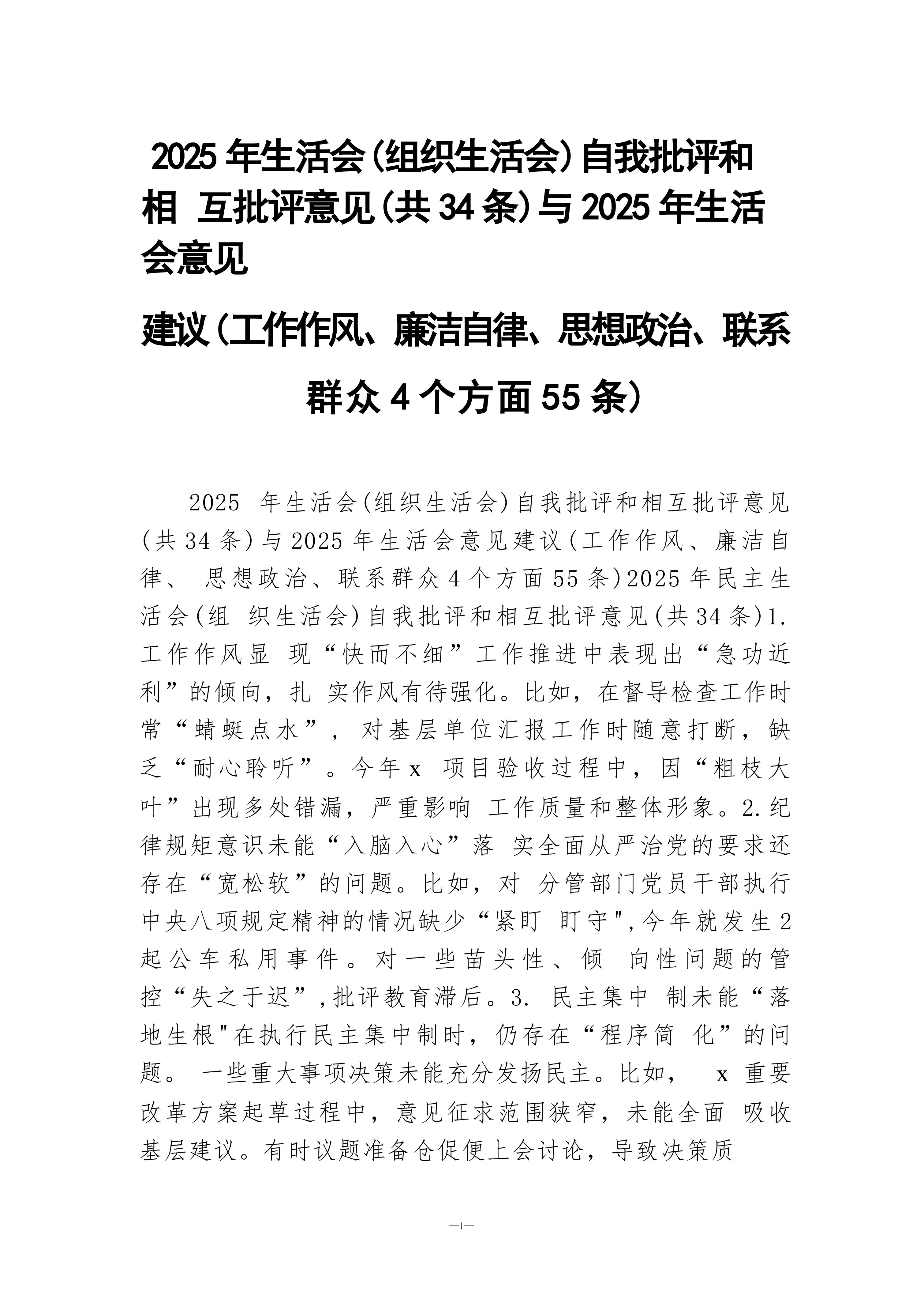 2025年生活会(组织生活会)自我批评和相互批评意见(共34条)与2025年生活会意见建议(工作作风、廉洁自律、思想政治、联系群众4个方面55条)