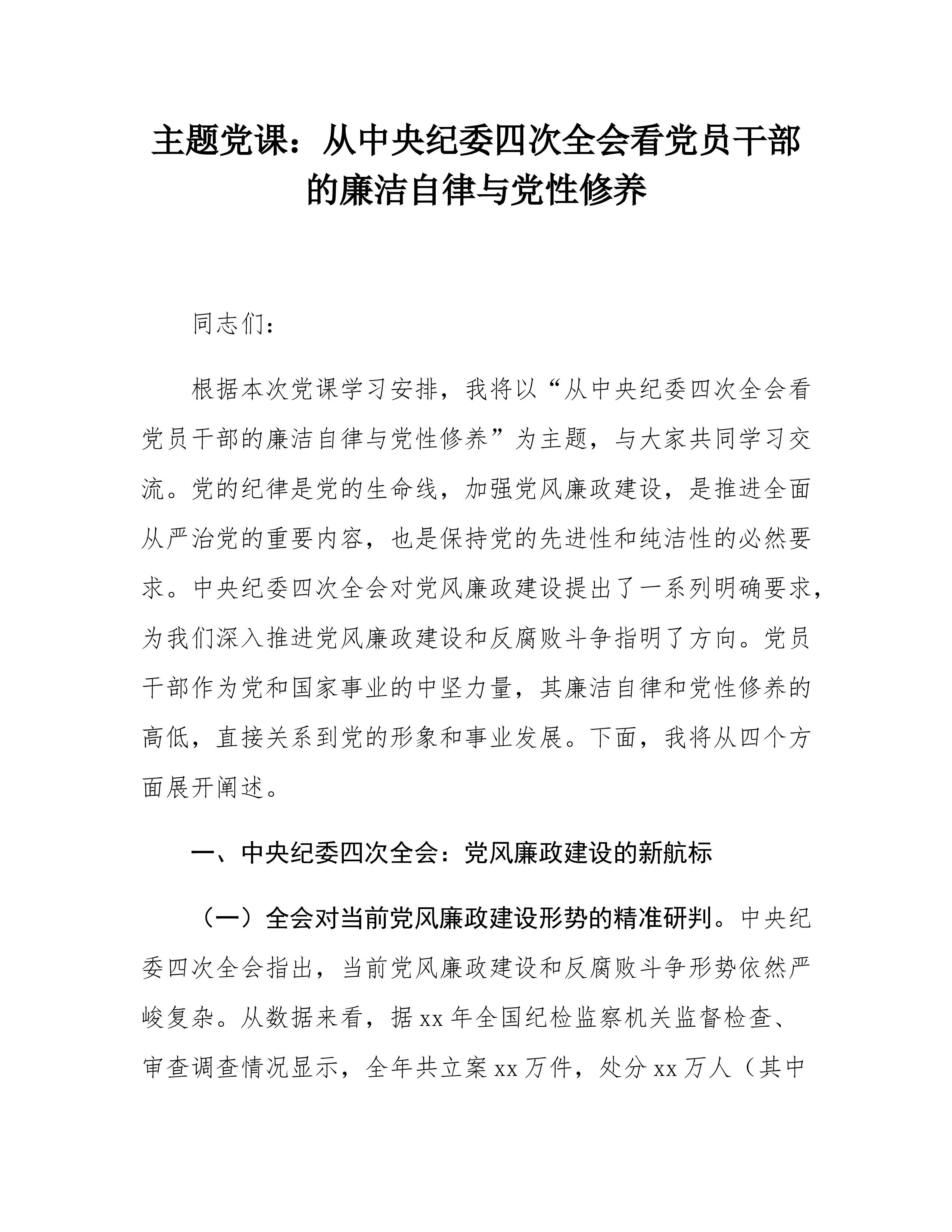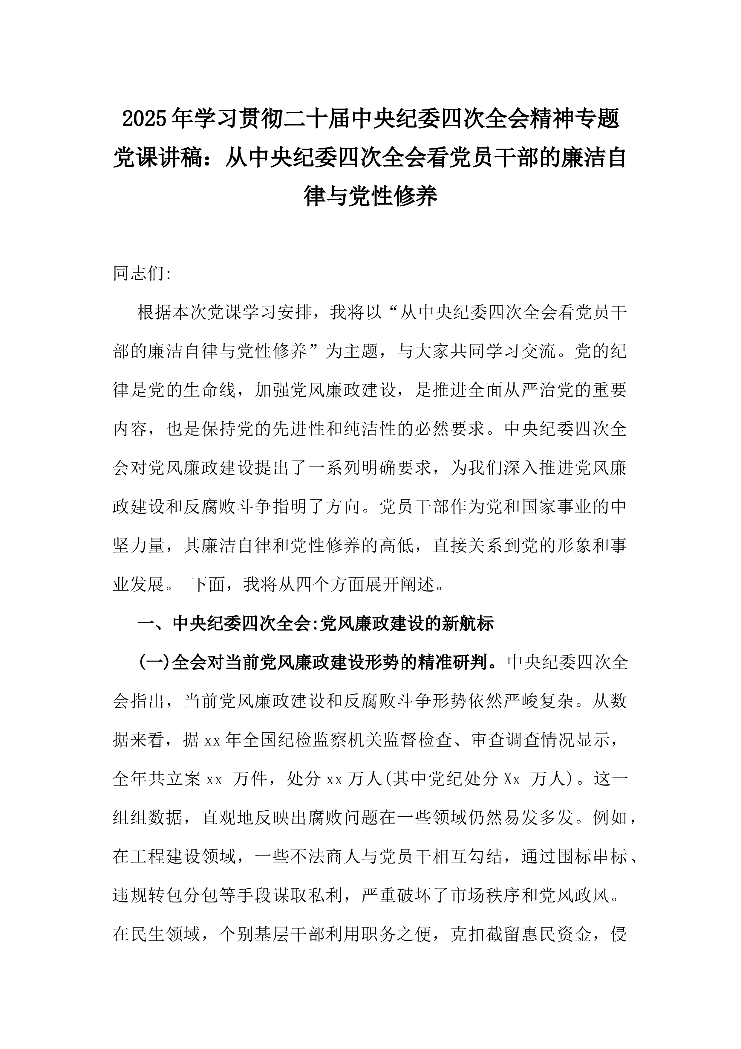 2025年学习贯彻二十届中央纪委四次全会精神专题党课讲稿:从中央纪委四次全会看党员干部的廉洁自律与党性修养