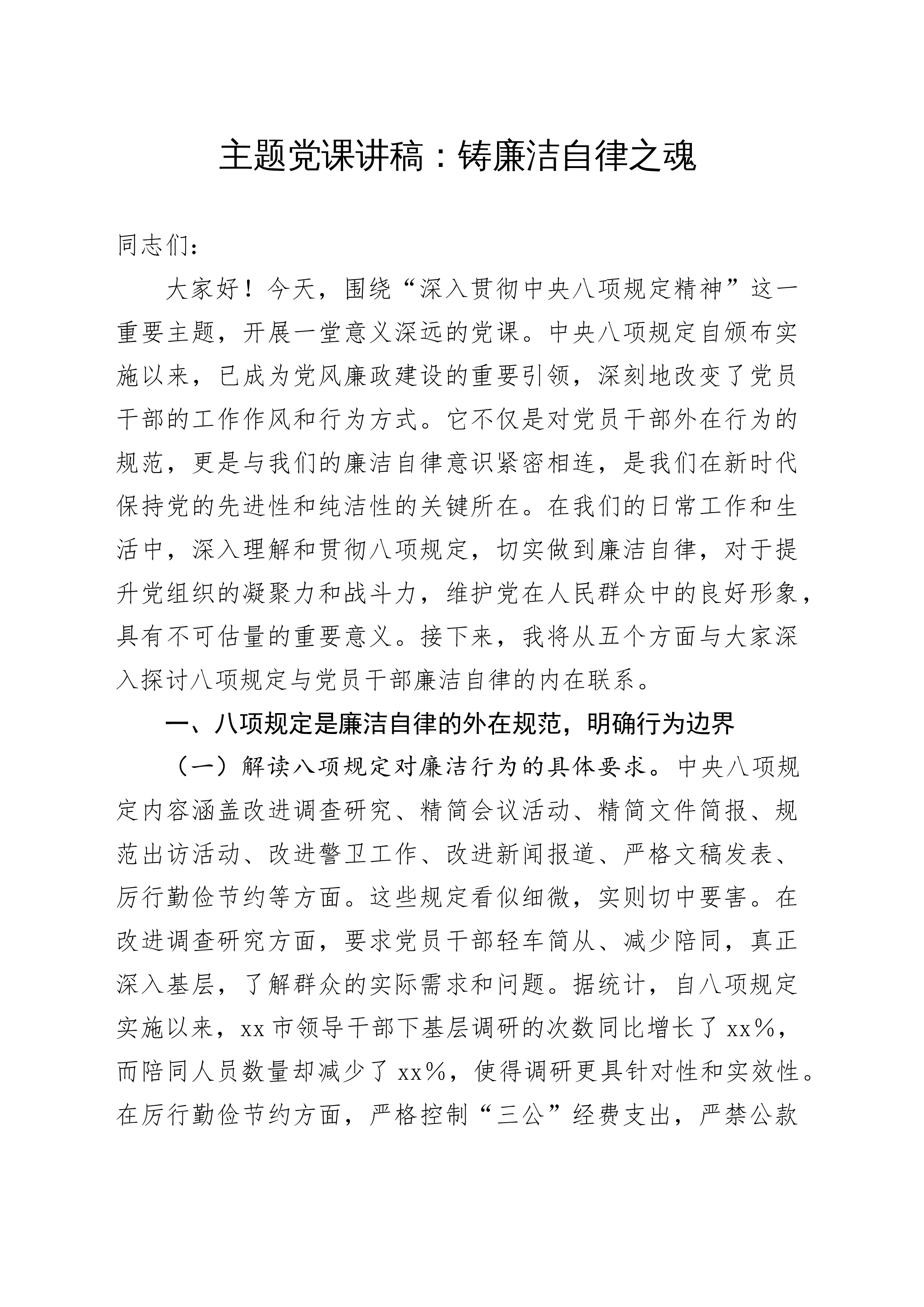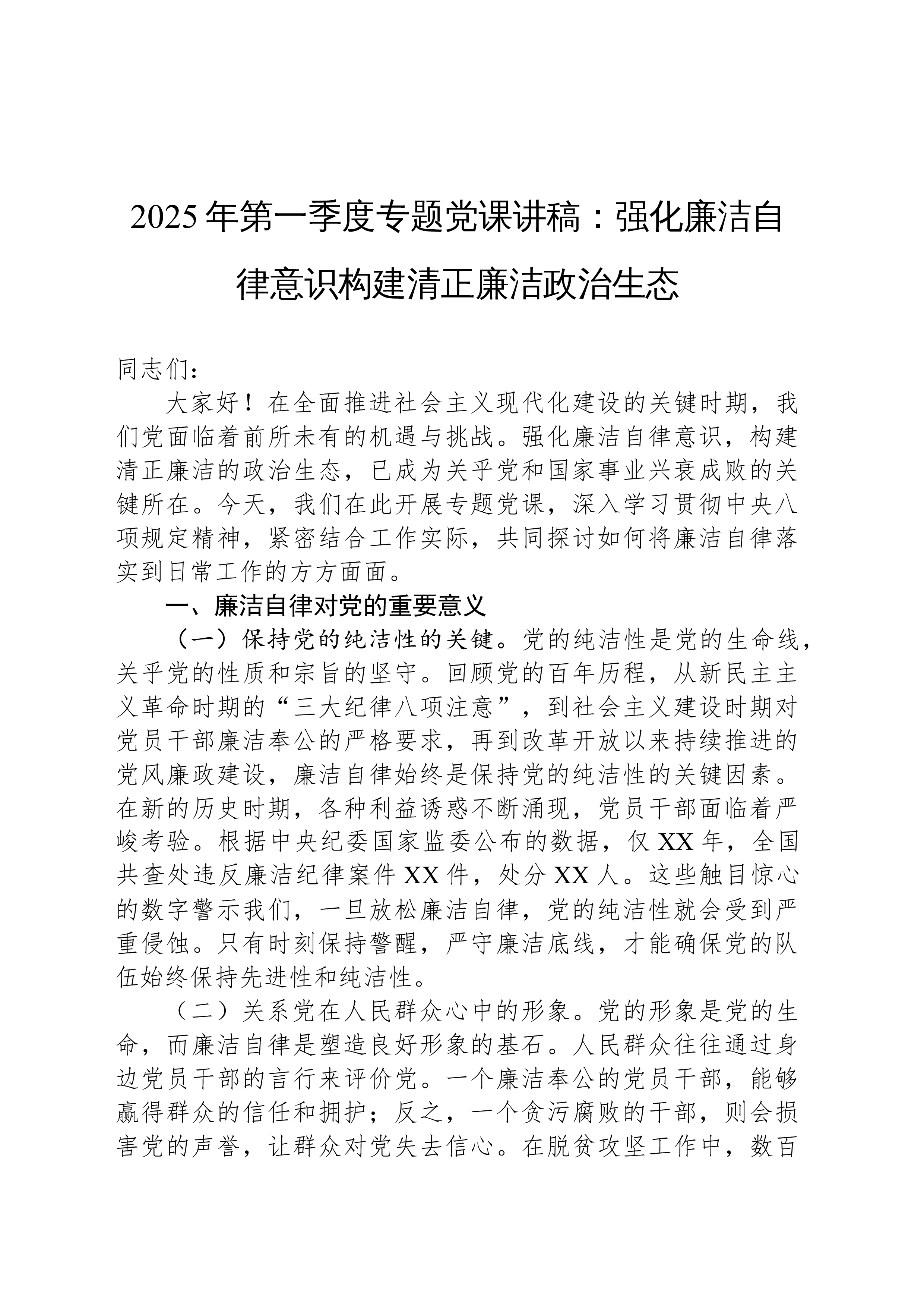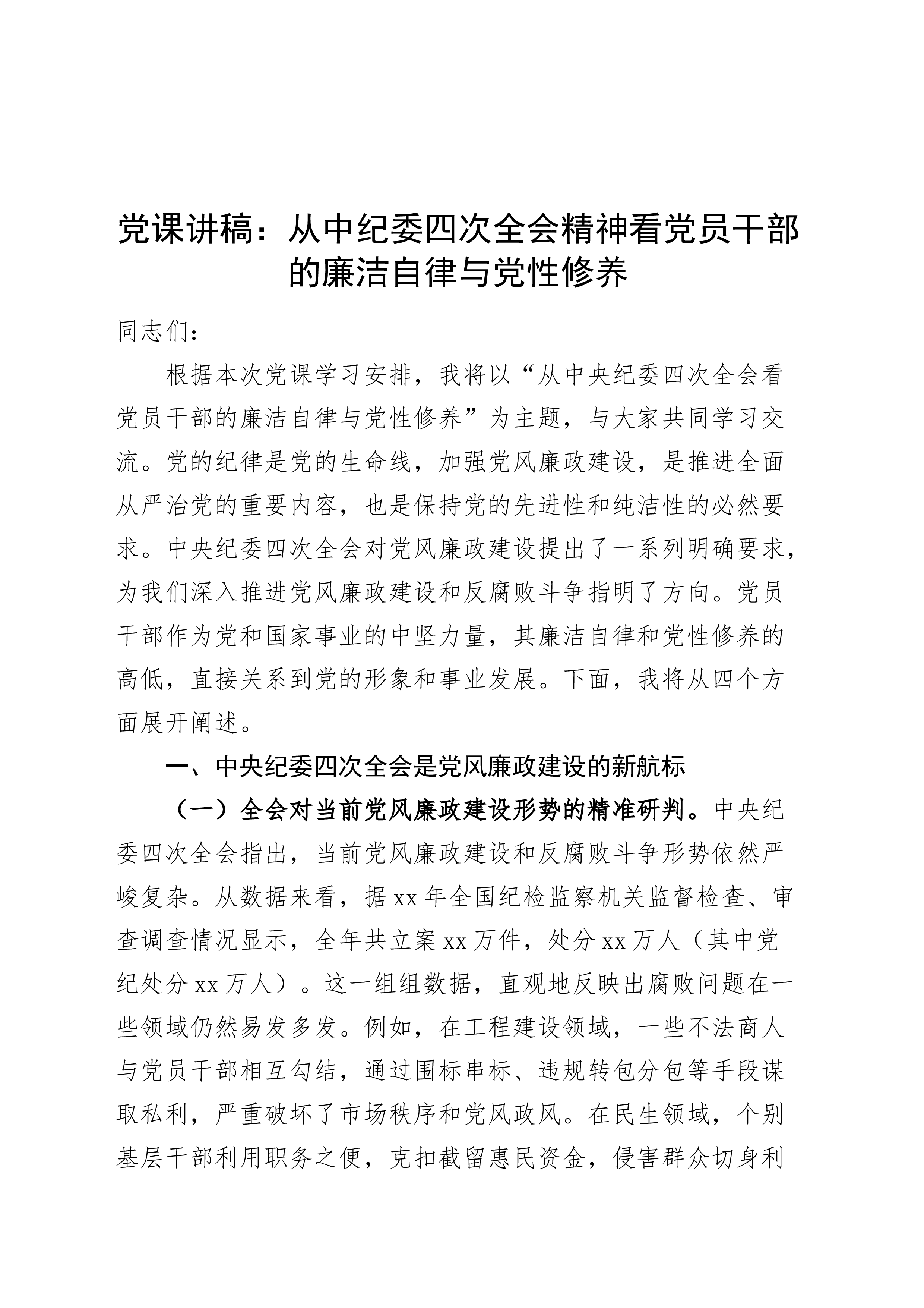 2025年学习贯彻二十届中央纪委四次全会精神专题党课讲稿:从中央纪委四次全会看党员干部的廉洁自律与党性修养同志们:根据本次党课学习安排,我将以“从中央纪委四次全会看党员干部的廉洁自律与党性修养”为主题,与大家共同学习交流。党的纪律是党的生命线,加强党风廉政建设,是推进全面从严治党的重要内容,也是保持党的先进性和纯洁性的必然要求。中央纪委四次全会对党风廉政建设提出了一系列明确要求,为我们深入推进党风廉政建设和反腐败斗争指明了方向。党员干部作为党和国家事业的中坚力量,其廉洁自律和党性修养的高低,直接关系到党的形象和事业发展。下面,我将从四个方面展开阐述。一、中央纪委四次全会:党风廉政建设的新航标(...