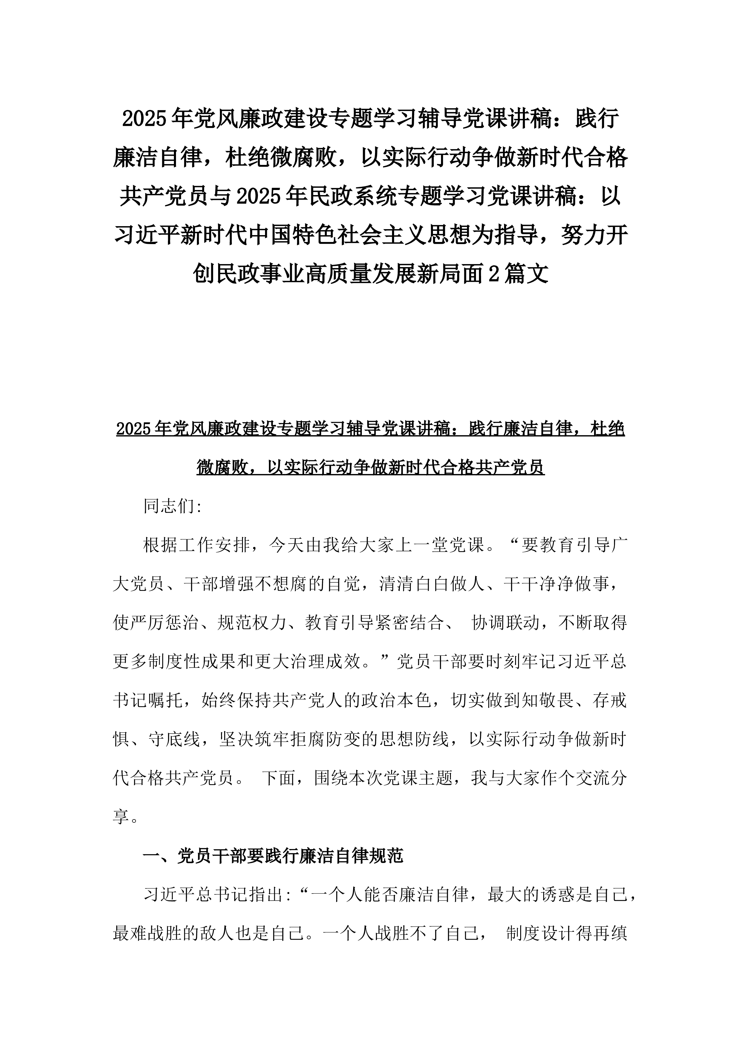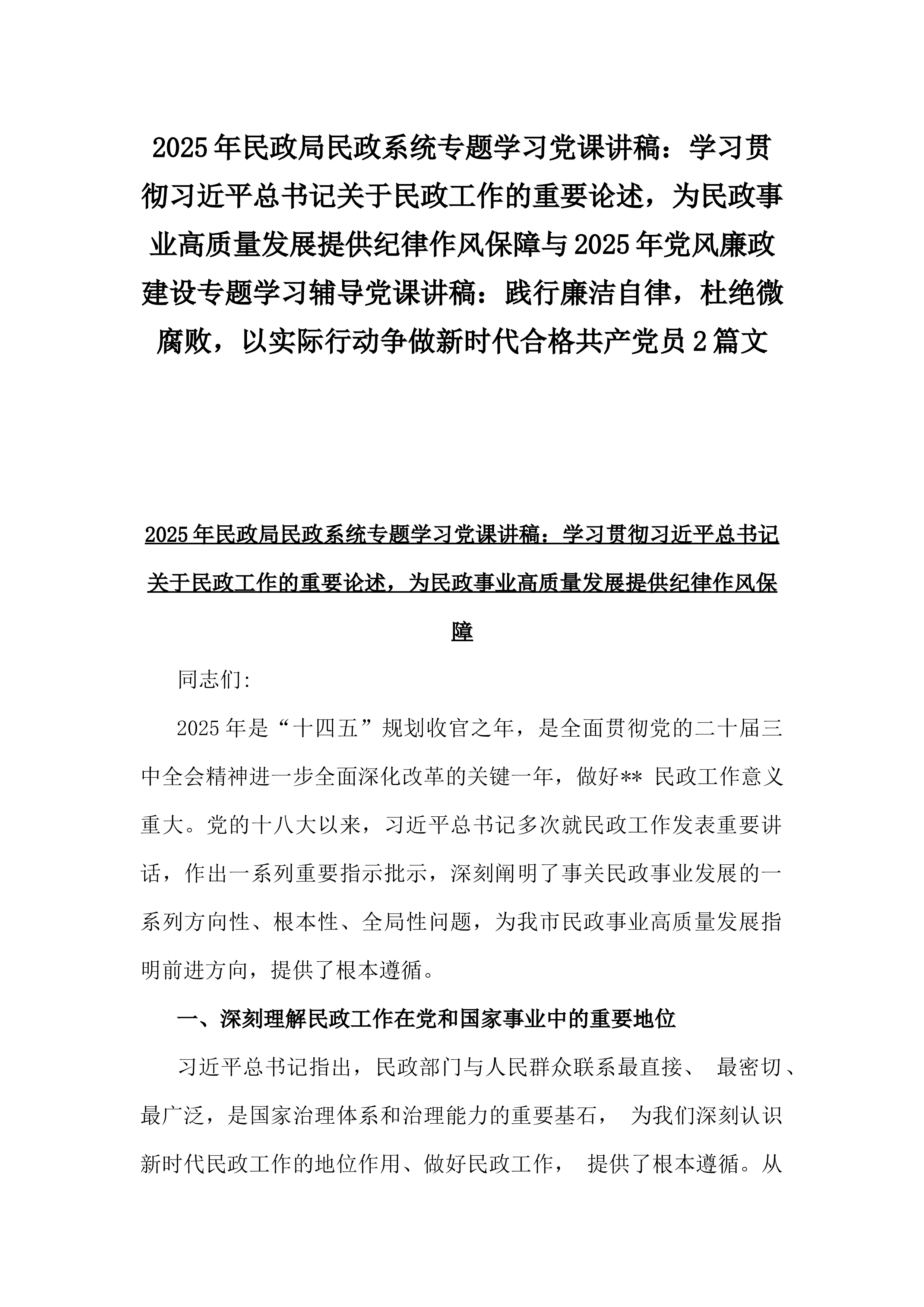 2025年民政局民政系统专题学习党课讲稿:学习贯彻习近平总书记关于民政工作的重要论述,为民政事业高质量发展提供纪律作风保障与2025年党风廉政建设专题学习辅导党课讲稿:践行廉洁自律,杜绝微腐败,以实际行动争做新时代合格共产党员2篇文