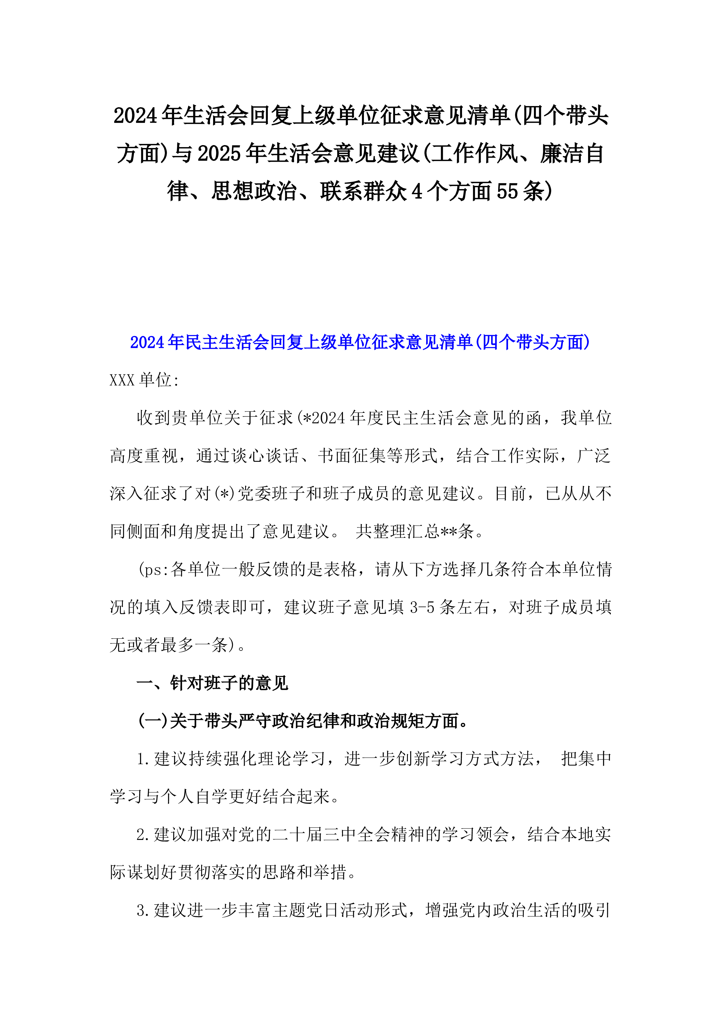 2024年生活会回复上级单位征求意见清单(四个带头方面)与2025年生活会意见建议(工作作风、廉洁自律、思想政治、联系群众4个方面55条)2024年民主生活会回复上级单位征求意见清单(四个带头方面)XXX单位:收到贵单位关于征求(*2024年度民主生活会意见的函,我单位高度重视,通过谈心谈话、书面征集等形式,结合工作实际,广泛深入征求了对(*)党委班子和班子成员的意见建议。目前,已从从不同侧面和角度提出了意见建议。共整理汇总**条。(ps:各单位一般反馈的是表格,请从下方选择几条符合本单位情况的填入反馈表即可,建议班子意见填3-5条左右,对班子成员填无或者最多一条)。一、针对班子的意见(一)关...