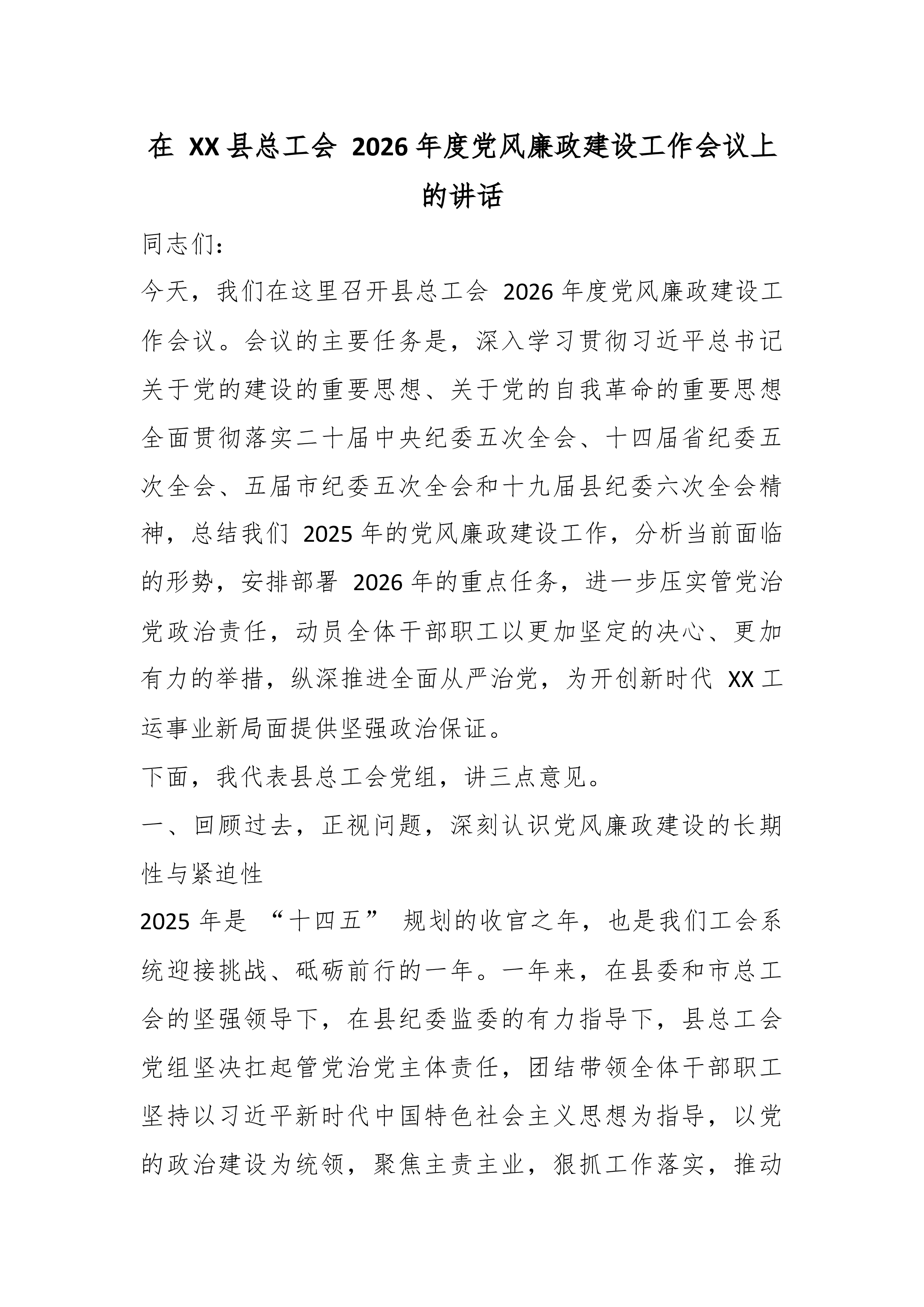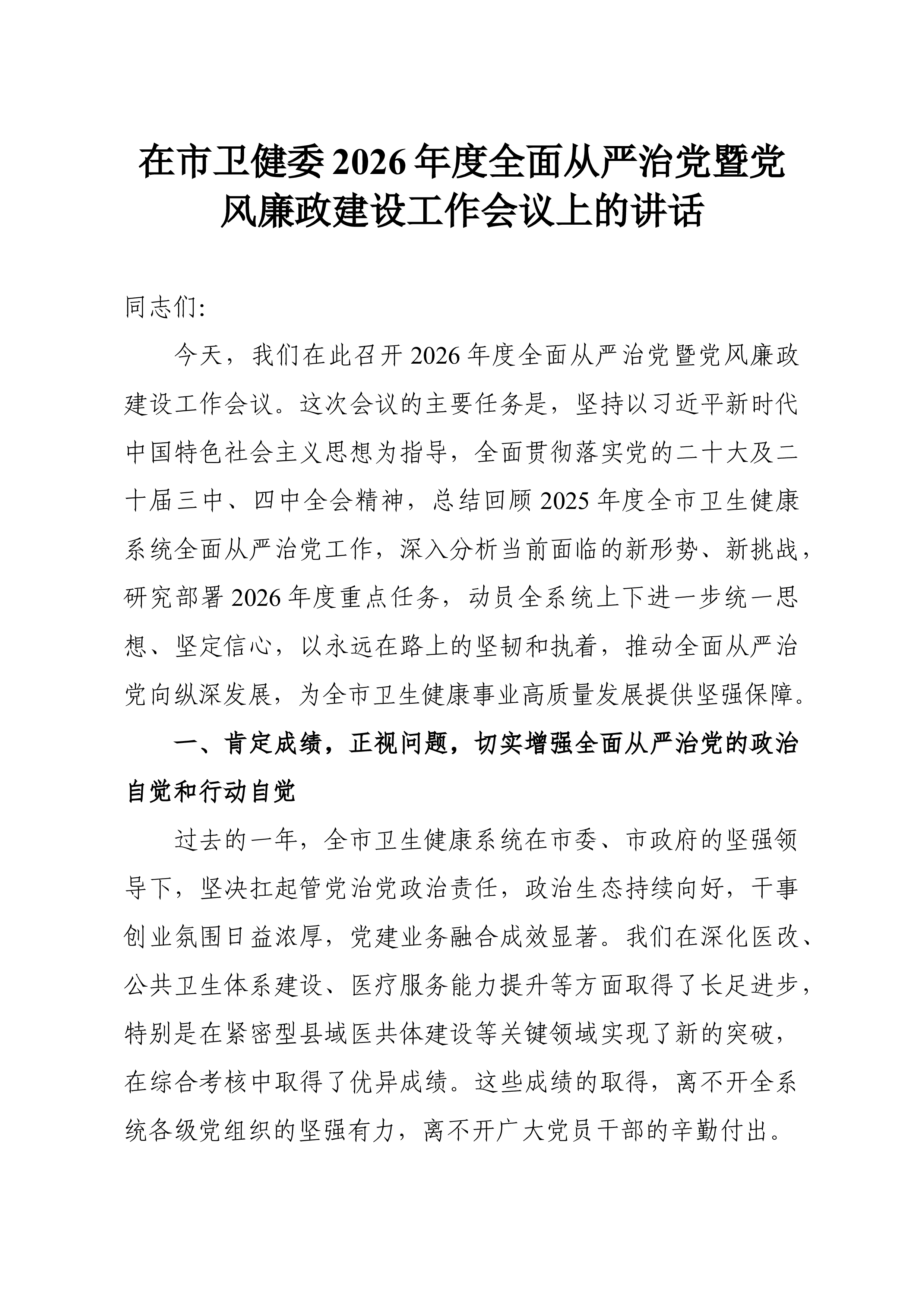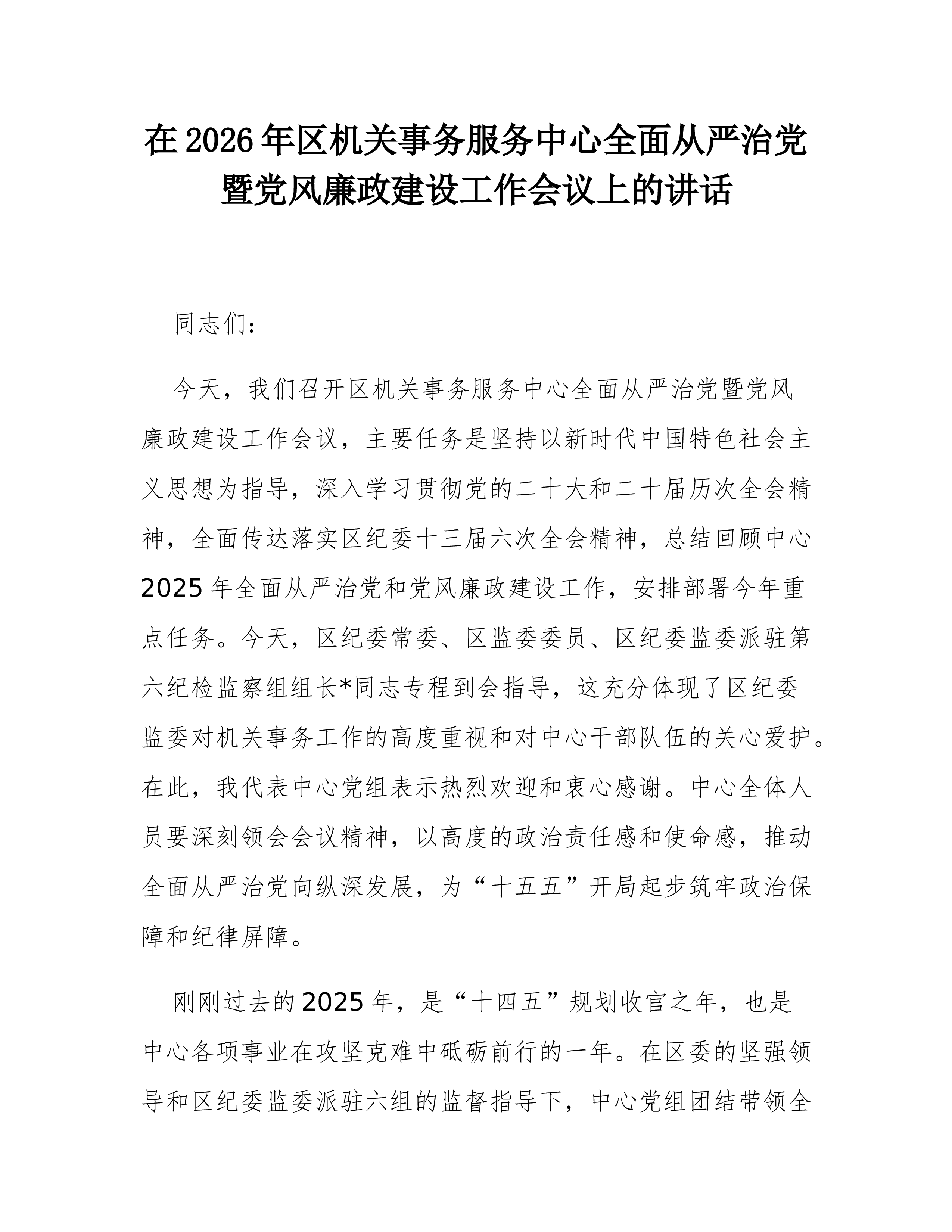 在2026年区机关事务服务中心全面从严治党暨党风廉政建设工作会议上的讲话同志们:今天,我们召开区机关事务服务中心全面从严治党暨党风廉政建设工作会议,主要任务是坚持以新时代中国特色社会主义思想为指导,深入学习贯彻党的二十大和二十届历次全会精神,全面传达落实区纪委十三届六次全会精神,总结回顾中心2025年全面从严治党和党风廉政建设工作,安排部署今年重点任务。今天,区纪委常委、区监委委员、区纪委监委派驻第六纪检监察组组长*同志专程到会指导,这充分体现了区纪委监委对机关事务工作的高度重视和对中心干部队伍的关心爱护。在此,我代表中心党组表示热烈欢迎和衷心感谢。中心全体人员要深刻领会会议精神,以高度的政治责任感和使命感,推动全面从严治党向纵深发展,为“十五五”开局起步筑牢政治保障和纪律屏障。刚刚过去的2...