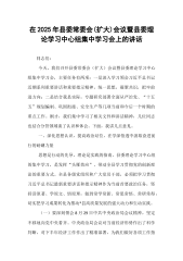 在2025年县委常委会(扩大)会议暨县委理论学习中心组集中学习会上的讲话同志们:今天,我们召开县委常委会(扩大)会议暨县委理论学习中心组集中学习会,主要任务有两项:一是深入学习领会习近平总书记近期系列重要讲话和重要指示精神,统一思想,凝聚共识,把牢前进方向;二是结合我县实际,专题研究部署全面从严治党、“十五五”规划编制、巩固衔接、安全生产等几项当前和今后一个时期的重点工作。刚才,我们集中学习了相关文件和讲话精神,几位同志也结合分管领域谈了认识和体会。下面,我讲几点意见。一、深化思想认识,提高政治站位,在学深悟透中汲取奋进前行的磅礴力量思想是行动的先导,理论是实践的指南。县委理论学习中心组的集中学习,是发挥“头雁效应”、带动全县学习贯彻党的创新理论的重要方式。全县各级党组织和广大党员干部,必须...