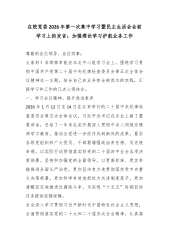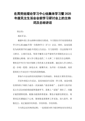 在局党组理论学习中心组集体学习暨2025年度民主生活会会前学习研讨会上的主持词及总结讲话同志们:现在开会。根据年度工作安排和市委有关要求,今天我们召开局党组理论学习中心组2026年第一次集体学习(扩大)会议,同时,这也是我们为高质量开好2025年度民主生活会,专门组织的一次会前集中学习研讨。主要任务是,坚持不懈用习近平新时代中国特色社会主义思想凝心铸魂,深入学习领会党的二十大和二十届历次全会精神,聚焦党中央关于医疗保障工作的重大决策部署,通过深入学习研讨,进一步统一思想、深化认识、凝聚共识,为开好一次高标准、高质量的民主生活会打下坚实的思想基础。参加今天会议的有局党组班子全体成员、各处室主要负责同志。开好年度民主生活会,是党内政治生活的一件大事,也是对我们领导班子和班子成员一次深刻的“政治体...