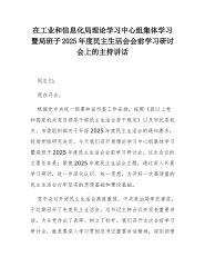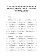 在市政府办公室理论学习中心组集体学习暨市政府办公室班子2025年度民主生活会会前学习研讨会上的讲话同志们:现在开会。根据中央、省委和市委的统一部署,以及市政府党组的具体安排,今天我们召开市政府办公室理论学习中心组集体学习暨办公室班子2025年度民主生活会会前学习研讨会。这次会议的主要任务是:聚焦民主生活会主题通过深入系统的学习研讨,进一步统一思想、深化认识、打牢基础,为高标准、高质量开好市政府办公室班子2025年度民主生活会做好充分的思想准备和工作准备。开好年度民主生活会,是党内政治生活的一项重要内容,是检验主题教育成果、加强班子自身建设、推进自我革命的关键举措。高质量的会议,首先源于高质量的学习。只有学习深入到位,认识才能深刻透彻,查摆问题才能精准聚焦,批评与自我批评才能有的放矢,整改落实...