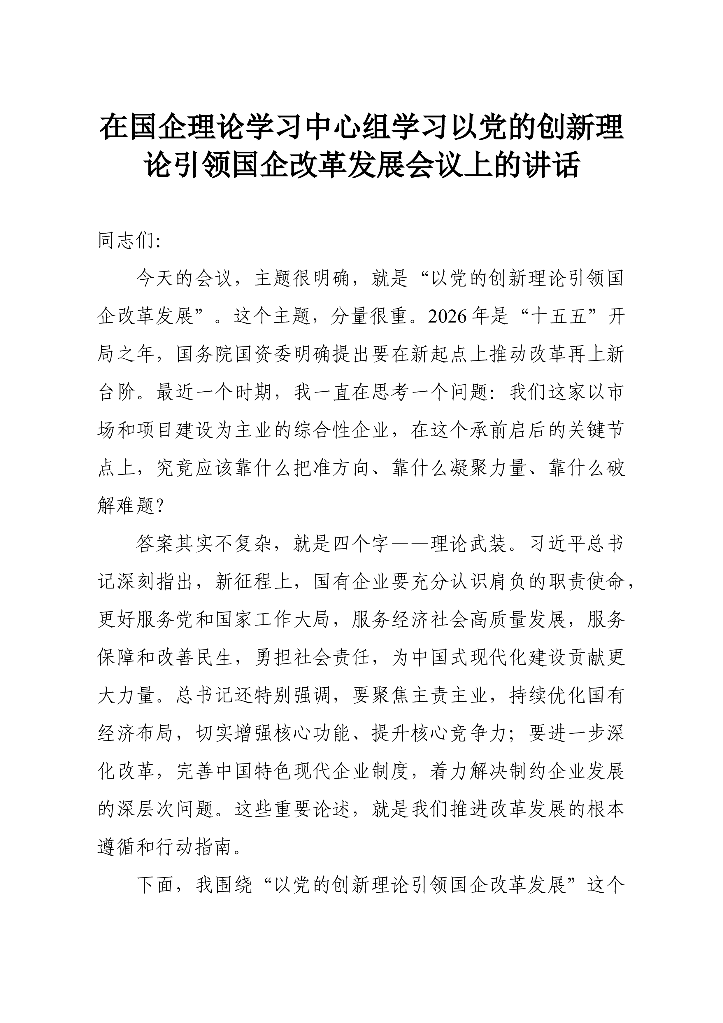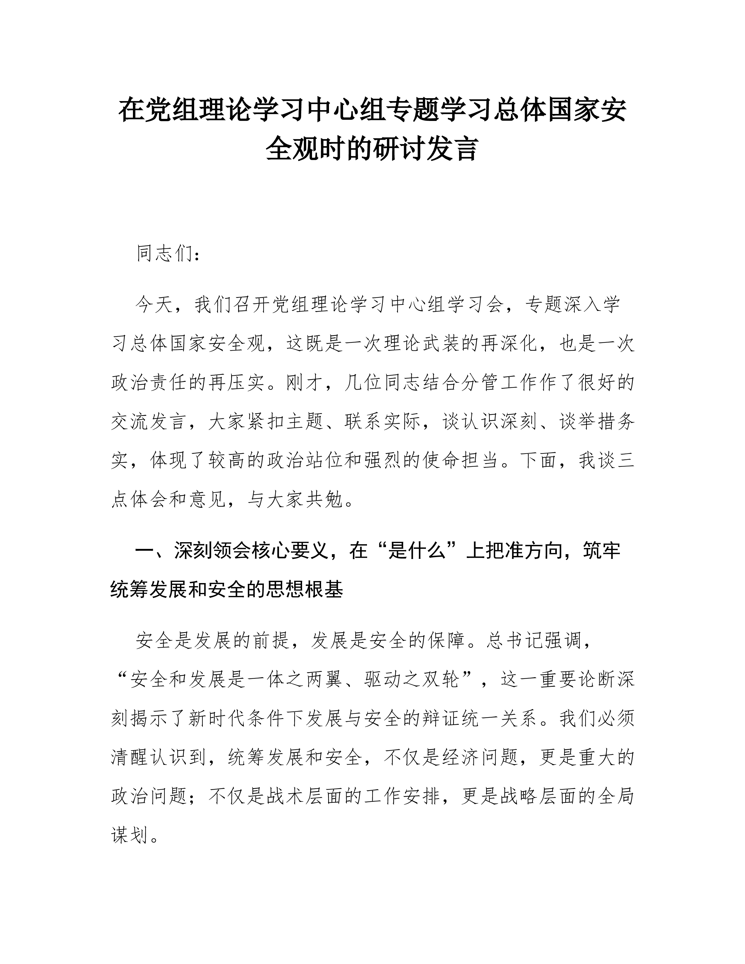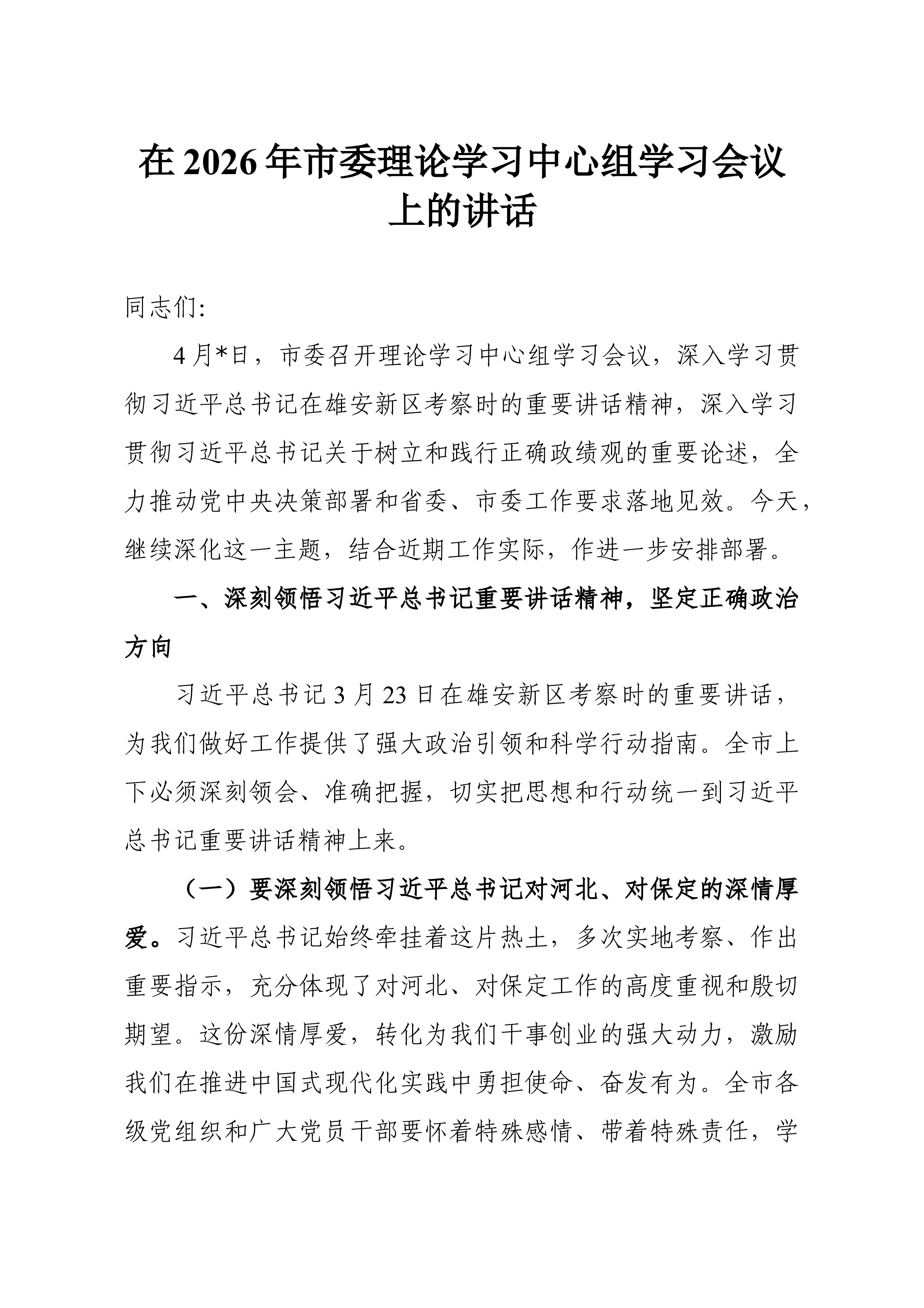在党委理论学习中心组学习习近平总书记视察雄安新区重要讲话精神时的研讨发言同志们:这次党委理论学习中心组围绕习近平总书记视察雄安新区重要讲话精神开展专题学习研讨,主题重大、导向鲜明。总书记的重要讲话,立意高远、内涵深刻,既是对雄安新区建设发展的再部署、再推动,也为国有企业立足新发展阶段、贯彻新发展理念、融入新发展格局、推动高质量发展提供了重要遵循。特别是讲话中贯穿的战略眼光、改革精神、为民立场和务实要求,对我们进一步认清职责使命、找准工作落点、改进工作作风,具有很强的现实指导意义。结合学习体会和企业实际,我谈三点认识。一、读懂战略考量,认清职责方位雄安新区之所以牵动全局,是因为它承载的是国家战略,检验的是政治担当,体现的是发展导向。学习总书记重要讲话精神,首先要解决的不是“怎么看雄安”,而是“...
