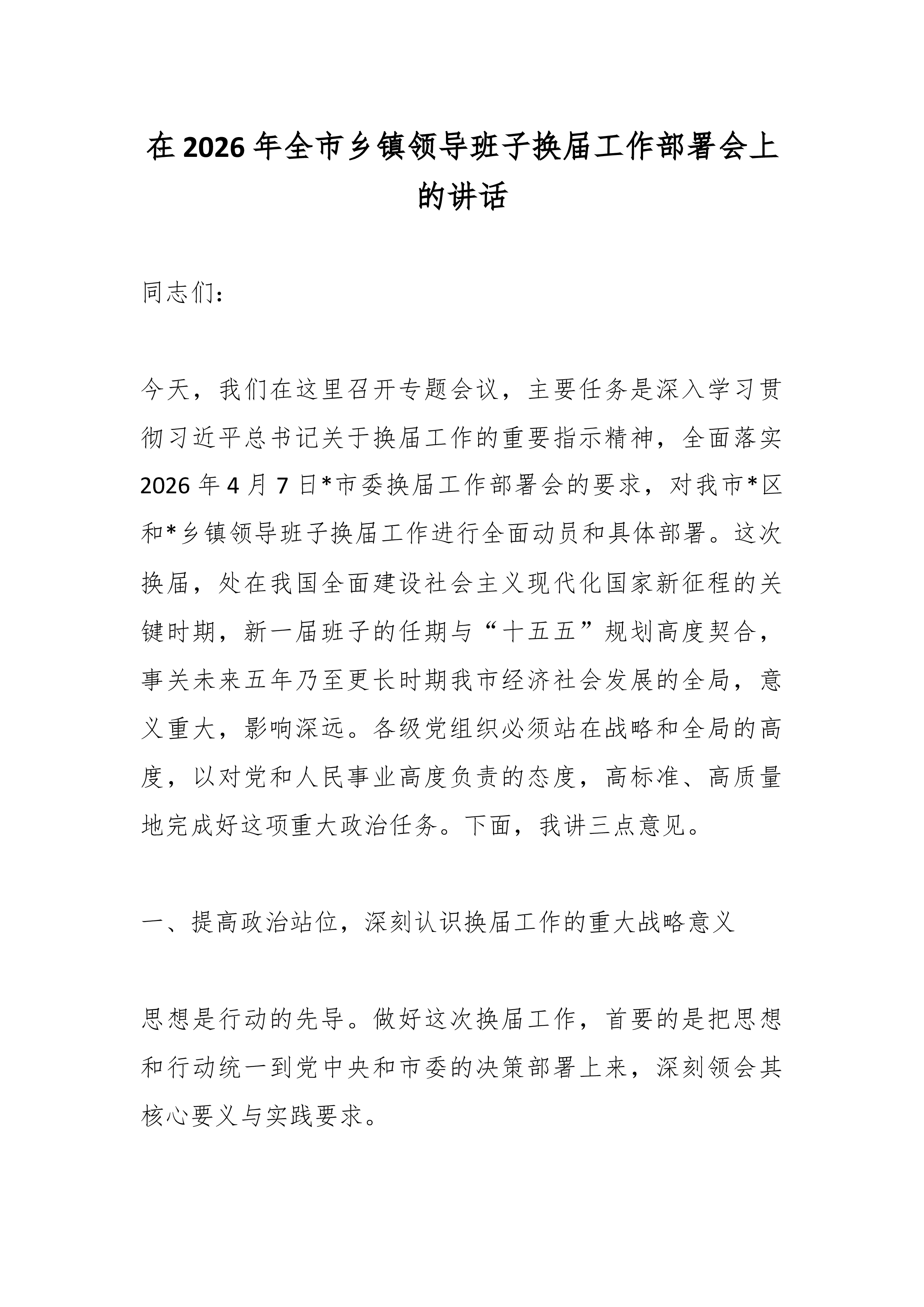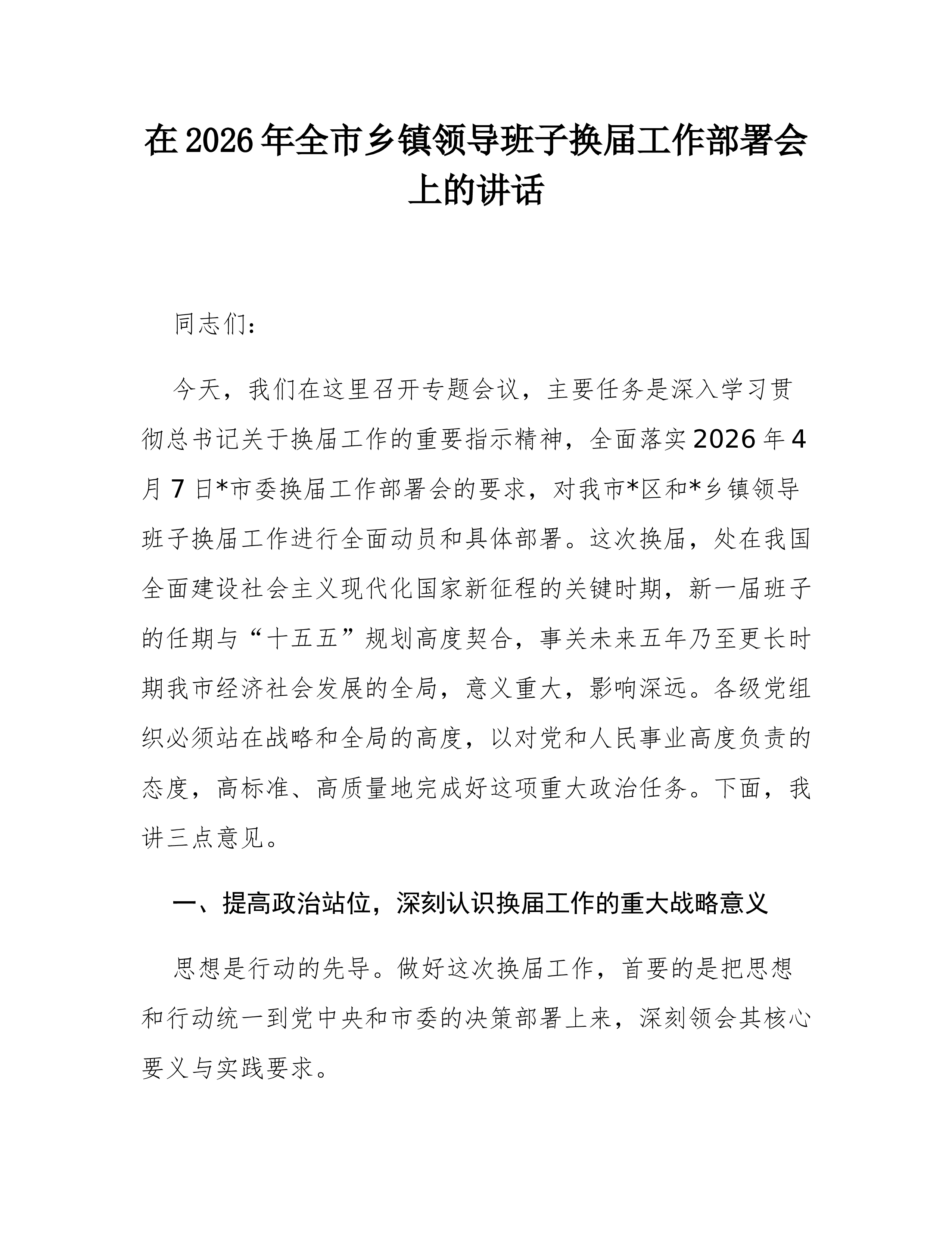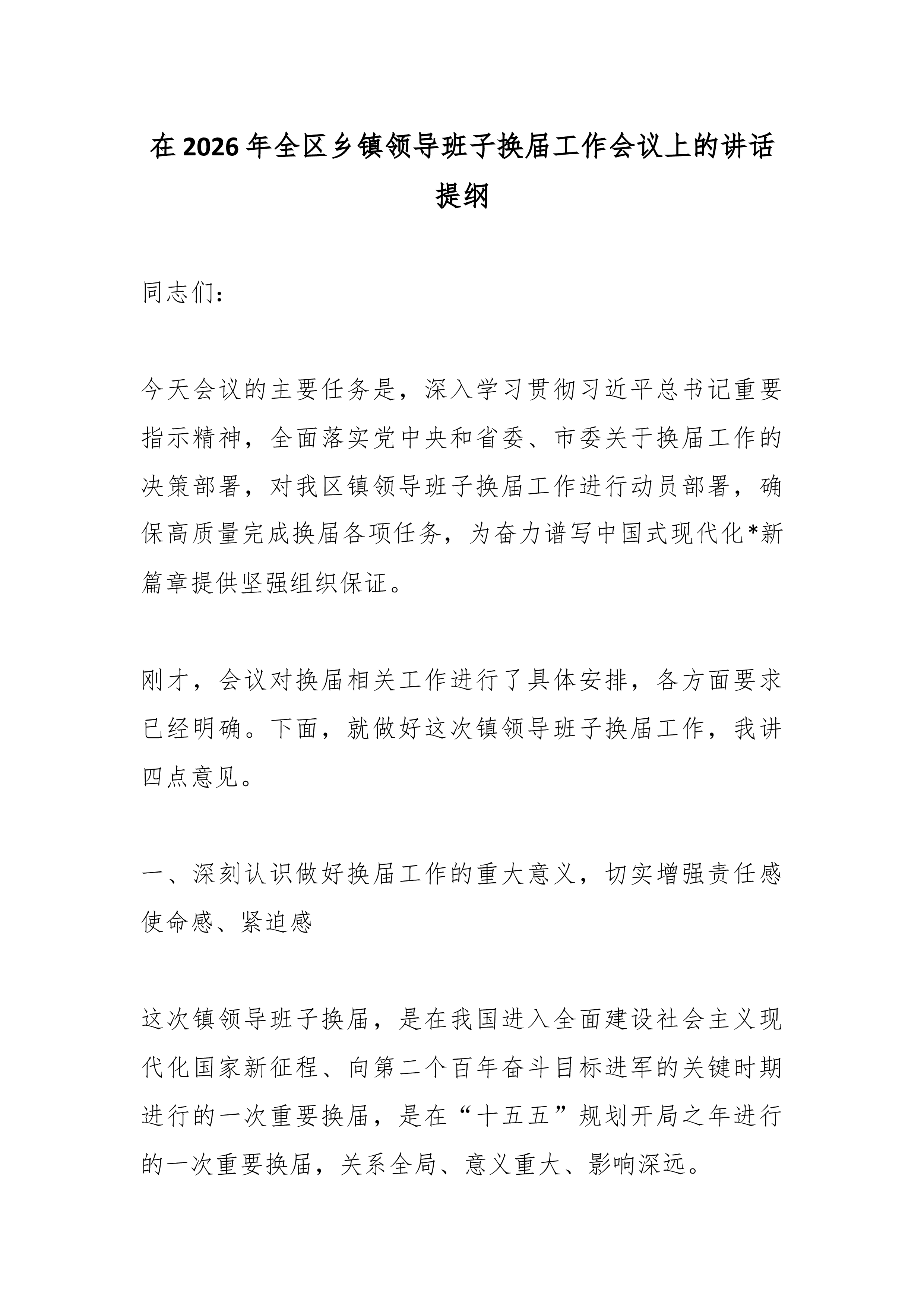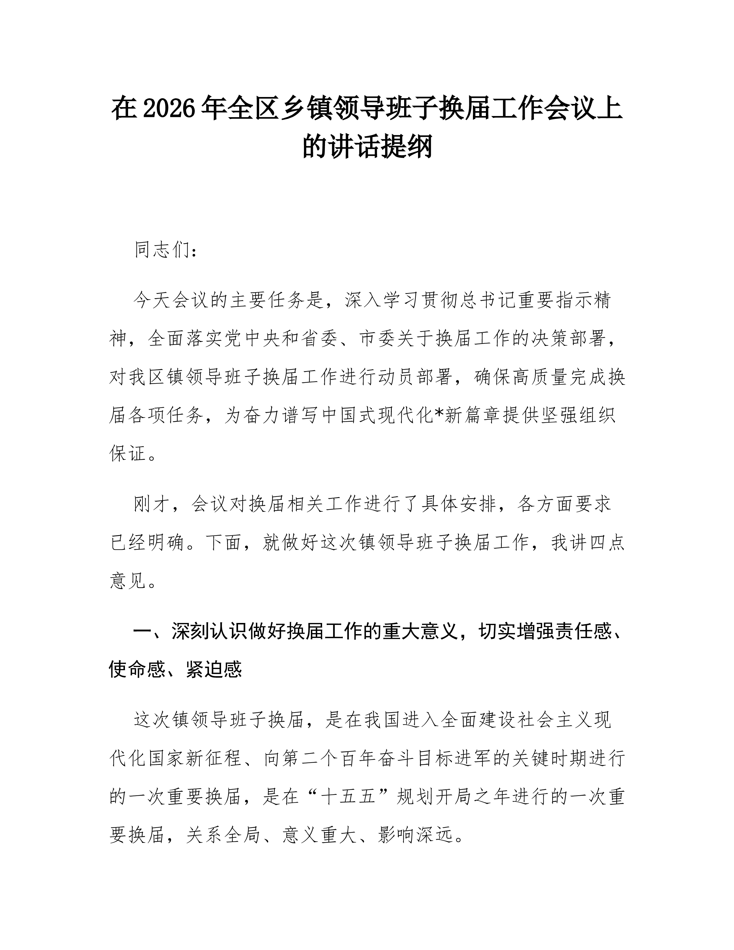 在2026年全区乡镇领导班子换届工作会议上的讲话提纲同志们:今天会议的主要任务是,深入学习贯彻习近平总书记重要指示精神,全面落实党中央和省委、市委关于换届工作的决策部署,对我区镇领导班子换届工作进行动员部署,确保高质量完成换届各项任务,为奋力谱写中国式现代化*新篇章提供坚强组织保证。刚才,会议对换届相关工作进行了具体安排,各方面要求已经明确。下面,就做好这次镇领导班子换届工作,我讲四点意见。一、深刻认识做好换届工作的重大意义,切实增强责任感使命感、紧迫感这次镇领导班子换届,是在我国进入全面建设社会主义现代化国家新征程、向第二个百年奋斗目标进军的关键时期进行的一次重要换届,是在“十五五”规划开局之年进行的一次重要换届,关系全局、意义重大、影响深远。(一)做好换届工作是加强党的全面领导、夯实执政...