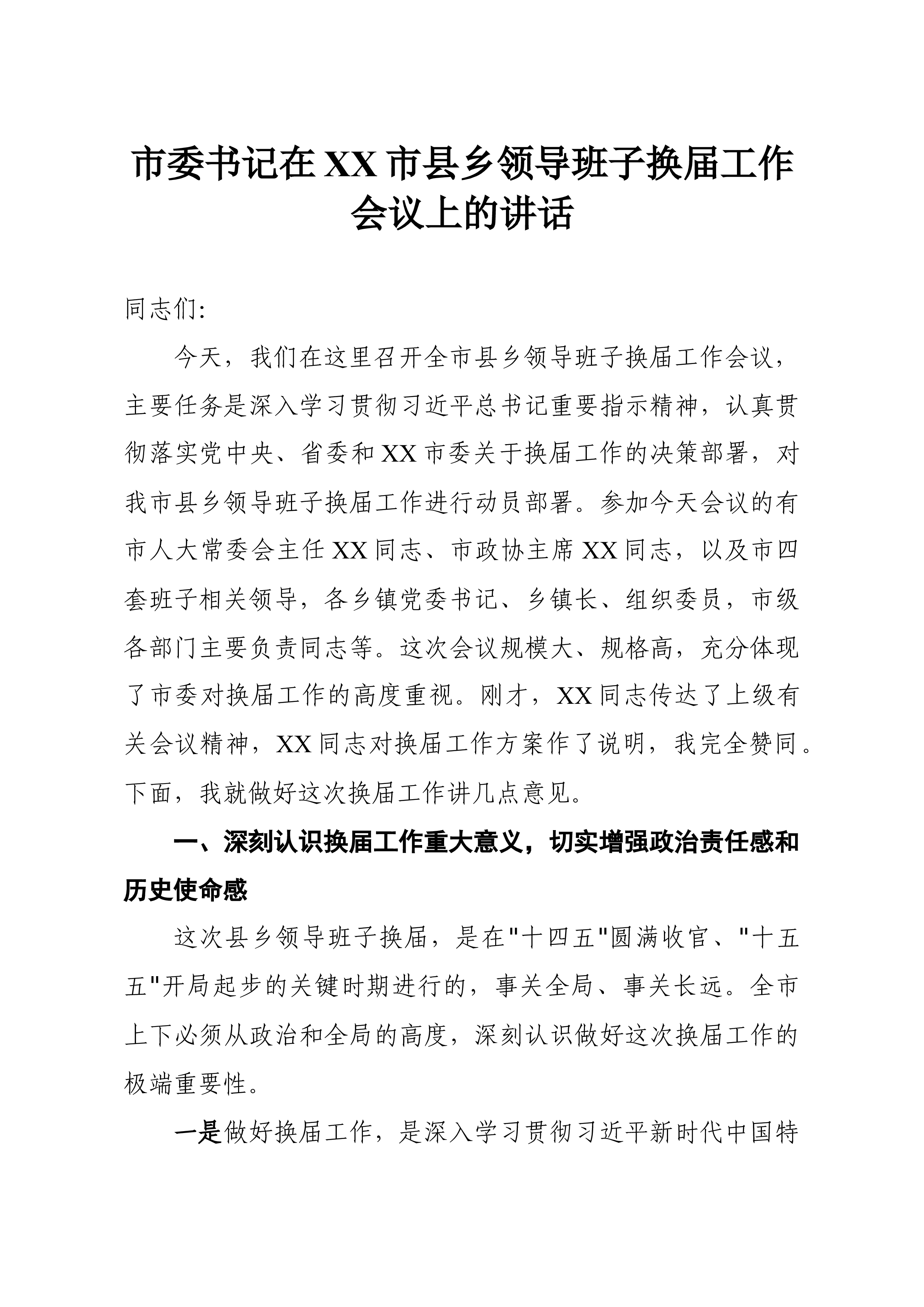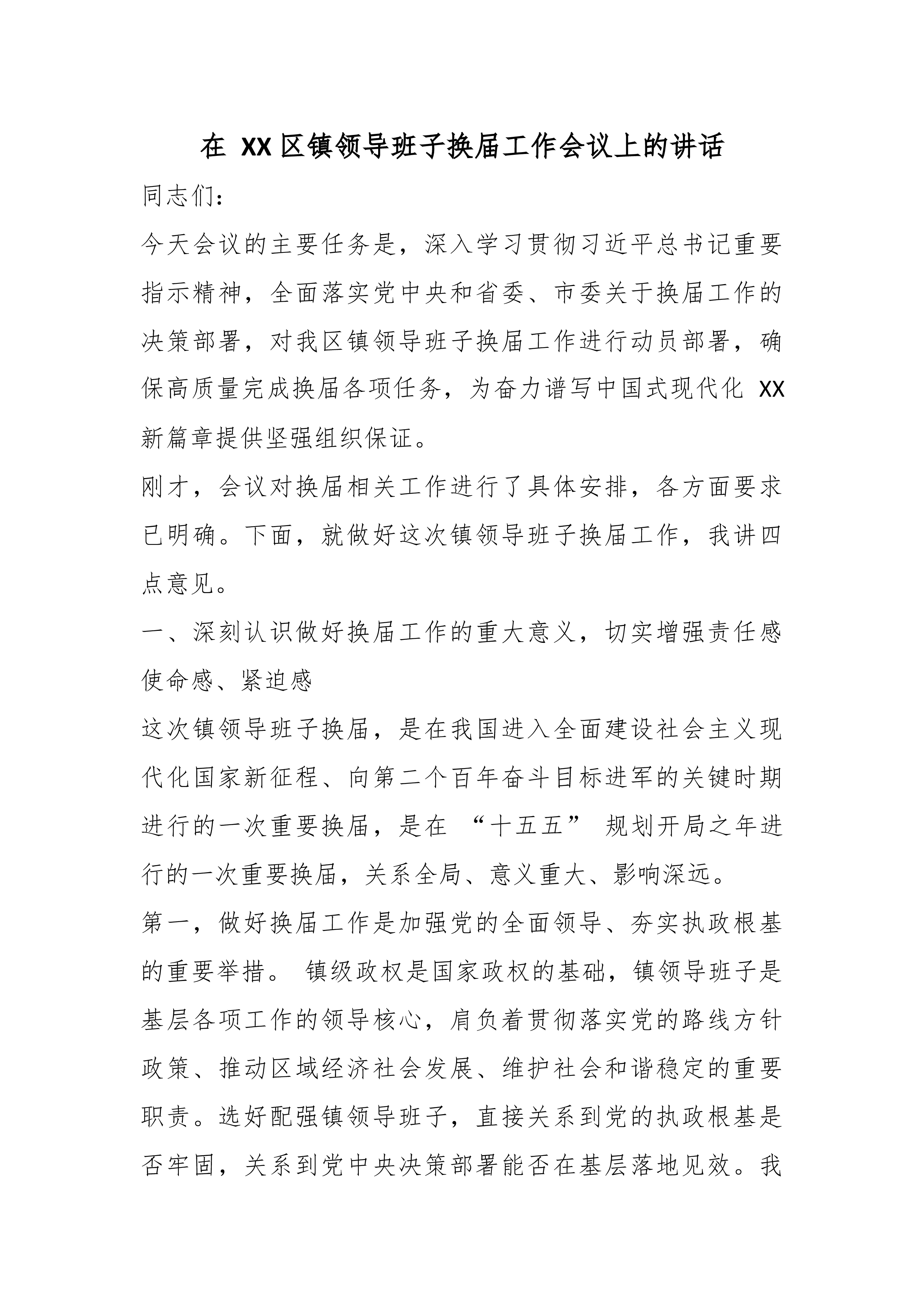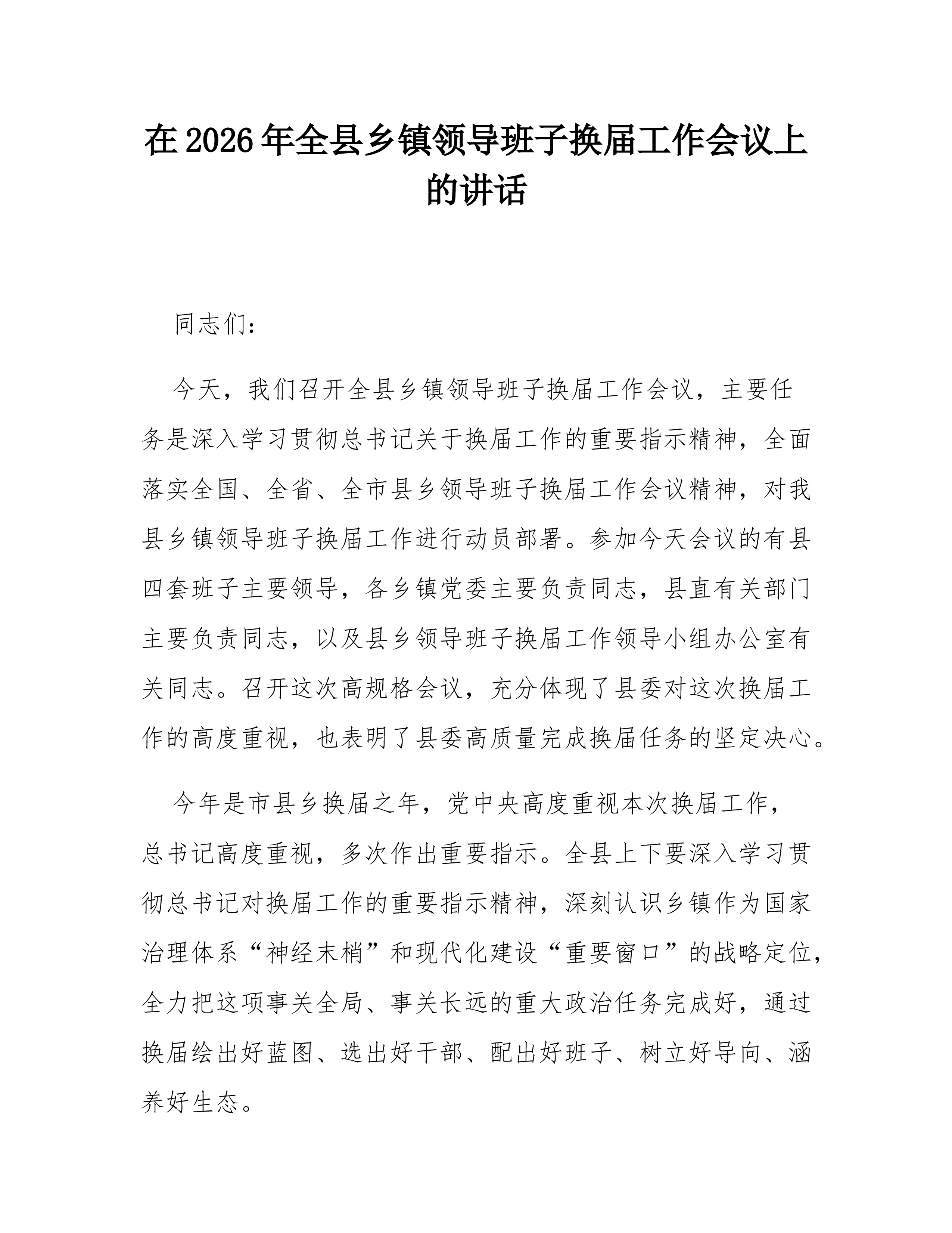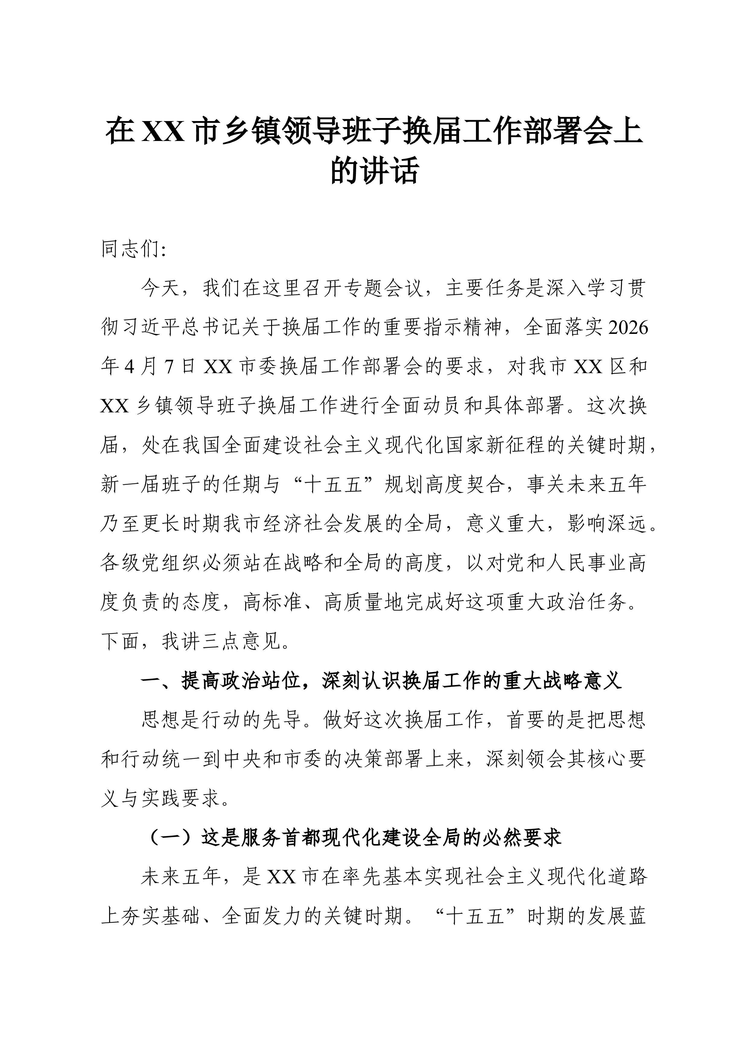 在2026年全区乡镇领导班子换届工作会议上的讲话提纲同志们:今天会议的主要任务是,深入学习贯彻习近平总书记重要指示精神,全面落实党中央和省委、市委关于换届工作的决策部署,对我区镇领导班子换届工作进行动员部署,确保高质量完成换届各项任务,为奋力谱写中国式现代化*新篇章提供坚强组织保证。刚才,会议对换届相关工作进行了具体安排,各方面要求已经明确。下面,就做好这次镇领导班子换届工作,我讲四点意见。一、深刻认识做好换届工作的重大意义,切实增强责任感使命感、紧迫感这次镇领导班子换届,是在我国进入全面建设社会主义现代化国家新征程、向第二个百年奋斗目标进军的关键时期进行的一次重要换届,是在“十五五”规划开局之年进行的一次重要换届,关系全局、意义重大、影响深远。(一)做好换届工作是加强党的全面领导、夯实执政...