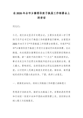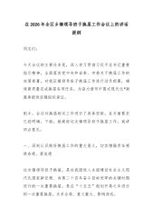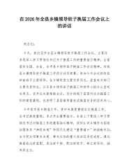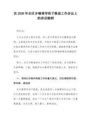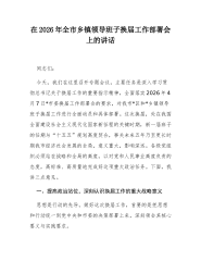 在2026年全区乡镇领导班子换届工作会议上的讲话提纲同志们:今天会议的主要任务是,深入学习贯彻习近平总书记重要指示精神,全面落实党中央和省委、市委关于换届工作的决策部署,对我区镇领导班子换届工作进行动员部署,确保高质量完成换届各项任务,为奋力谱写中国式现代化*新篇章提供坚强组织保证。刚才,会议对换届相关工作进行了具体安排,各方面要求已经明确。下面,就做好这次镇领导班子换届工作,我讲四点意见。一、深刻认识做好换届工作的重大意义,切实增强责任感使命感、紧迫感这次镇领导班子换届,是在我国进入全面建设社会主义现代化国家新征程、向第二个百年奋斗目标进军的关键时期进行的一次重要换届,是在“十五五”规划开局之年进行的一次重要换届,关系全局、意义重大、影响深远。(一)做好换届工作是加强党的全面领导、夯实执政...