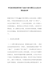 镇党委领导班子关于2025年度民主生活会对照检视发言材料(五个带头)根据上级统一部署和要求,镇党委紧扣“深入学习贯彻习近平新时代中国特色社会主义思想,全面贯彻落实党的二十届四中全会精神,锲而不舍落实中央八项规定精神,推进作风建设常态化长效化”主题,扎实做好民主生活会会前各项准备工作。班子成员聚焦会议主题,通过“线上+线下”结合方式,系统学习了党的创新理论、党章党规党纪及中央关于作风建设的最新精神,累计开展专题学习研讨12次,覆盖党员干部800余人次,为对照检视筑牢思想根基。坚持开门纳谏,通过座谈访谈、设置意见箱、入户走访等形式,广泛征求各村(社区)、镇直单位、企业及党员群众意见建议,共收回有效意见表215份,梳理整合意见建议7大类43条。班子成员之间、班子成员与分管部门负责同志之间深入开展了...