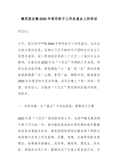 镇党委在XX镇2026年领导班子工作务虚会上的讲话同志们:今天,我们召开XX镇2026年领导班子工作务虚会。这次会议的主要任务是,坚持以习近平新时代中国特色社会主义思想为指导,深入贯彻落实党的二十大及二十届历次全会精神,全面总结2025年及“十四五”时期的工作成效,科学分析当前形势,紧紧围绕“以‘虚’促‘实’谋划发展绘就新图景”这一主题,集思广益、凝聚共识,精准谋划2026年发展目标与任务举措,动员全镇上下进一步统一思想、坚定信心,为推动“十五五”规划顺利实施开好局、起好步。一、回首来路,在“盘点”中总结经验,凝聚前行力量2025年是“十四五”规划的收官之年,也是XX镇发展进程中极不平凡的一年。面对错综复杂的外部环境和艰巨繁重的改革发展稳定任务,镇党委团结带领全镇各族干部群众,坚持稳中求进工...