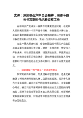 今年X月*日,习近平总书记在省部级主要领导干部学习贯彻党的十九届六中全会精神专题研讨班开班式上发表重要讲话,强调继续把党史总结、学习、教育、宣传引向深入,更好把握和运用党的百年奋斗历史经验。我们要深入学习、全面领会,切实把思想和行动统一到习近平总书记重要讲话精神上来,坚决拥护“两个确立”,增强“四个意识”、坚定“四个自信”、做到“两个维护”。一、锤炼绝对忠诚的政治品格,做“两个确立”的坚定捍卫者、践行者习近平总书记的重要讲话,立意高远、思想深邃,为我们深入学习贯彻党的十九届六中全会精神,更好把握和运用党的百年奋斗历史经验,走好新的赶考之路提供了强大指引。要把习近平总书记关于党的历史和党史学习教...