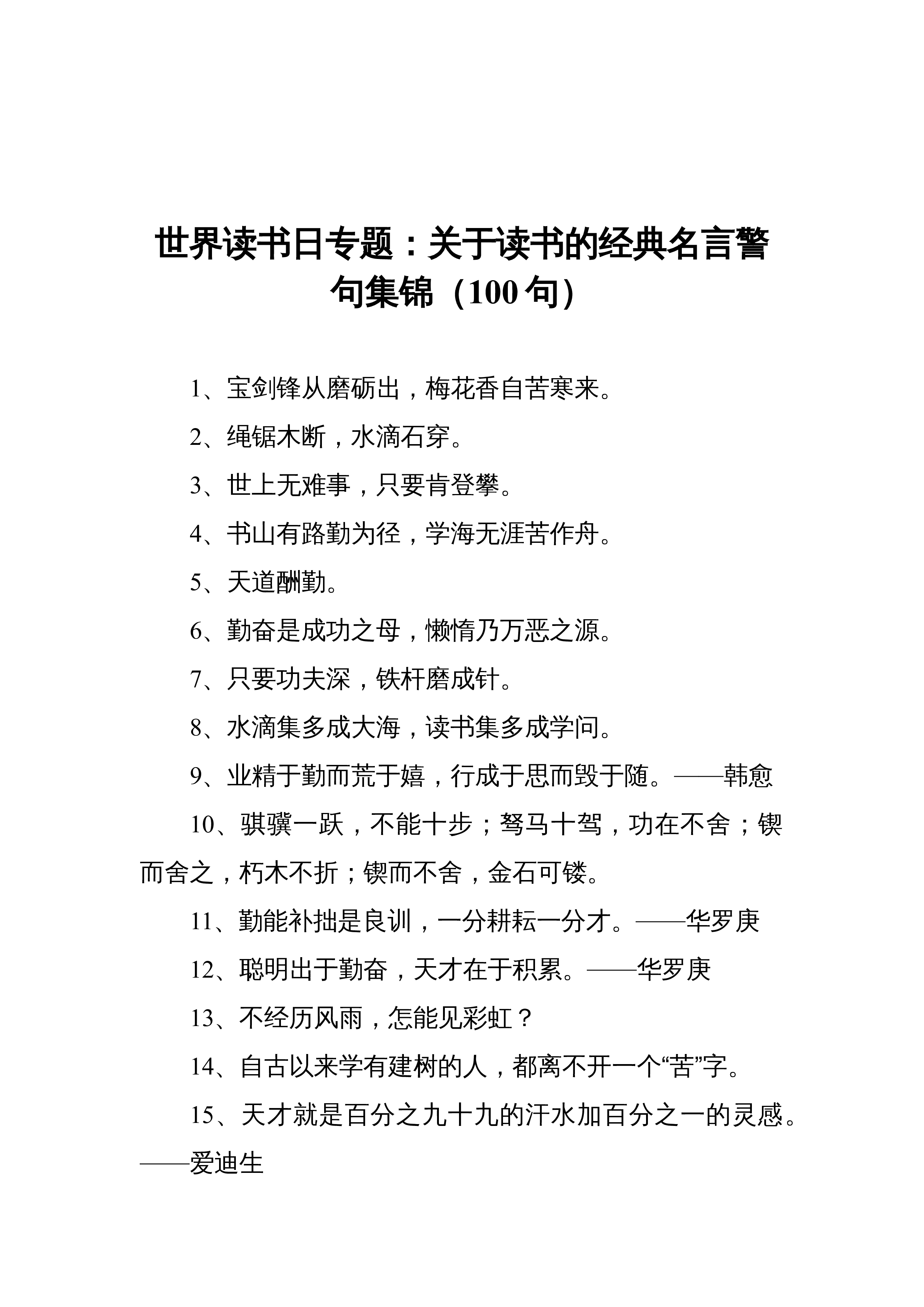 世界读书日专题:关于读书的经典名言警句集锦(100句)1、宝剑锋从磨砺出,梅花香自苦寒来。2、绳锯木断,水滴石穿。3、世上无难事,只要肯登攀。4、书山有路勤为径,学海无涯苦作舟。5、天道酬勤。6、勤奋是成功之母,懒惰乃万恶之源。7、只要功夫深,铁杆磨成针。8、水滴集多成大海,读书集多成学问。9、业精于勤而荒于嬉,行成于思而毁于随。——韩愈10、骐骥一跃,不能十步;驽马十驾,功在不舍;锲而舍之,朽木不折;锲而不舍,金石可镂。11、勤能补拙是良训,一分耕耘一分才。——华罗庚12、聪明出于勤奋,天才在于积累。——华罗庚13、不经历风雨,怎能见彩虹?14、自古以来学有建树的人,都离不开一个“苦”字。...