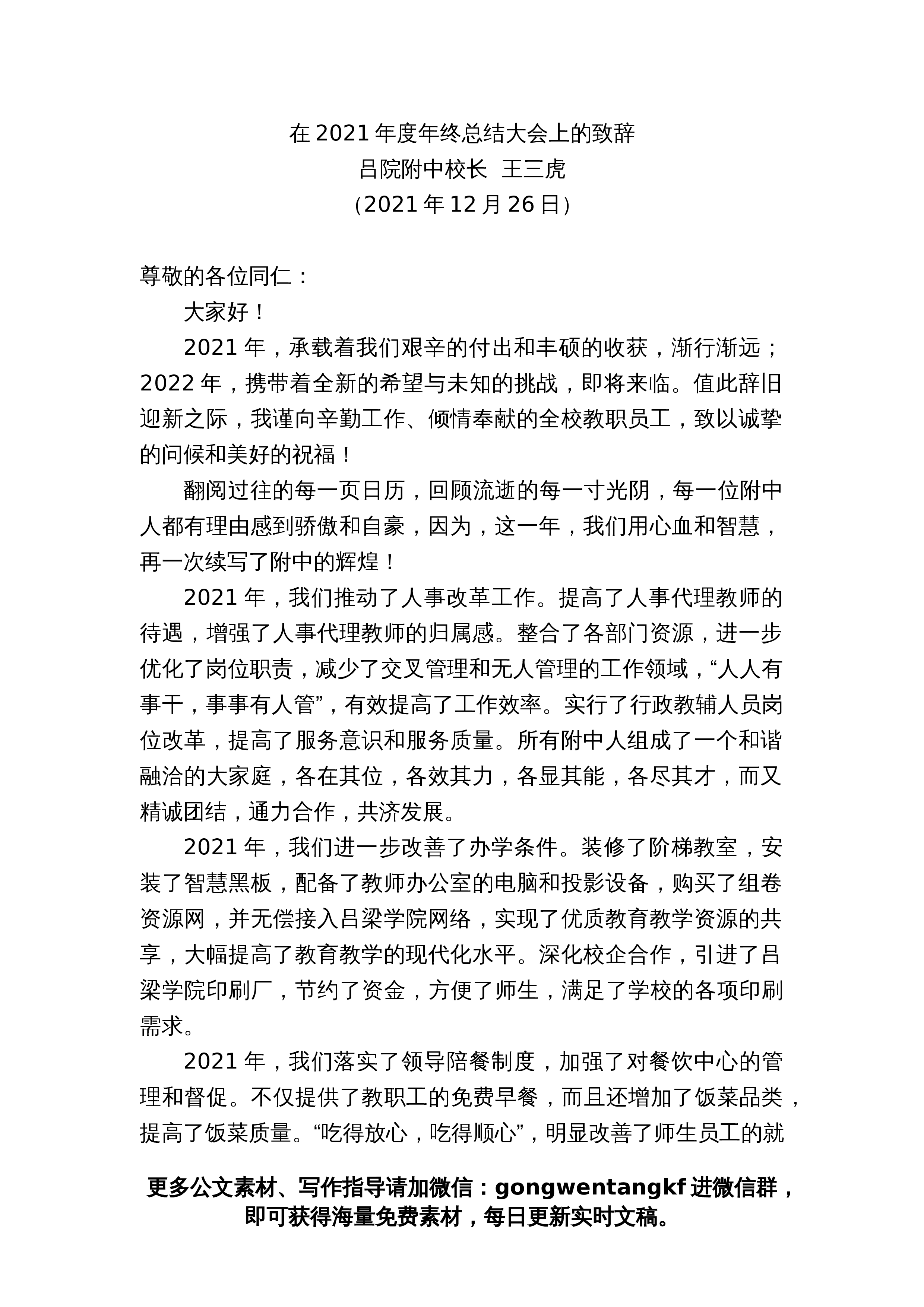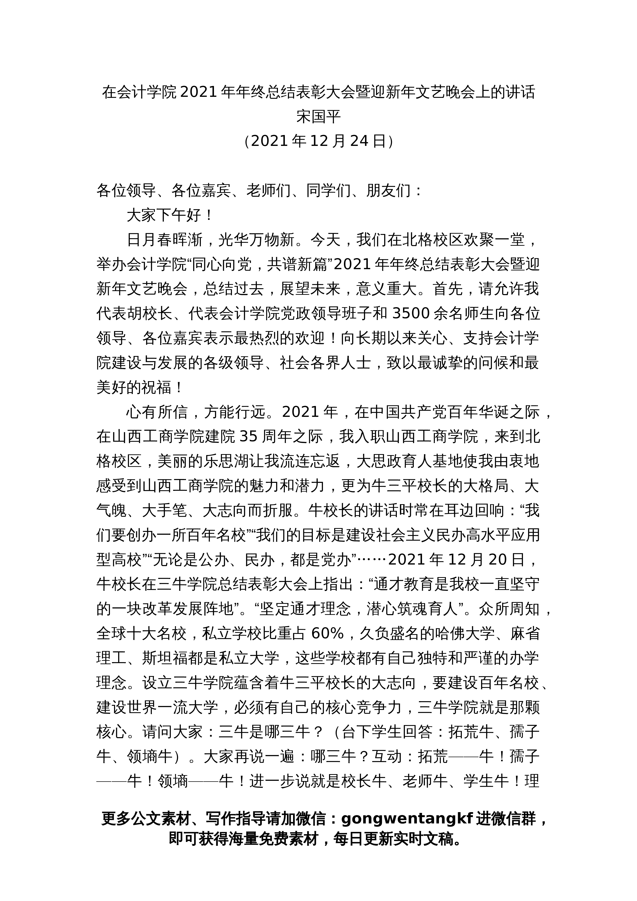 在会计学院2021年年终总结表彰大会暨迎新年文艺晚会上的讲话宋国平(2021年12月24日)各位领导、各位嘉宾、老师们、同学们、朋友们:大家下午好!日月春晖渐,光华万物新。今天,我们在北格校区欢聚一堂,举办会计学院“同心向党,共谱新篇”2021年年终总结表彰大会暨迎新年文艺晚会,总结过去,展望未来,意义重大。首先,请允许我代表胡校长、代表会计学院党政领导班子和3500余名师生向各位领导、各位嘉宾表示最热烈的欢迎!向长期以来关心、支持会计学院建设与发展的各级领导、社会各界人士,致以最诚挚的问候和最美好的祝福!心有所信,方能行远。2021年,在中国共产党百年华诞之际,在山西工商学院建院35周年之际...