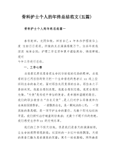 骨科护士个人的年终总结范文(五篇)骨科护士个人的年终总结篇一春秋轮回,光阴如梭,回首自己x年来在护理岗位上度过的日日夜夜,所做的点点滴滴感慨万千。这些年使我深深地体会到:护理工作在苦和累中描绘高尚、铸造辉煌。现对今年工作进行总结。一、工作心得当我看见那些患者把生命托付给我的无助的眼神,当我看到自己用百倍的努力把一个生命垂危的患者从xx线上拉回到生命的春天时,面对那些失而复得的生命,那些来之不易的欢笑,我就会感到欣慰,我就会感到无憾,我更会感到无悔。"天使"是传说中神仙的使者,是幸福和温暖的象征。我们的职业被誉为“白衣天使”,是人们对护士形象美和内在美的深情赞誉。一袭飘然白衣,是一颗纯洁的心灵;...
