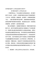 高中数学老师个人年终总结系列3000字高中数学老师个人年终总结篇1 一学期即将过去,可以说紧张忙碌而收获多多,高中数学教学工作总结。总体看,全体数学教师认真执行学校教育教学工作计划,转变思想,积极探索,改革教学,在继续推进我校“自主——创新”课堂教学模式的同时,把新课程标准的新思想、新理念和数学课堂教学的新思路、新设想结合起来,转变思想,积极探索,改革教学,收到很好的效果。 我们怎样教数学,《国家数学课程标准》对数学的教学内容,教学方式,教学评估教育价值观等多方面都提出了许多新的要求。无疑我们每位数学教师身置其中去迎接这种挑战,是我们每位教师必须重新思考的问题。开学初组织攻关教师和教研组长...