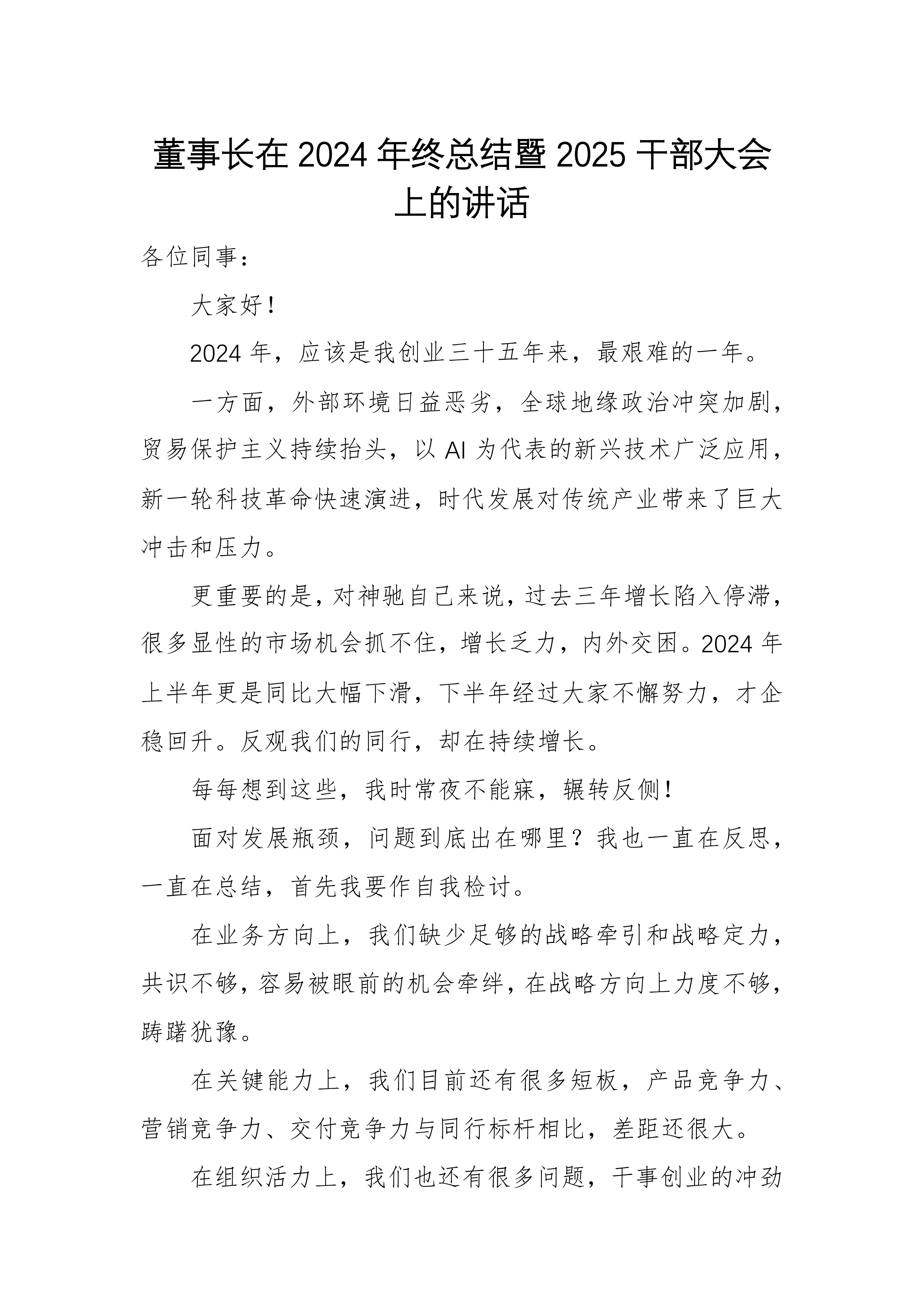 董事长在2024年终总结暨2025干部大会上的讲话各位同事:大家好!2024年,应该是我创业三十五年来,最艰难的一年。一方面,外部环境日益恶劣,全球地缘政治冲突加剧,贸易保护主义持续抬头,以AI为代表的新兴技术广泛应用,新一轮科技革命快速演进,时代发展对传统产业带来了巨大冲击和压力。更重要的是,对神驰自己来说,过去三年增长陷入停滞,很多显性的市场机会抓不住,增长乏力,内外交困。2024年上半年更是同比大幅下滑,下半年经过大家不懈努力,才企稳回升。反观我们的同行,却在持续增长。每每想到这些,我时常夜不能寐,辗转反侧!面对发展瓶颈,问题到底出在哪里?我也一直在反思,一直在总结,首先我要作自我检讨。...
